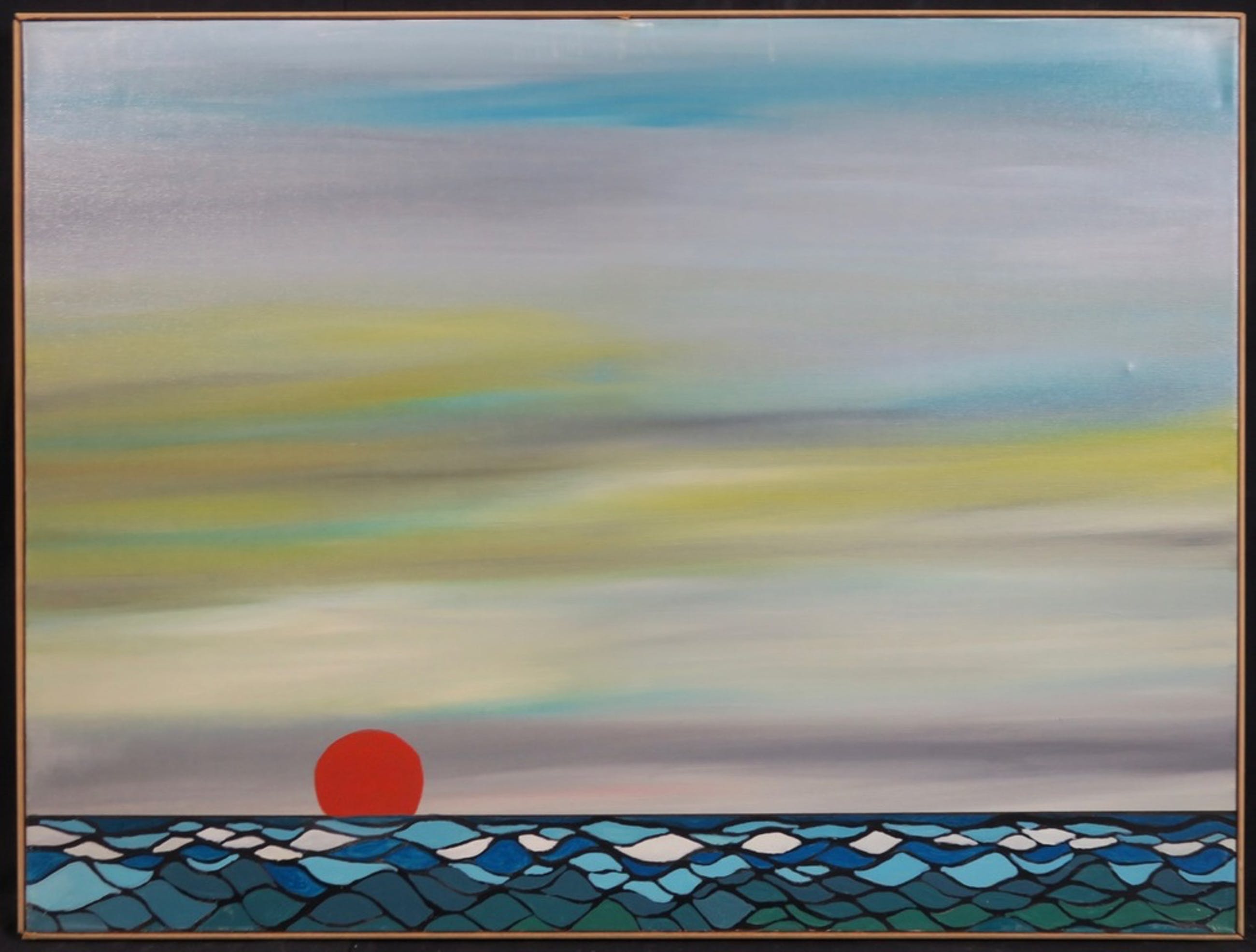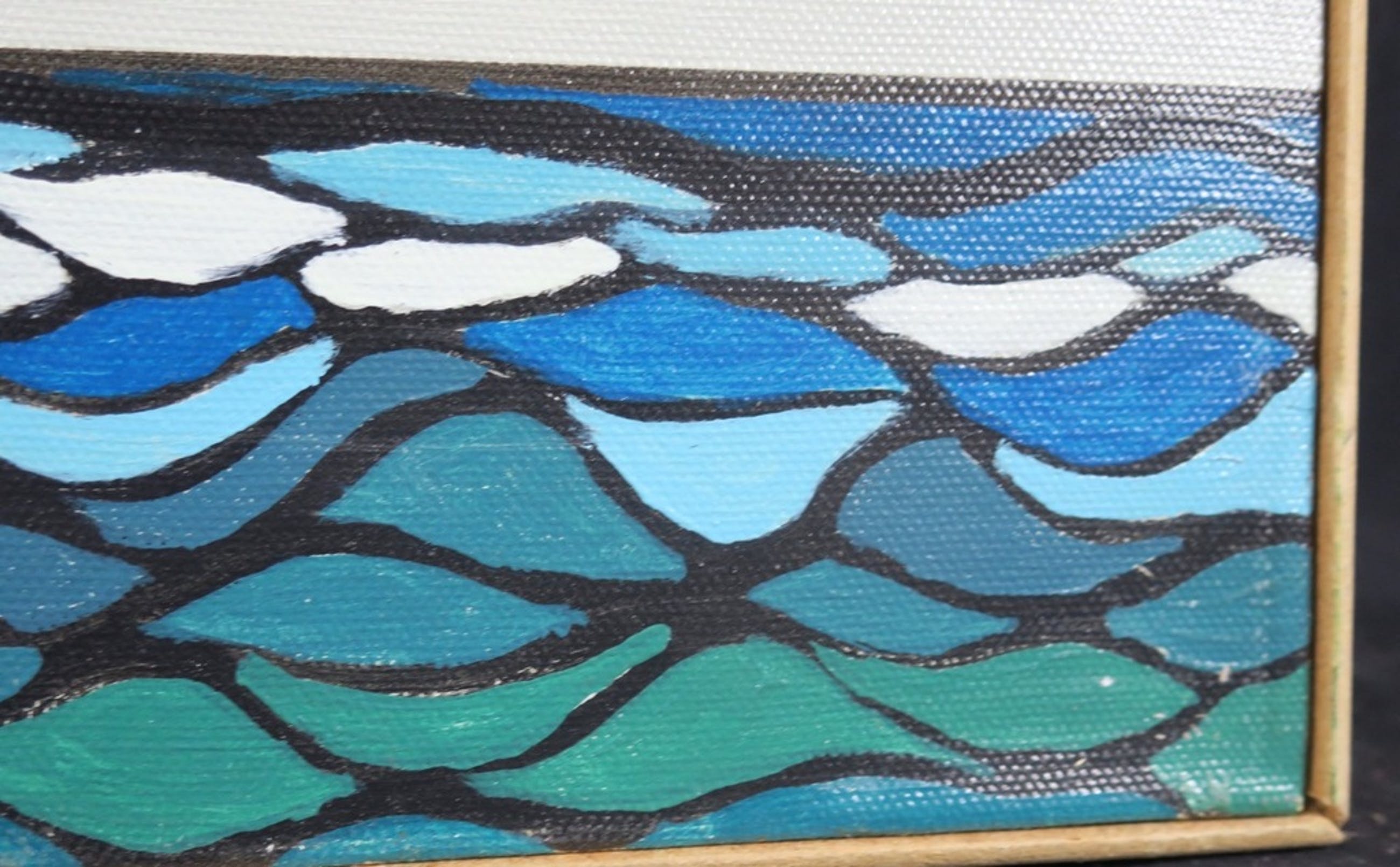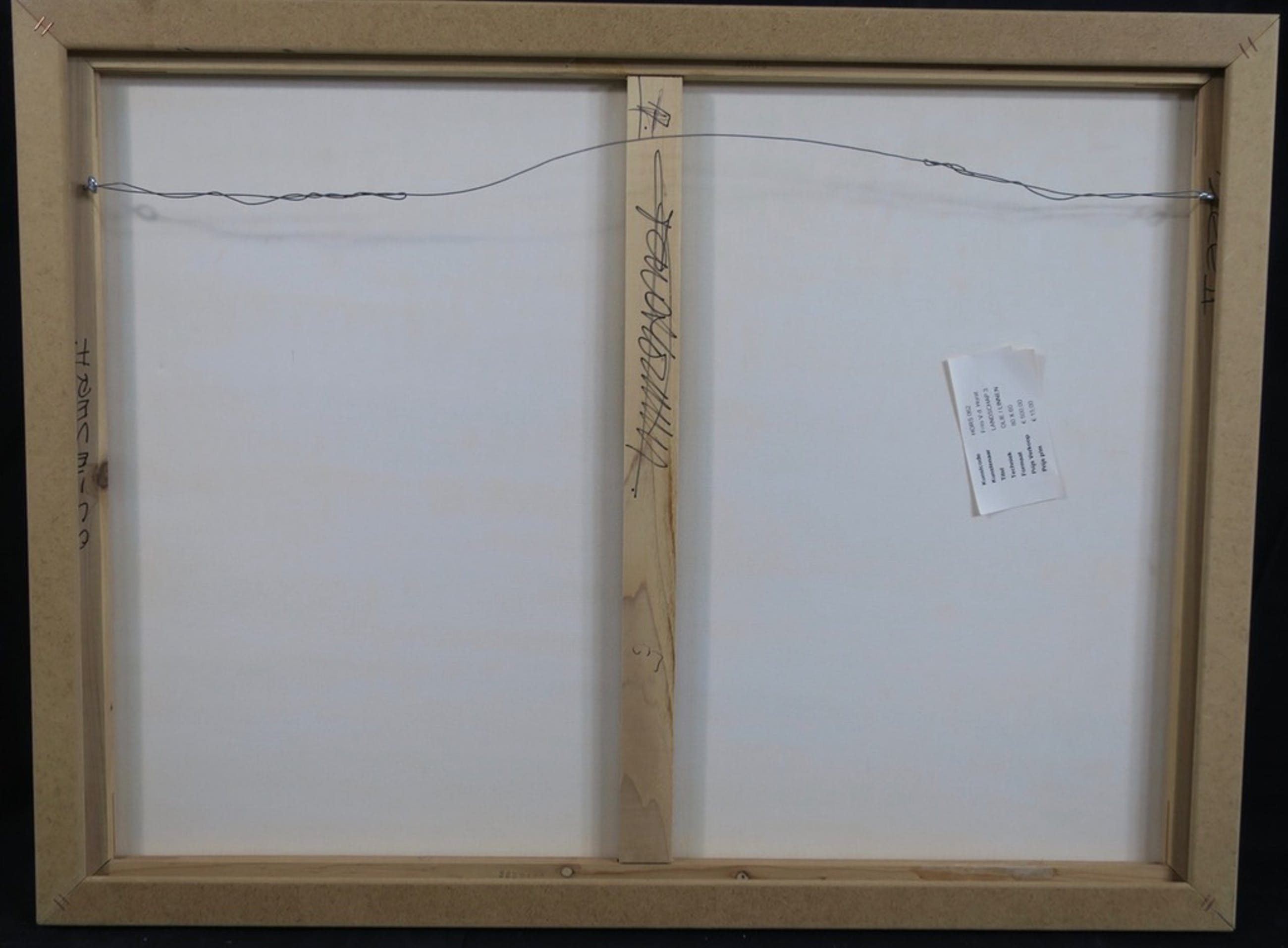 Conditie kunstwerk: In goede staat, maar met langs de randen van het doek, o.a. midden boven wat krasjes (zie foto) en een butsje in het doek rechtsmidden (zie foto)
