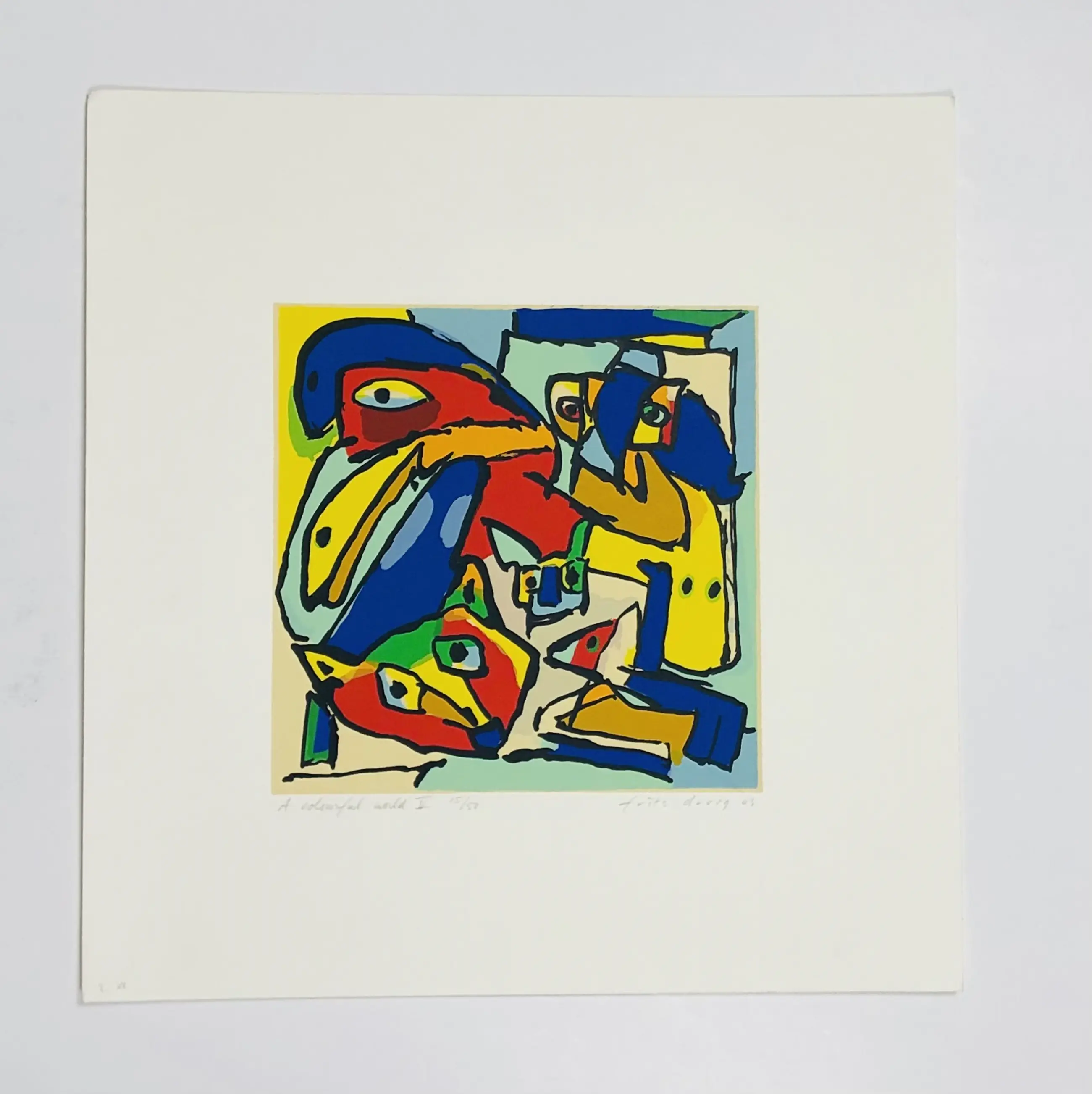 Mooi kleurrijke zeefruk van Frits Droog, zo goed als nieuw! let op uiteindelijke zeefdruk is ca 20 x 20 cm, papiermaat groter. Gesigneerd en genummerd. U kunt het werk vooraf komen beoordelen. Na aankoop kunt u uw werk laten opslaan in onze verwarmde depot. Ook kunnen wij uw inlijsting verzorgen.