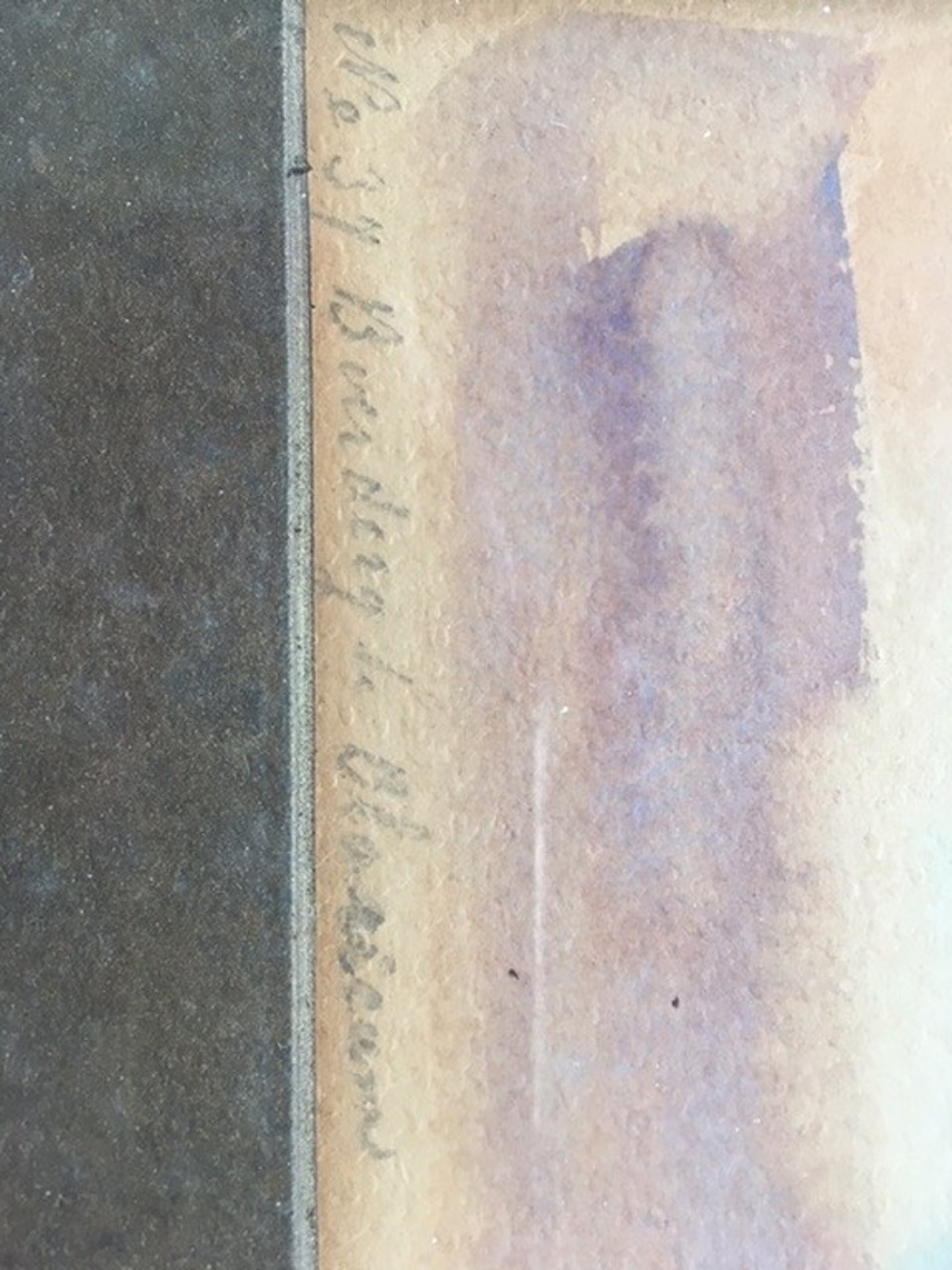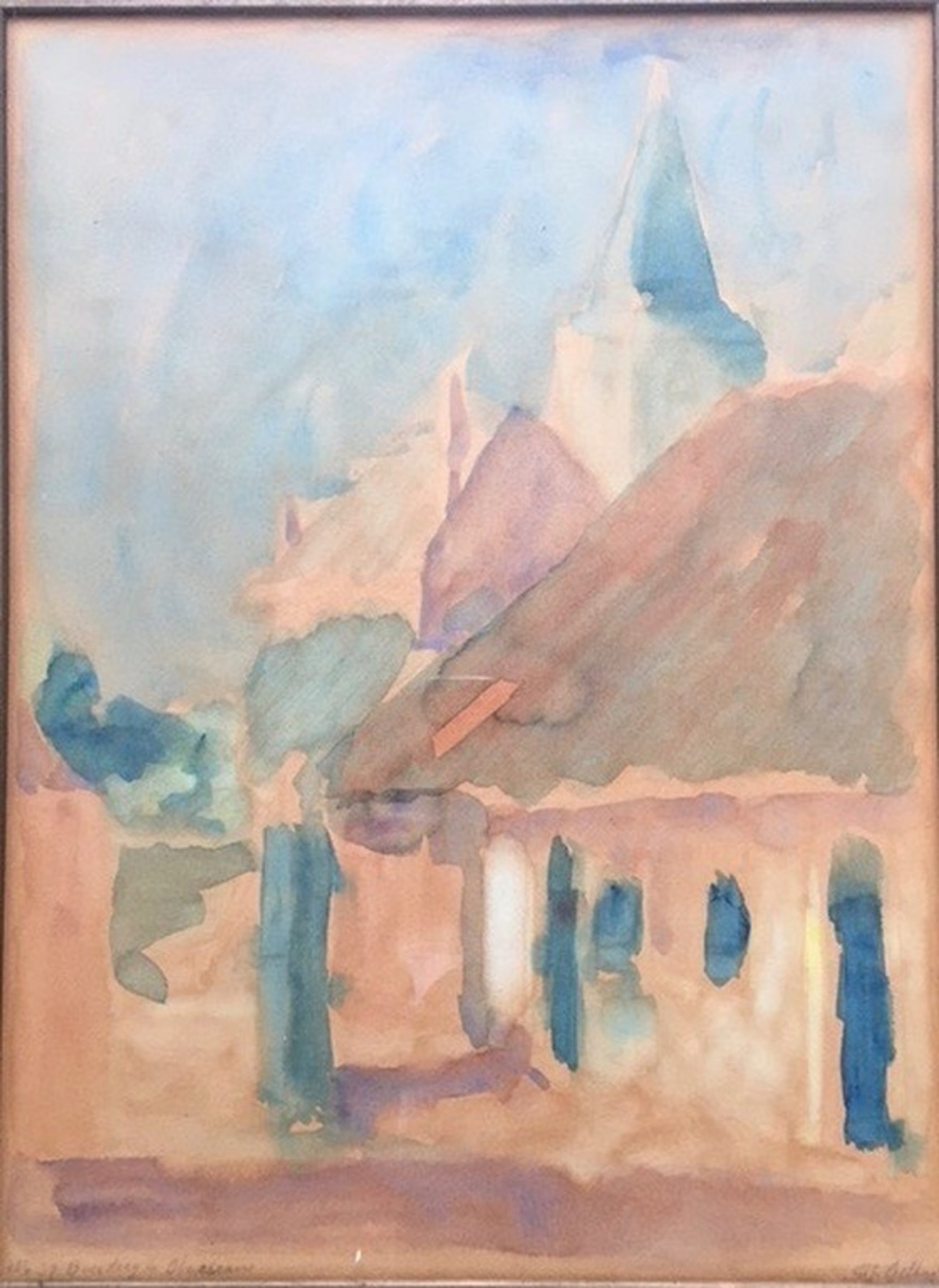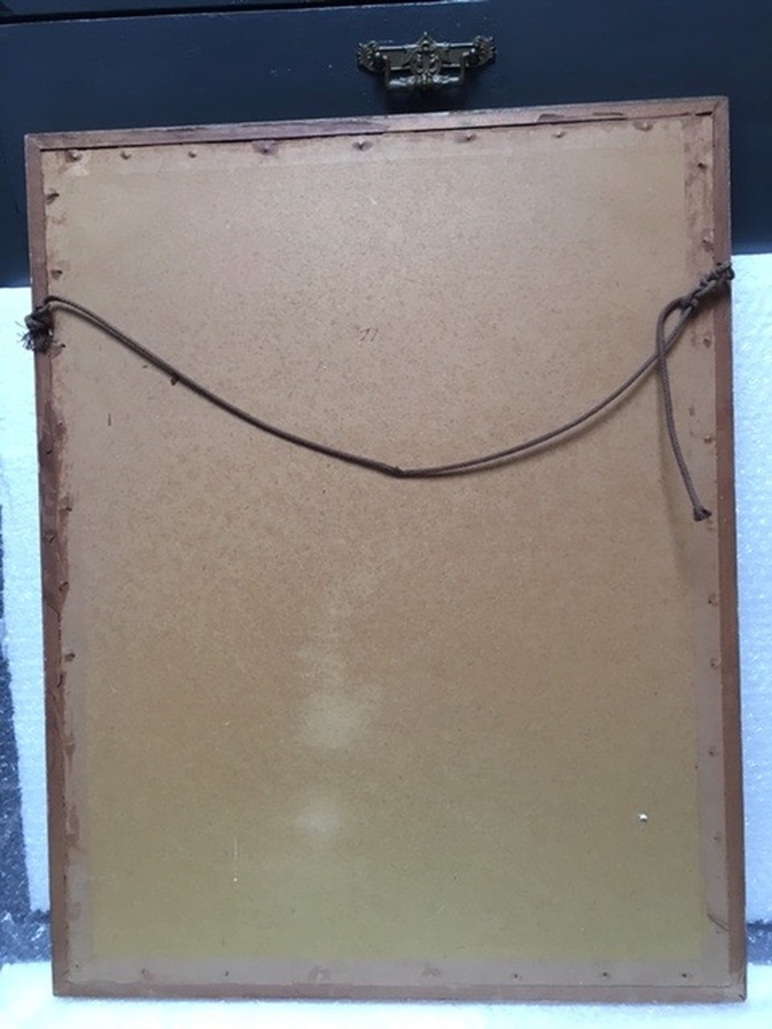 Aquarel is ingelijst achter glas en meet 63 x 49 cm (met lijst 67 x 53 cm). De lijst is fragiel en wat beschadigd.