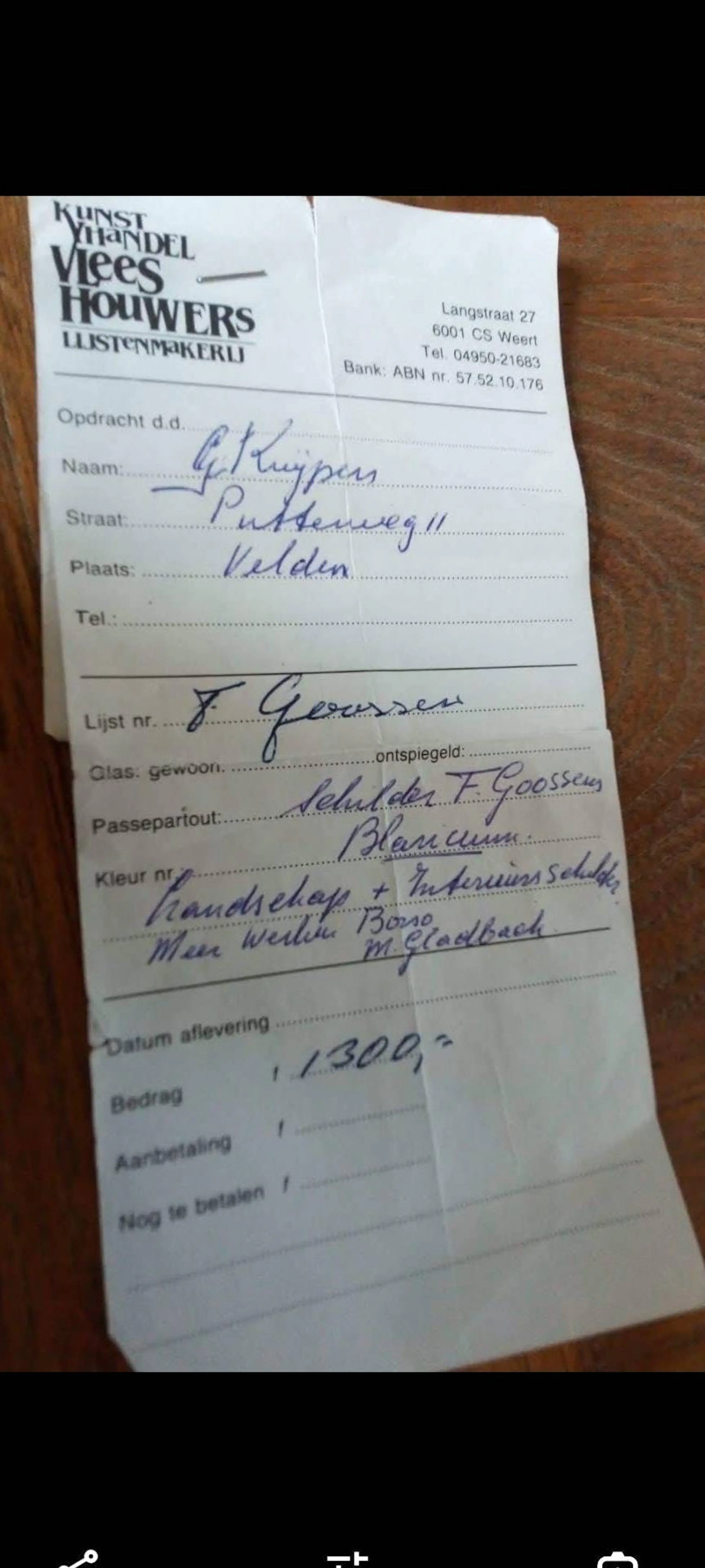 Het werk is af te halen op locatie. Als koper dient u zelf verpakkingsmateriaal mee te nemen. De locatie is: Velden, Nederland