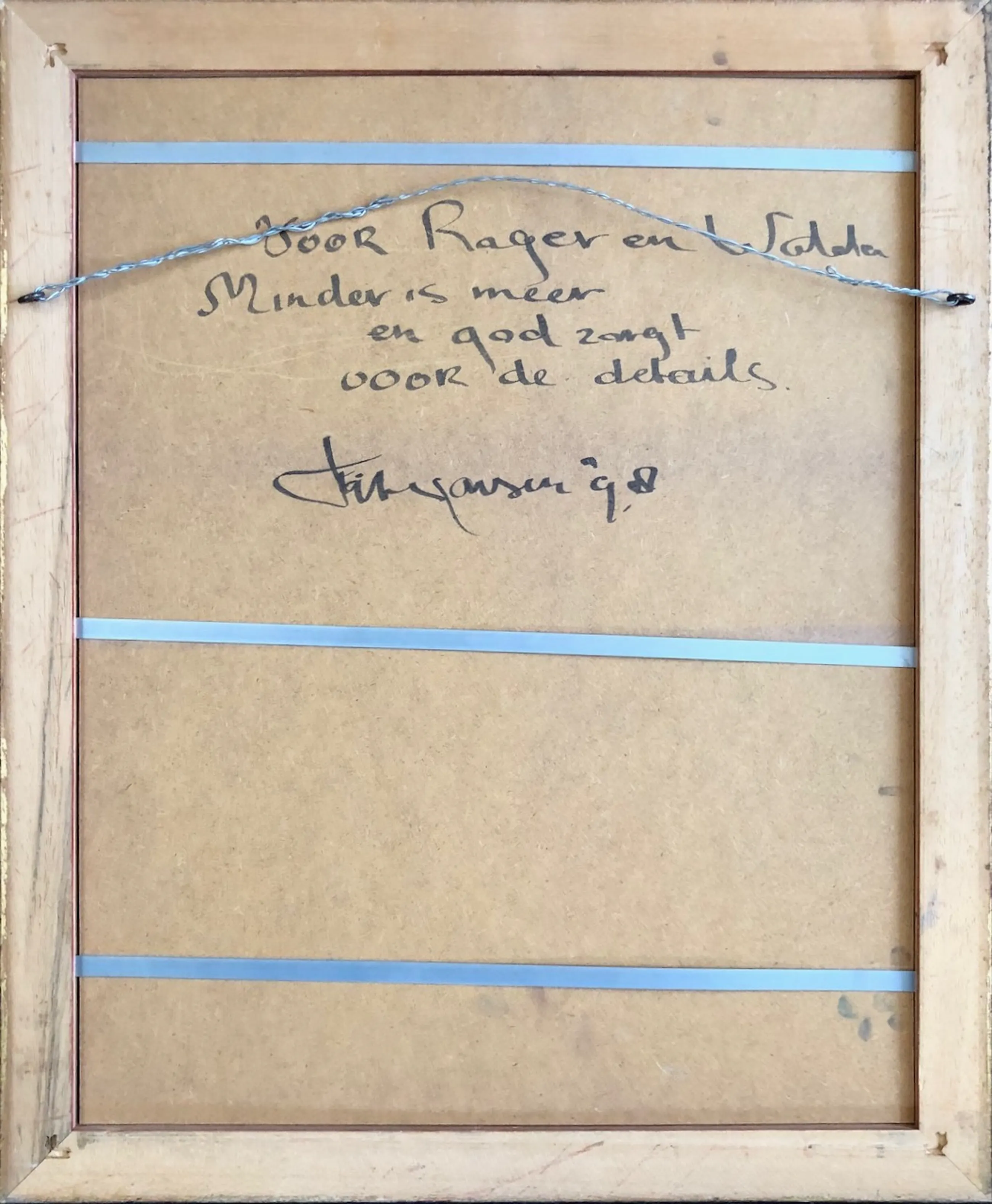E.e.a. is in de originele lijst vervat terwijl Frits Jansen dit werk op het passe partout van zijn signatuur en persoonlijke boodschap heeft voorzien. Geen verkleuringenen ook de lijst is nog helemaal gaaf. Achterop heeft Frits Jansen nog eens extra eenpersoonlijke spreuk toegevoegd":"Minder is Meer en God zorgt voor de Details".