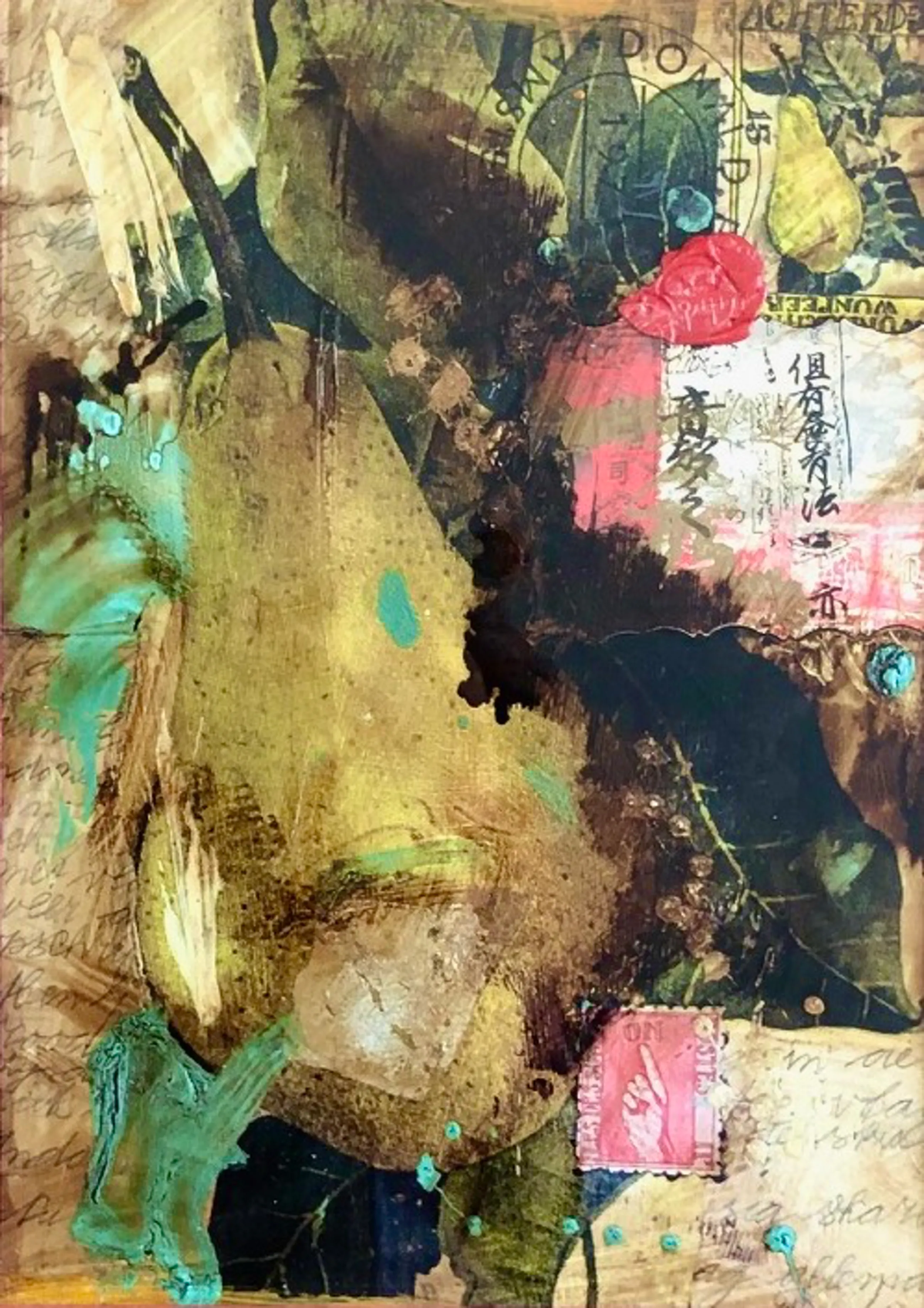 Een werk waarin Frits Jansen echt als een alchemist is bezig geweest: Een compositie rondom foto's, lakstempels, graffiti-achtige tekens aangevuld met zijn eigen schilder- werk. E.e.a. zorgt voor een rijke compositie rondom een peer. Bijzonder daarbij is dat Jansen dit ook zelf van een persoonlijke boodschap heeft voorzien voor de mensen uit Belgie die het op een tentoonstelling in Rotterdam hebben aangekocht. Contact hierover met Frits Jansen leerde ons dat dit werk rond de eeuwwisseling voor zo'n fl. 2500,- van de hand ging. Met deze stijl heeft Jansen uiteindelijk naam en faam opgebouwd.
