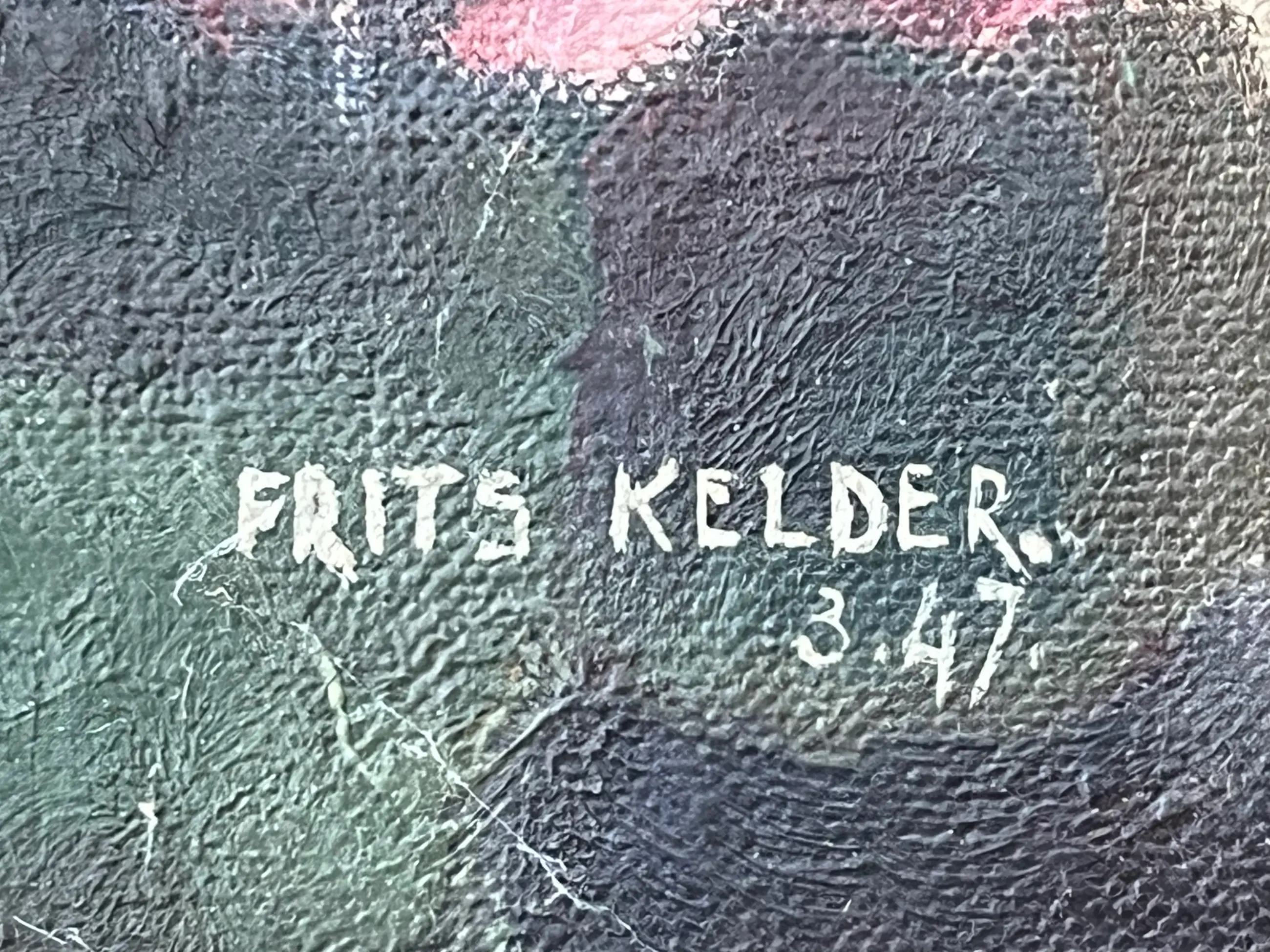 Leuk schilderijtje stilleven hortensia’s olieverf in houten lijst. Geschilderd door de bekende schilder Frederika Wilhelmina Christina Kelder. Gesigneerd Frits Kelder 1947.
