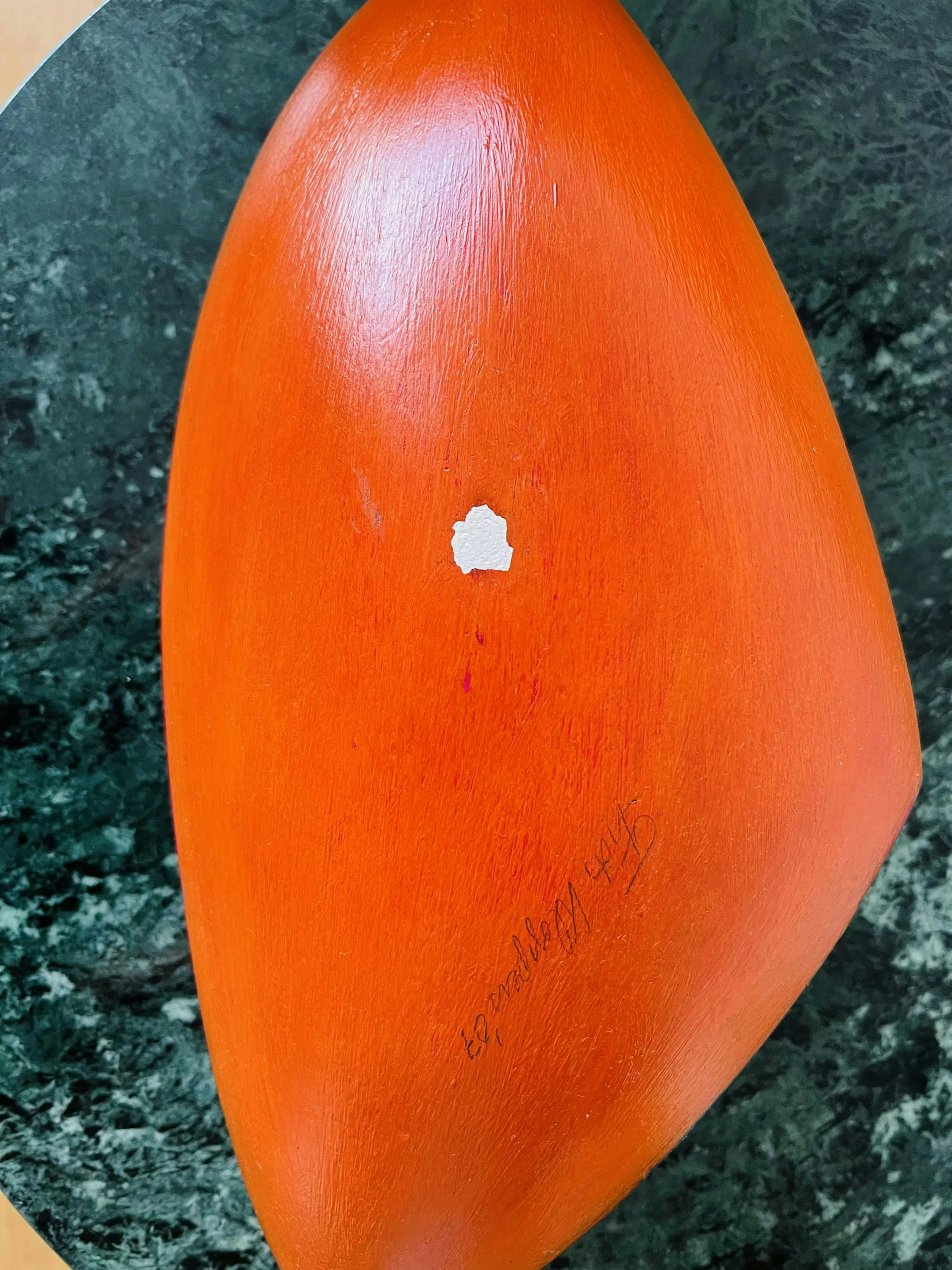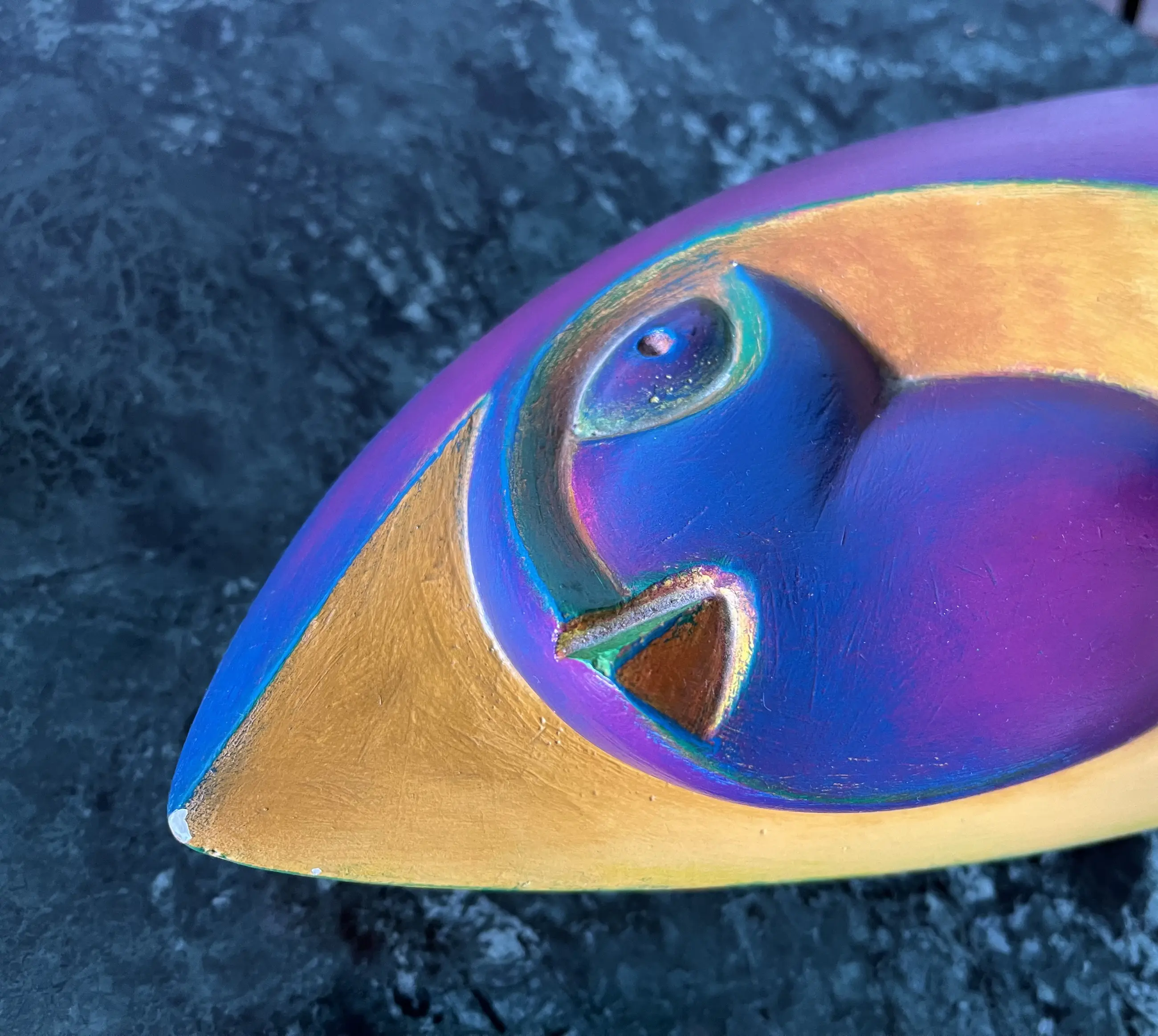 Het is rechtstreeks bij de kunstenaar gekocht tijdens een grote expositie van zijn werk in Schiedam. Het aankoopbewijs krijgt u erbij (aankoopprijs was 750 euro). Het kunstwerk is vrijwel intact, op een minichipje van het puntje (zie foto's) en een beschadiging aan de onderkant na, maar dat is niet te zien aangezien het daarop rust. De kleuren precies weergeven zoals ze zijn is voor mij als onervaren fotograaf lastig. Het zijn heldere kleuren.
