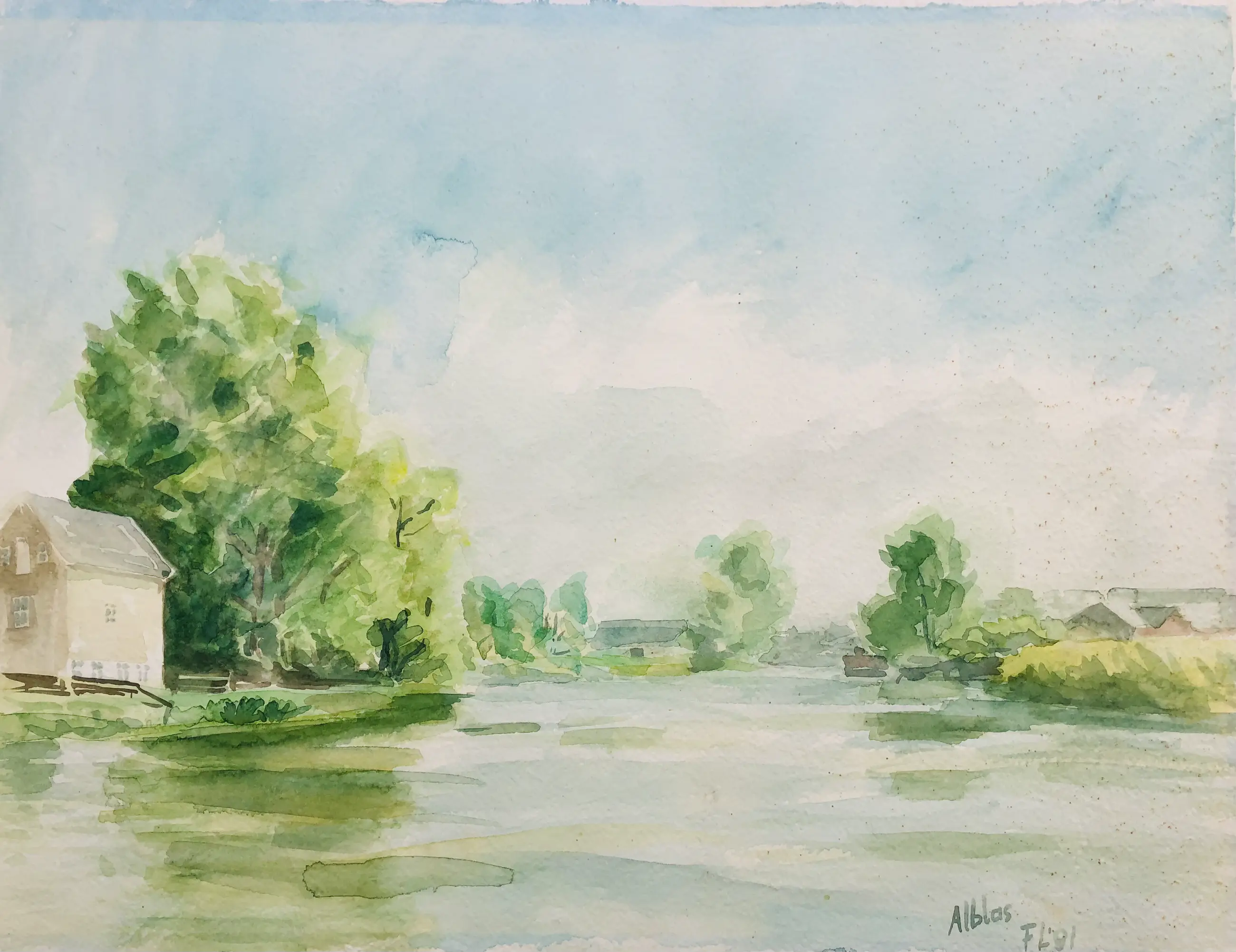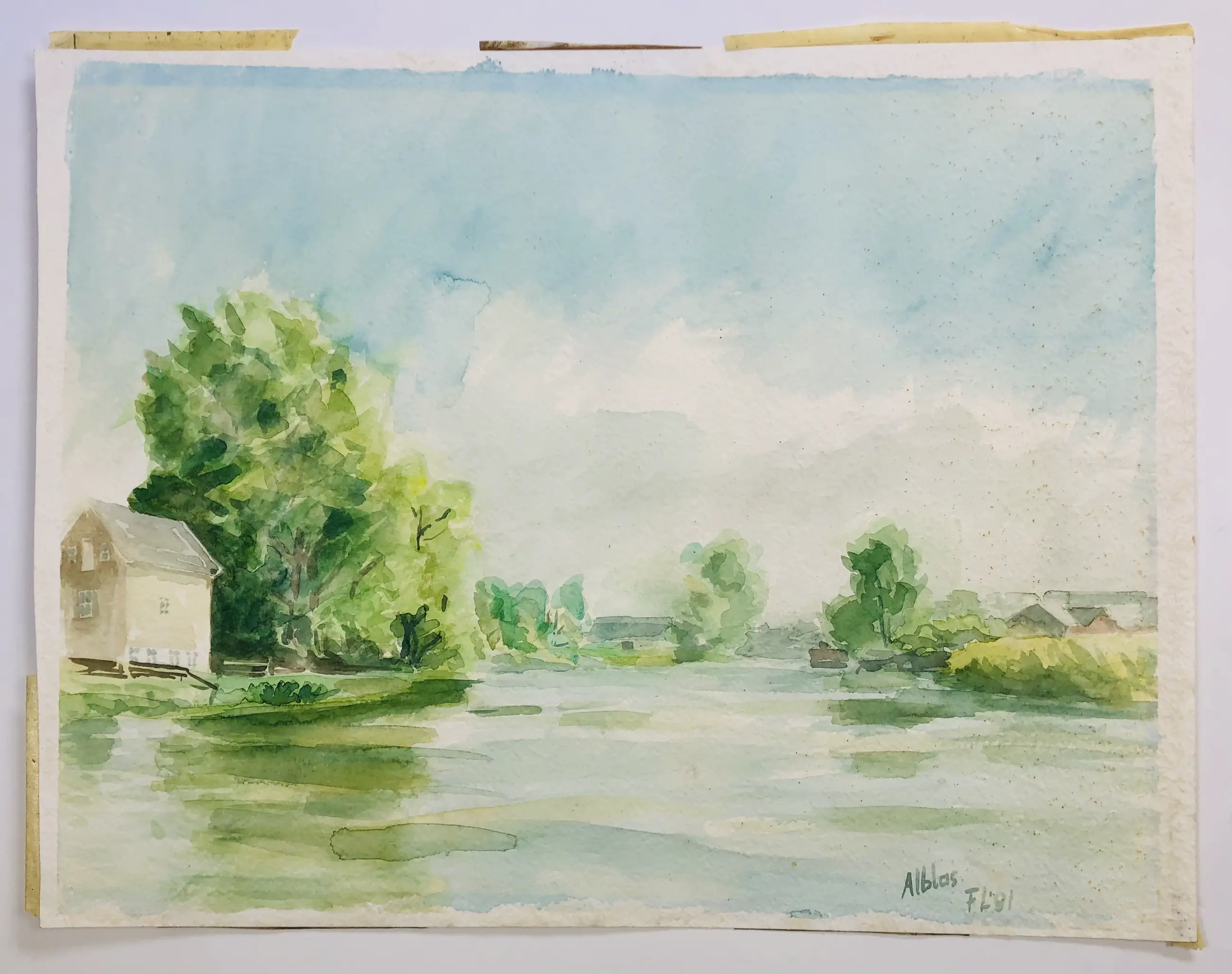 Landschappelijk en origineel werk op papier van Frits Linnemann (1946-2011). Let op rechts wat ouderdomssporen.