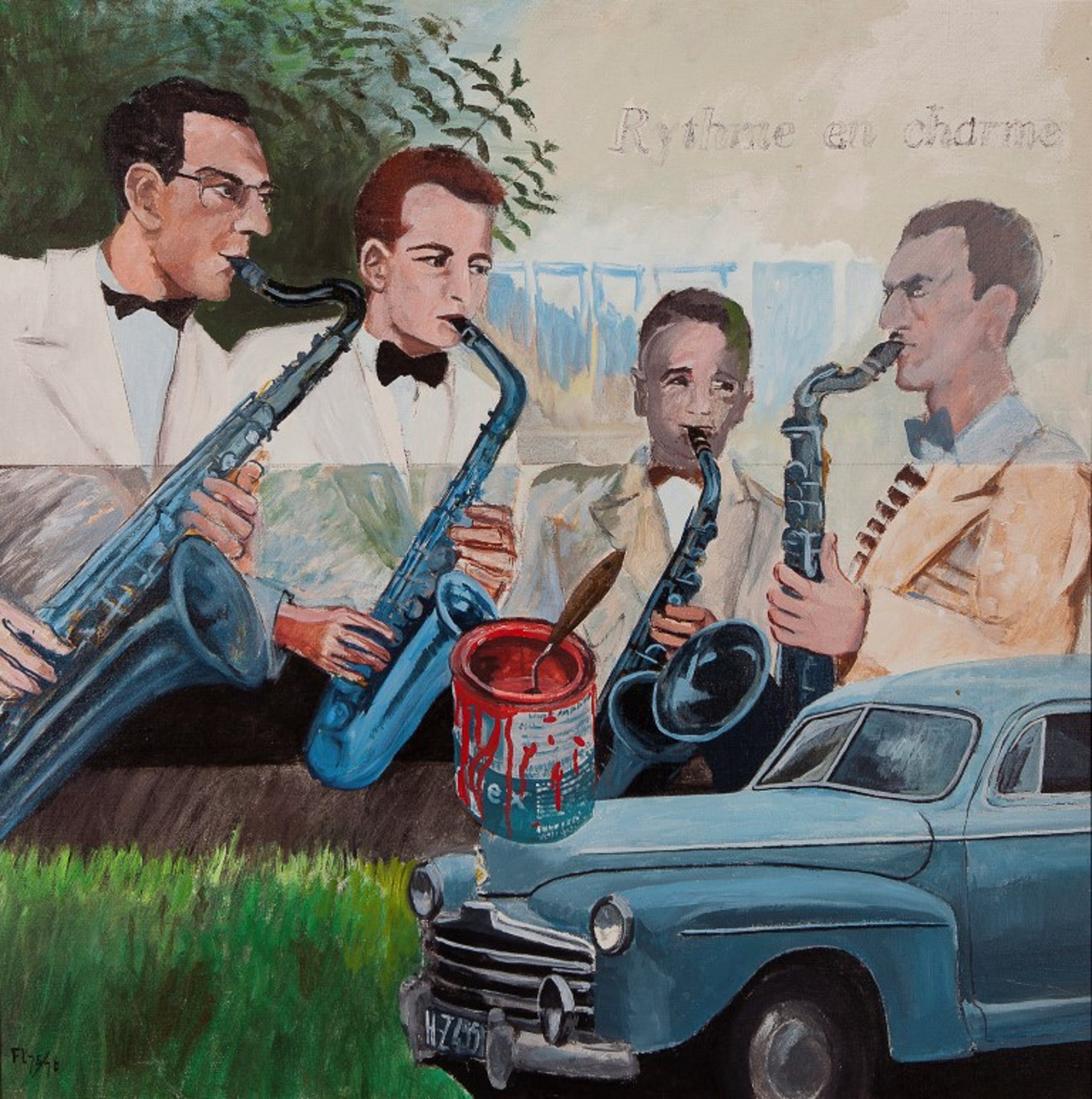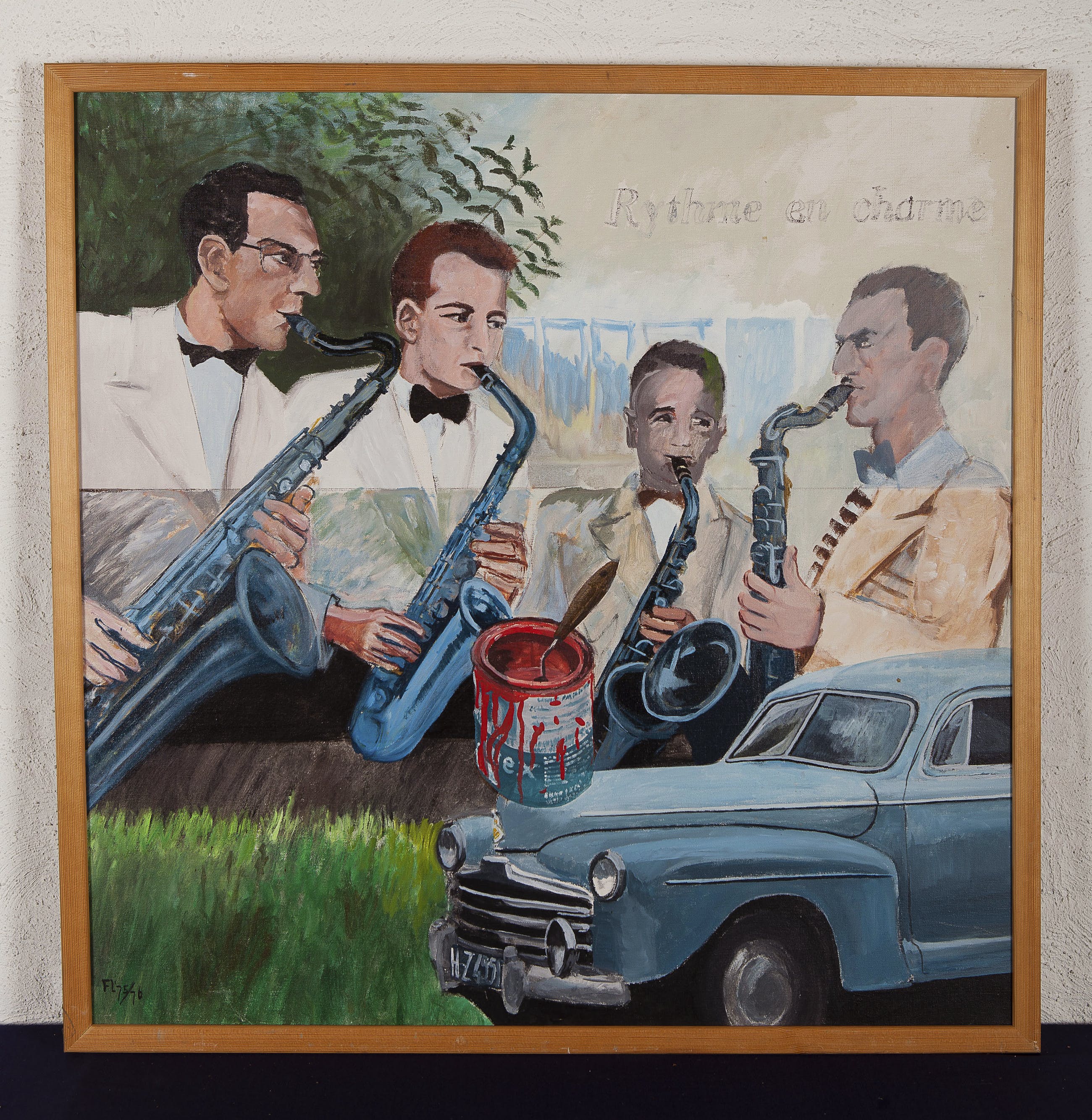 | Er zit een buts in het doek rechts boven het hoofd van de rechter muzikant. Ook zit er een bruine vlek op de auto. | |