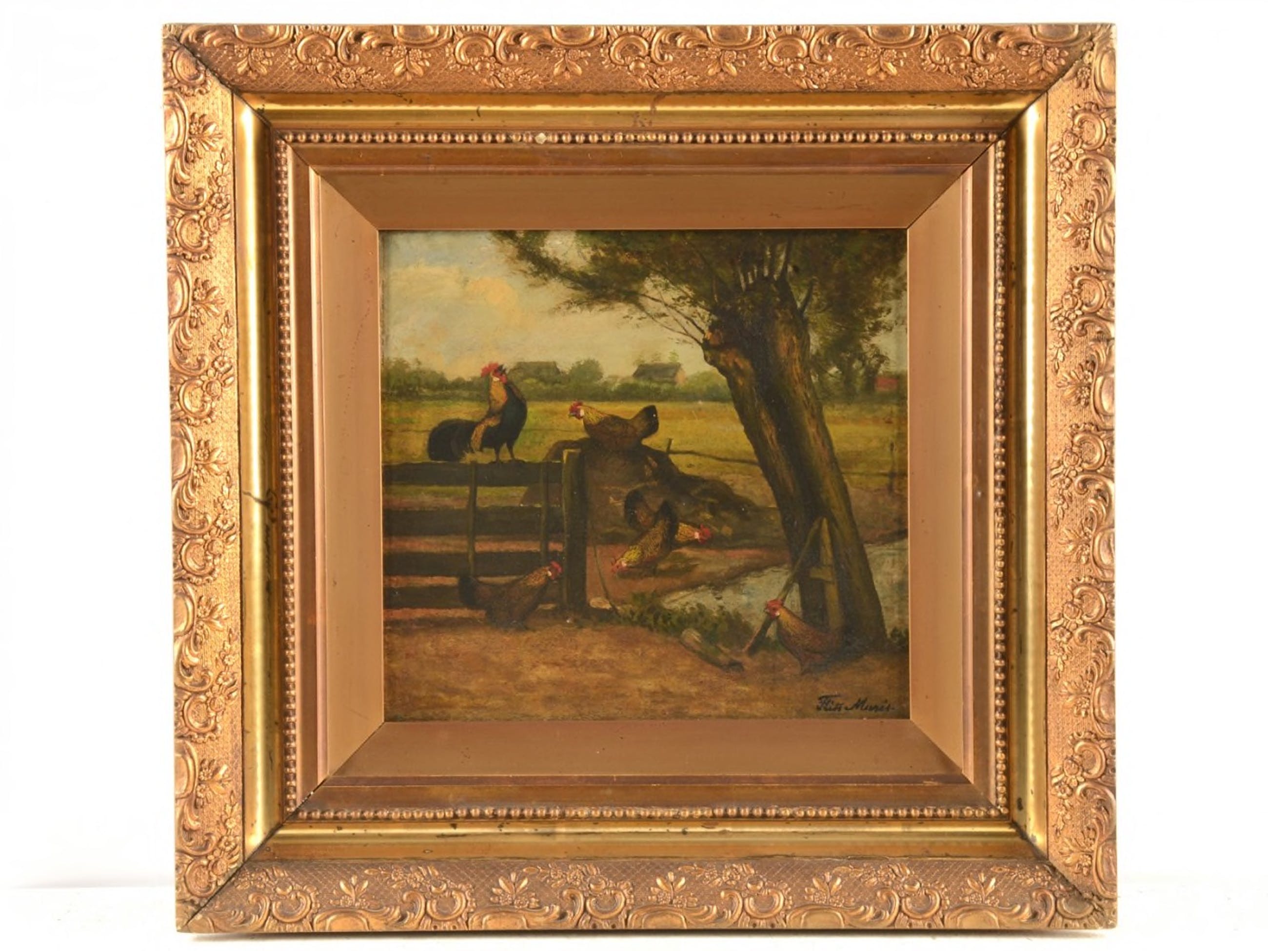 Mooi boers tafereel. Kippen op een hek bij een oude knotwilg. Gesigneerd door Frits Maris. In klassieke goudkleurige lijst. Formaat 27x30