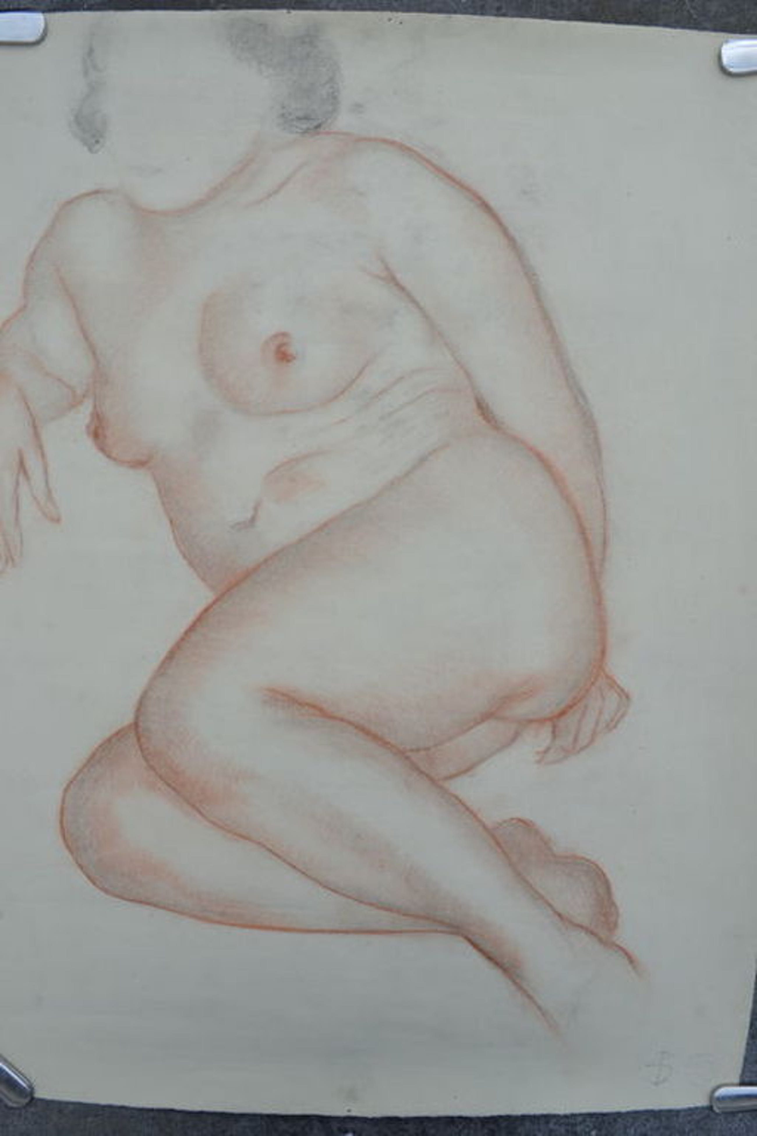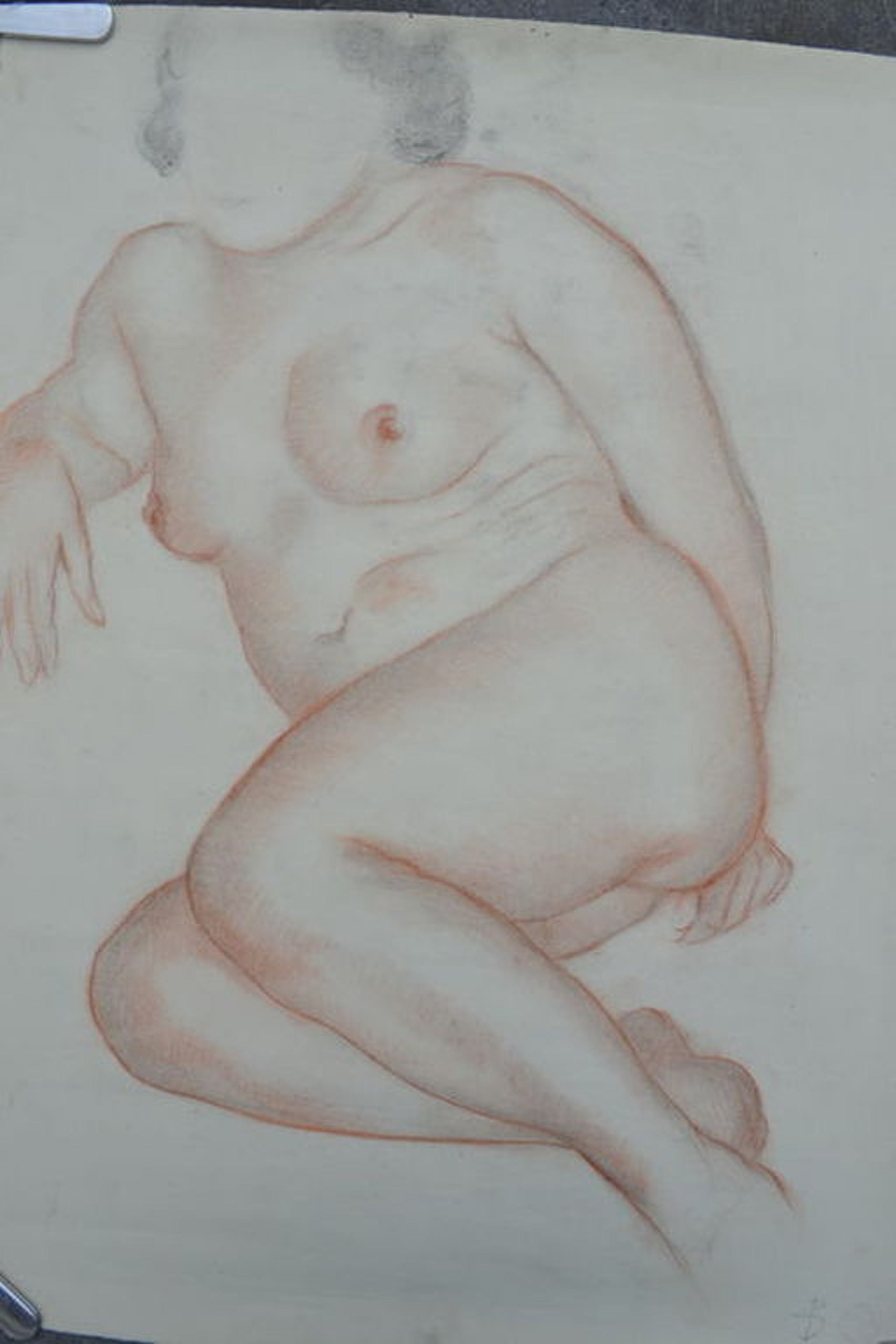 Krijttekening van F. Schiller - roodkrijt op papier - liggend vrouwelijk naakt - r.o. gesigneerd - in goede staat - afmetingen 60x40cm. Frits Schiller genoot grote bekendheid in Amsterdam als hoteleigenaar en kunstschilder. Na een schildersopleiding bij G.J. Staller en daarna aan de Rijksacademie specialiseerde hij zich in landschappen, stillevens en stadsgezichten. Zijn grote talent lag bij portretten.