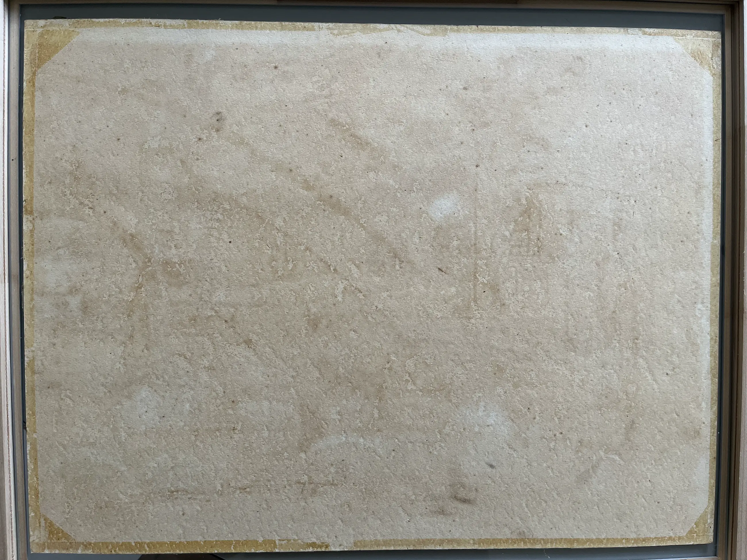 De staat van het werk is goed. Lichte globale vergeling van het papier. Bovenaan is een lichte rand zichtbaar waar blijkbaar ooit een passe-partout overheen is gevallen waardoor er daar minder geelverkleuring heeft plaatsgevonden.