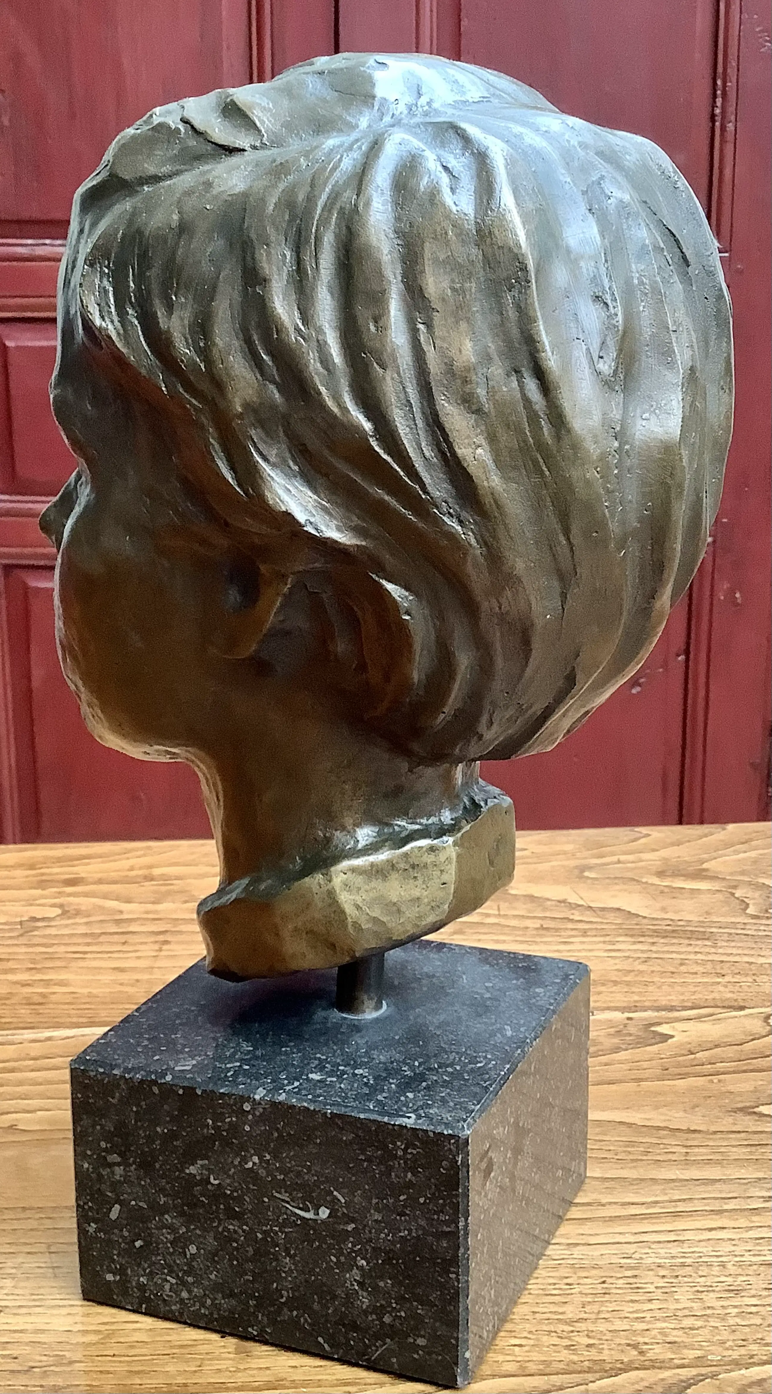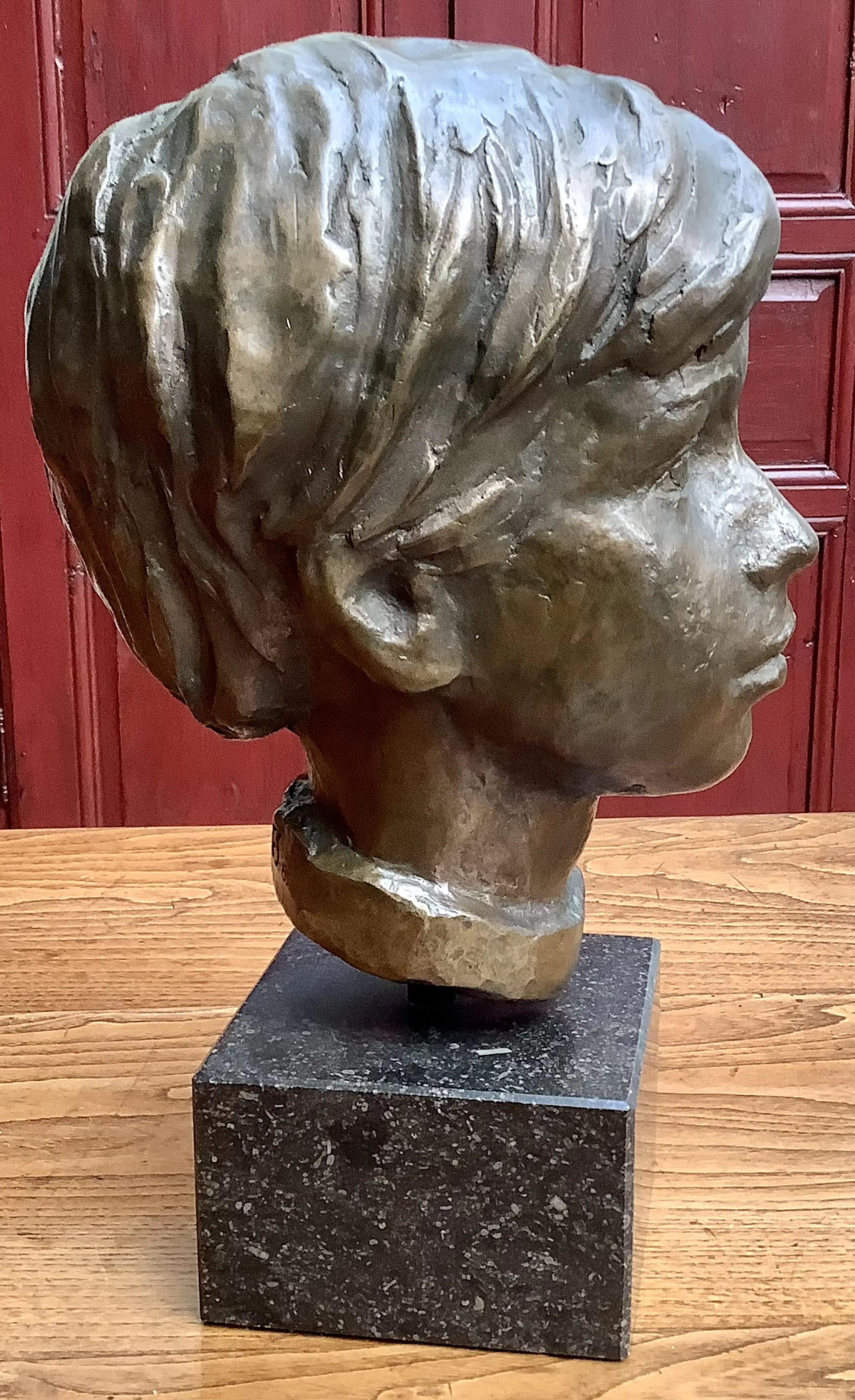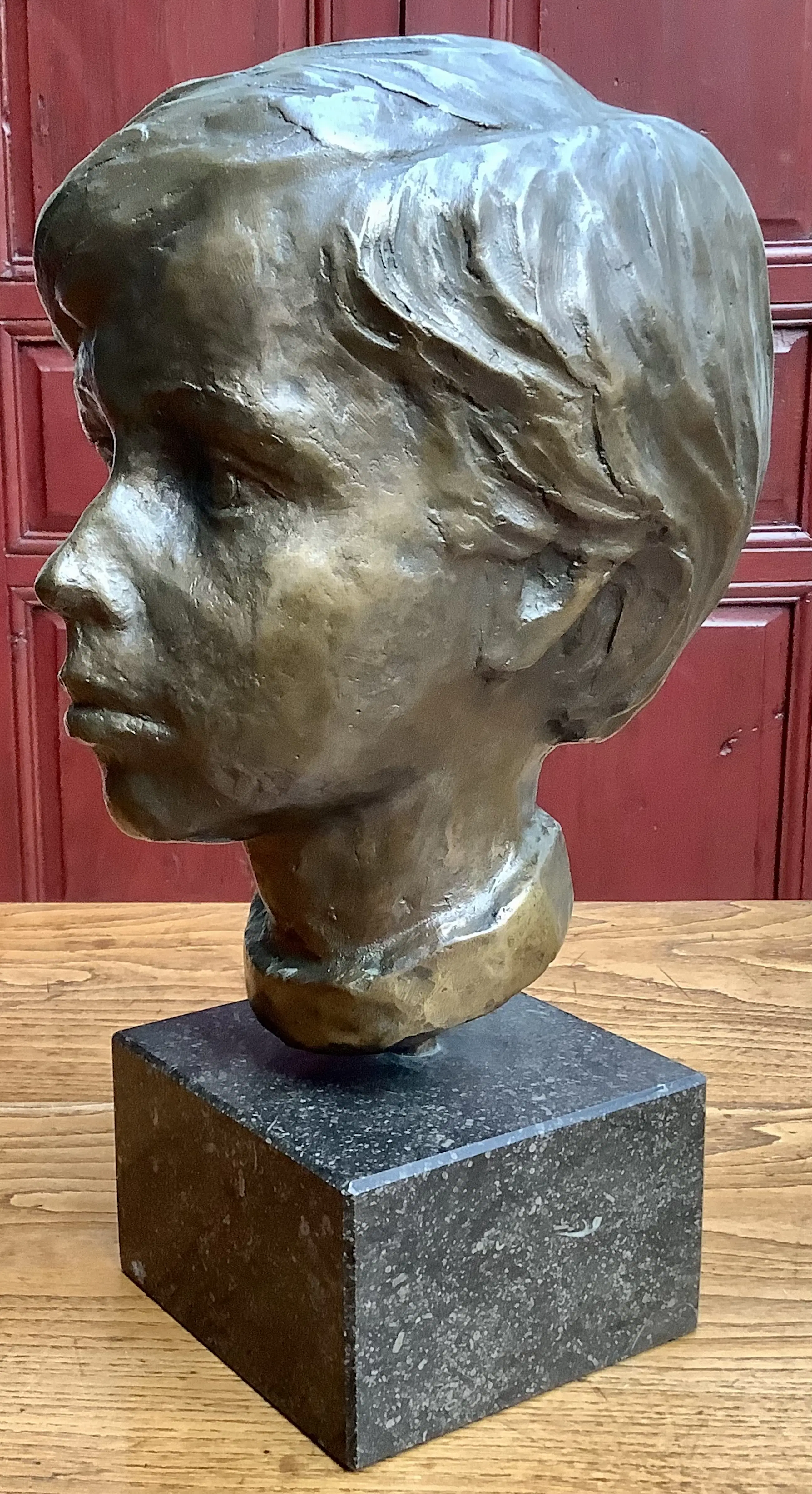 Ingetogen portret in brons van jongeman. Vakwerk zowel in techniek van het boetseren als ook in het gietsel. Gesigneerd en gedateerd.