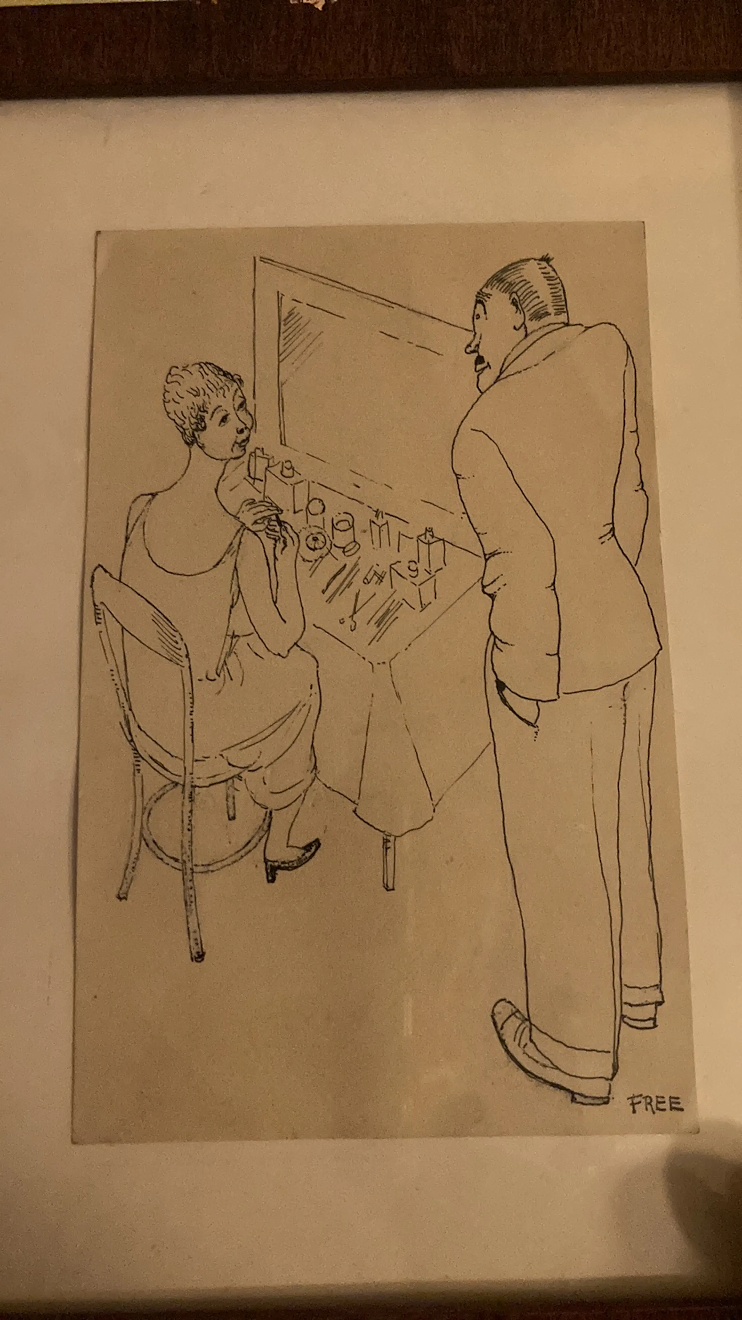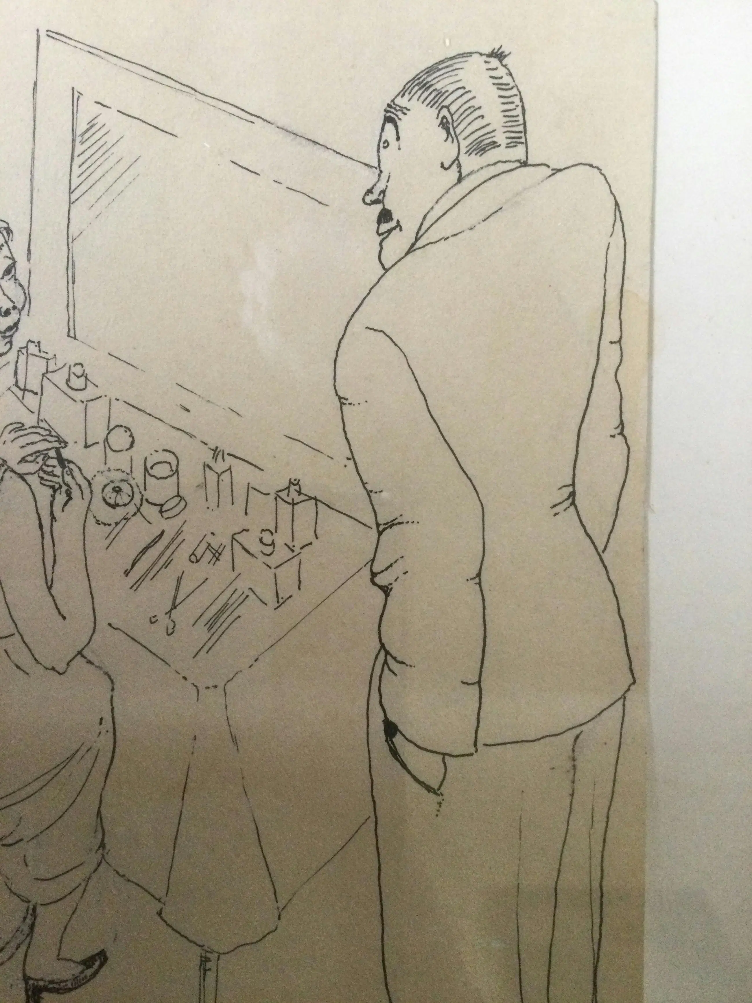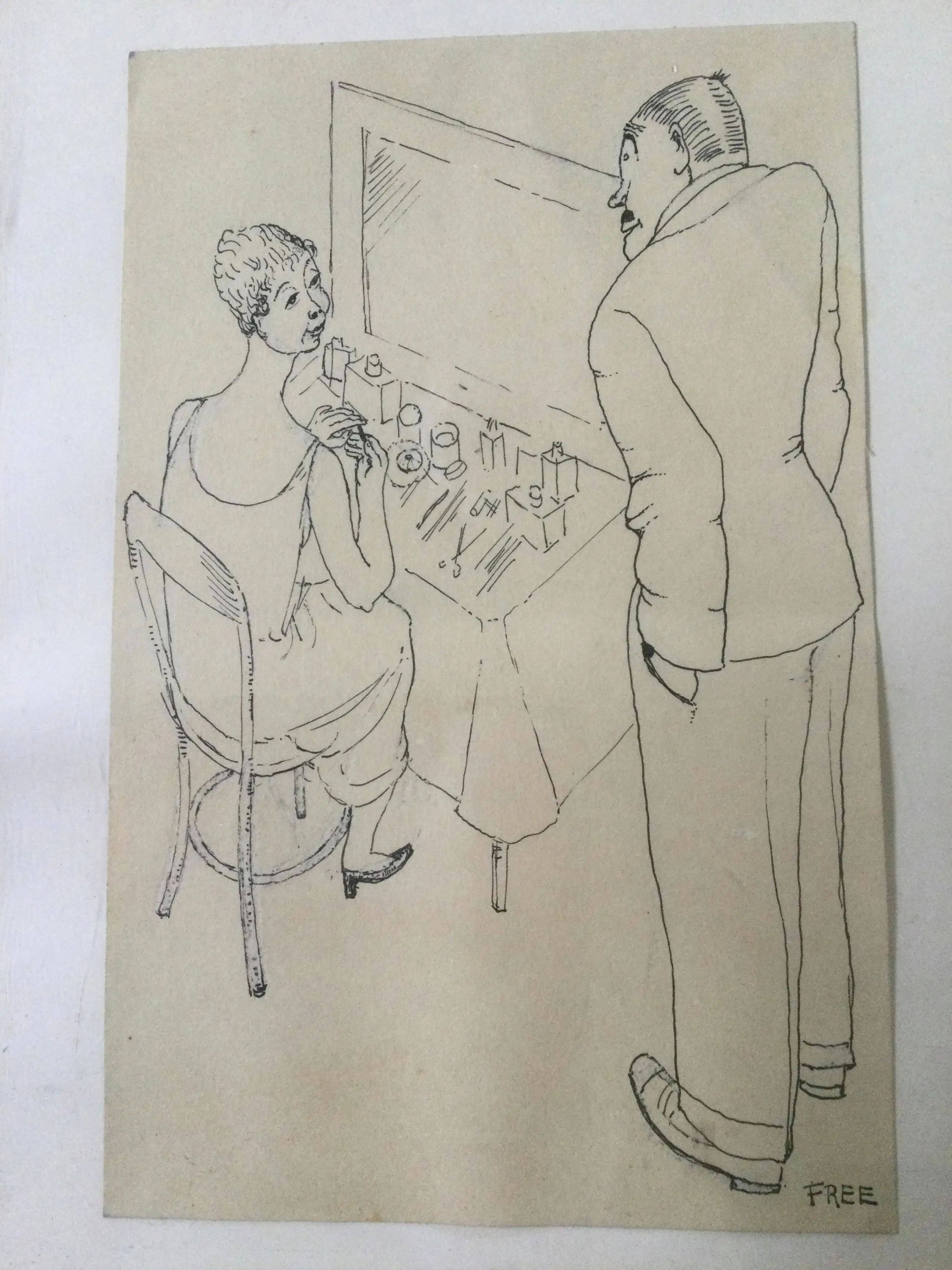 “Twee figuren in gesprek in een kleedkamer” Indische inkt tekening uit Tijdschrift Vooruit. Gesigneerd: Free