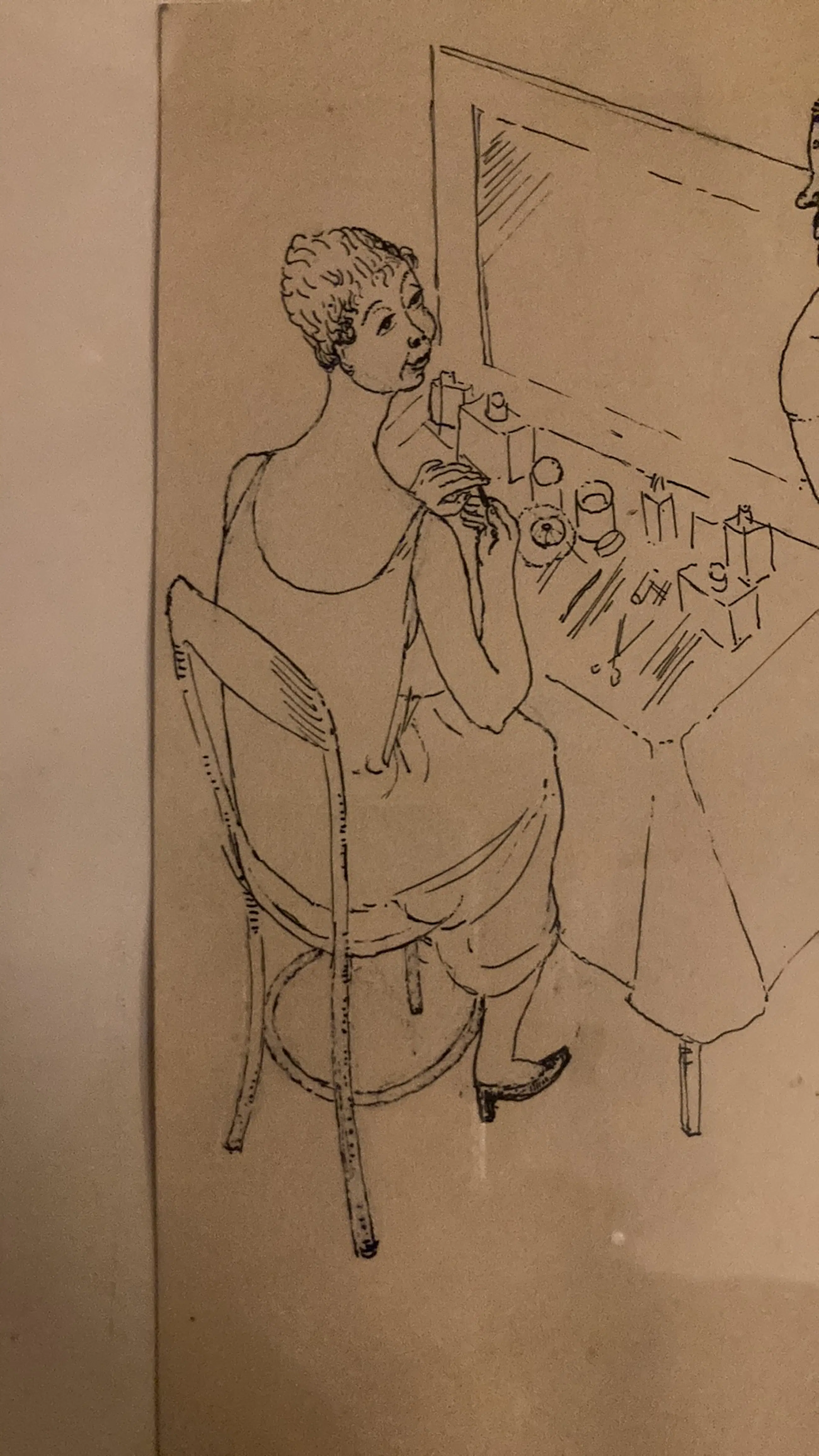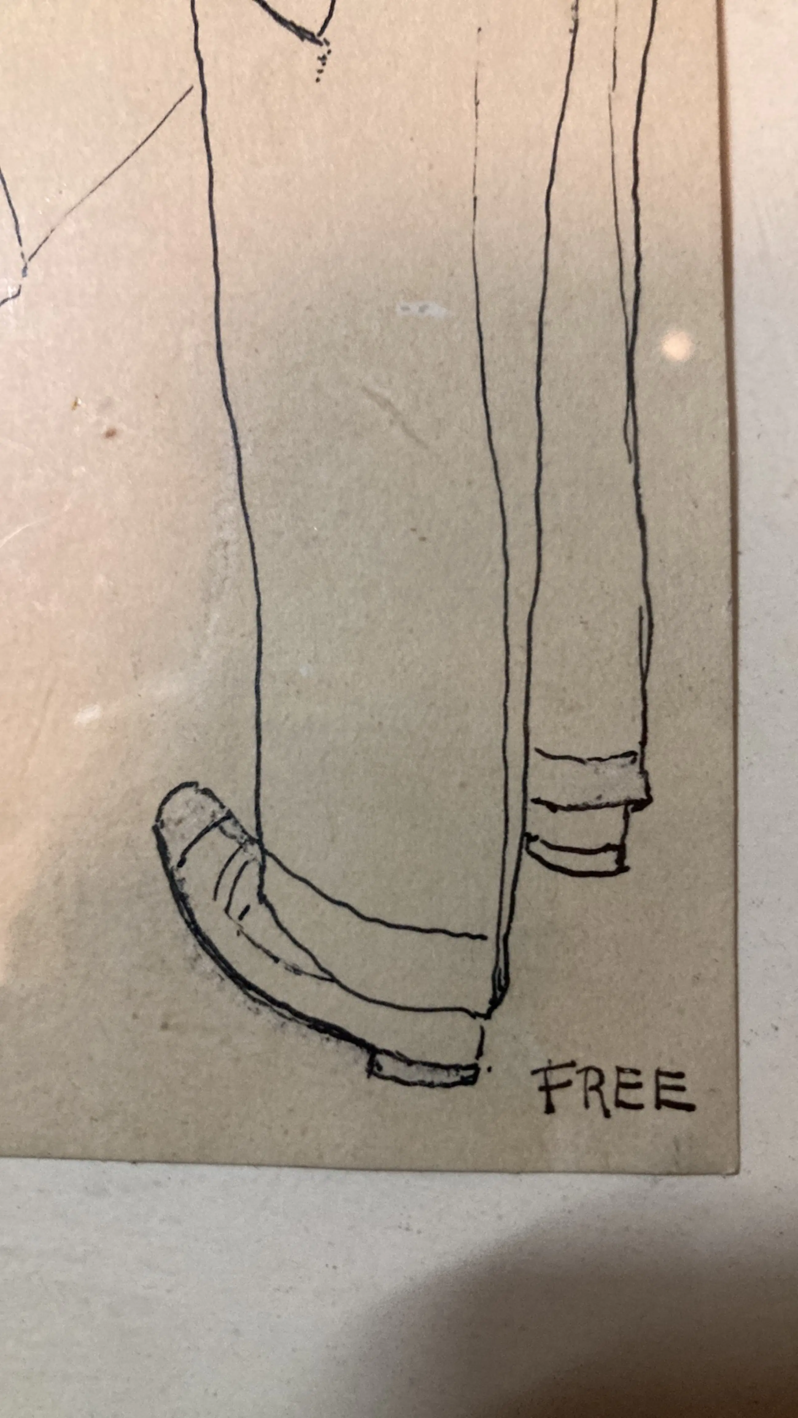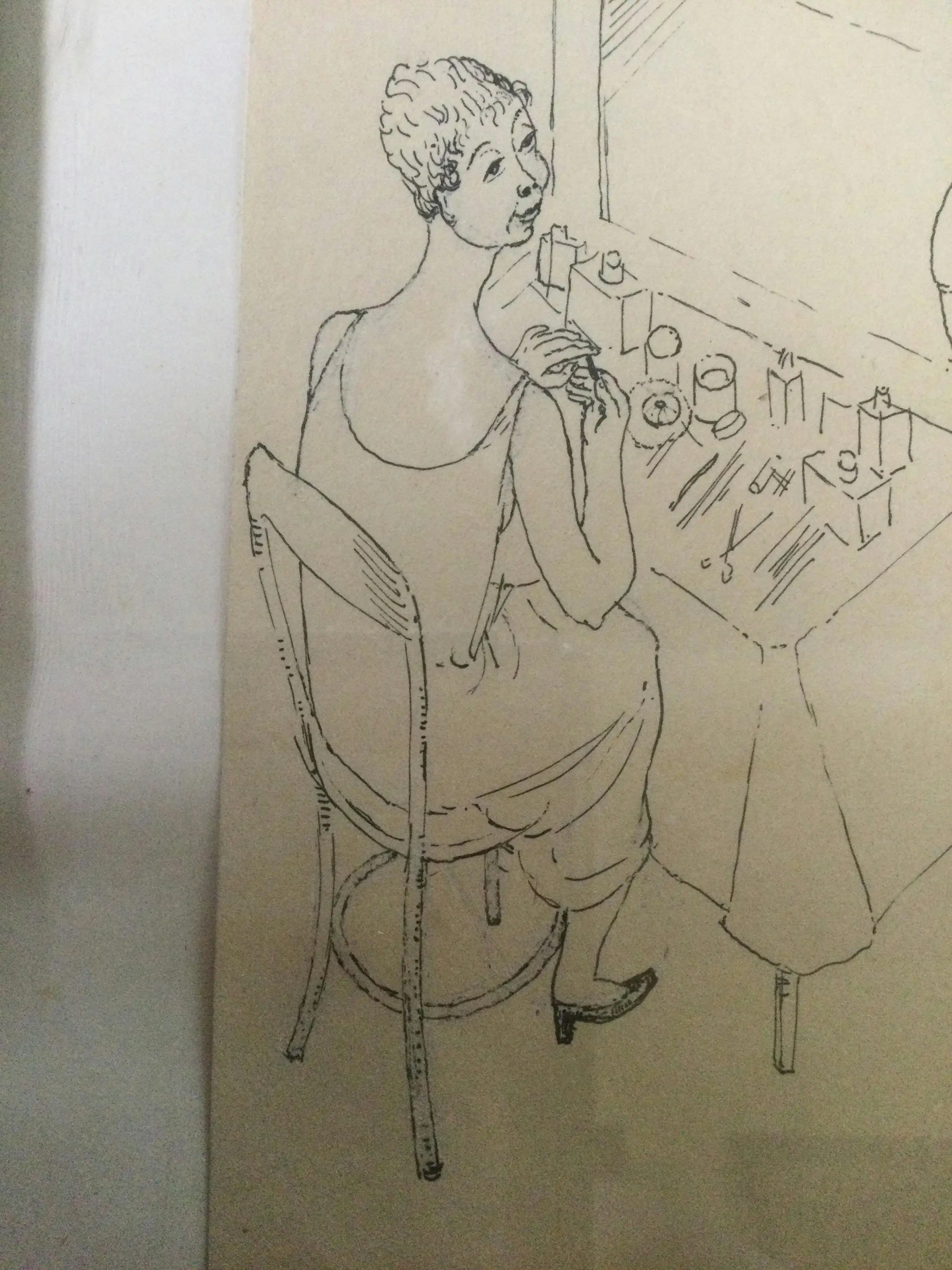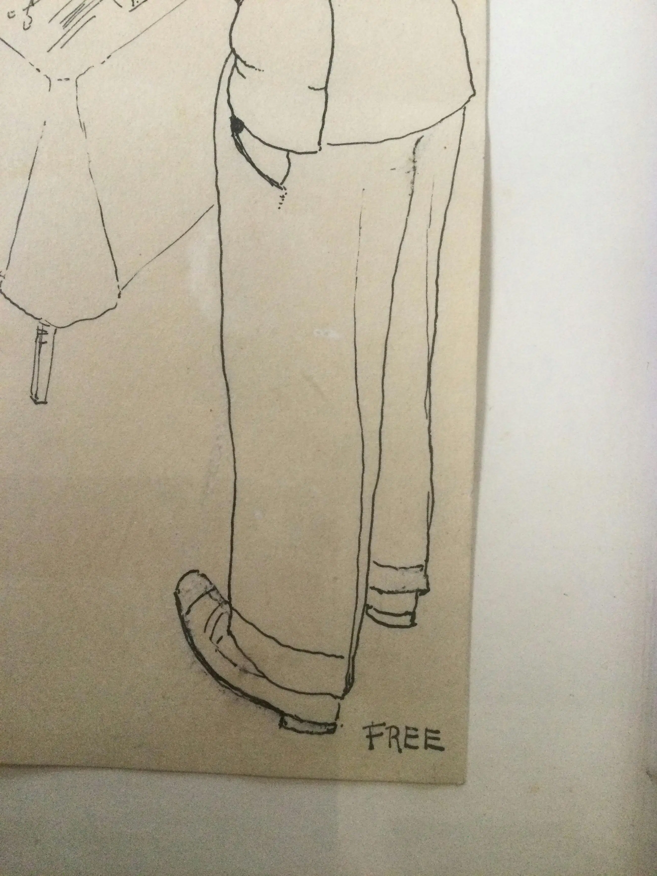 “Twee figuren in gesprek in een kleedkamer” Indische inkt tekening uit Tijdschrift Vooruit. Gesigneerd: Free