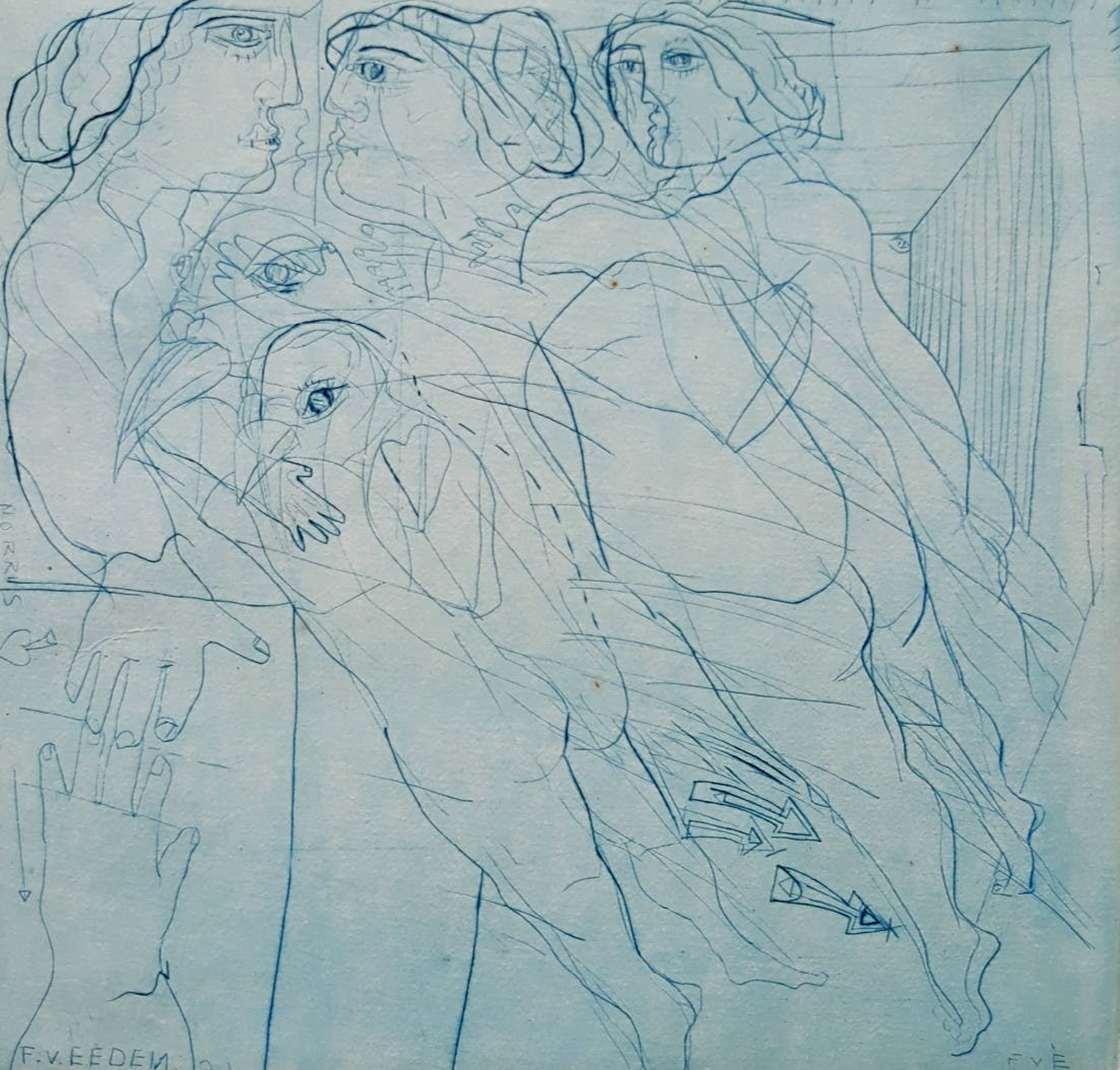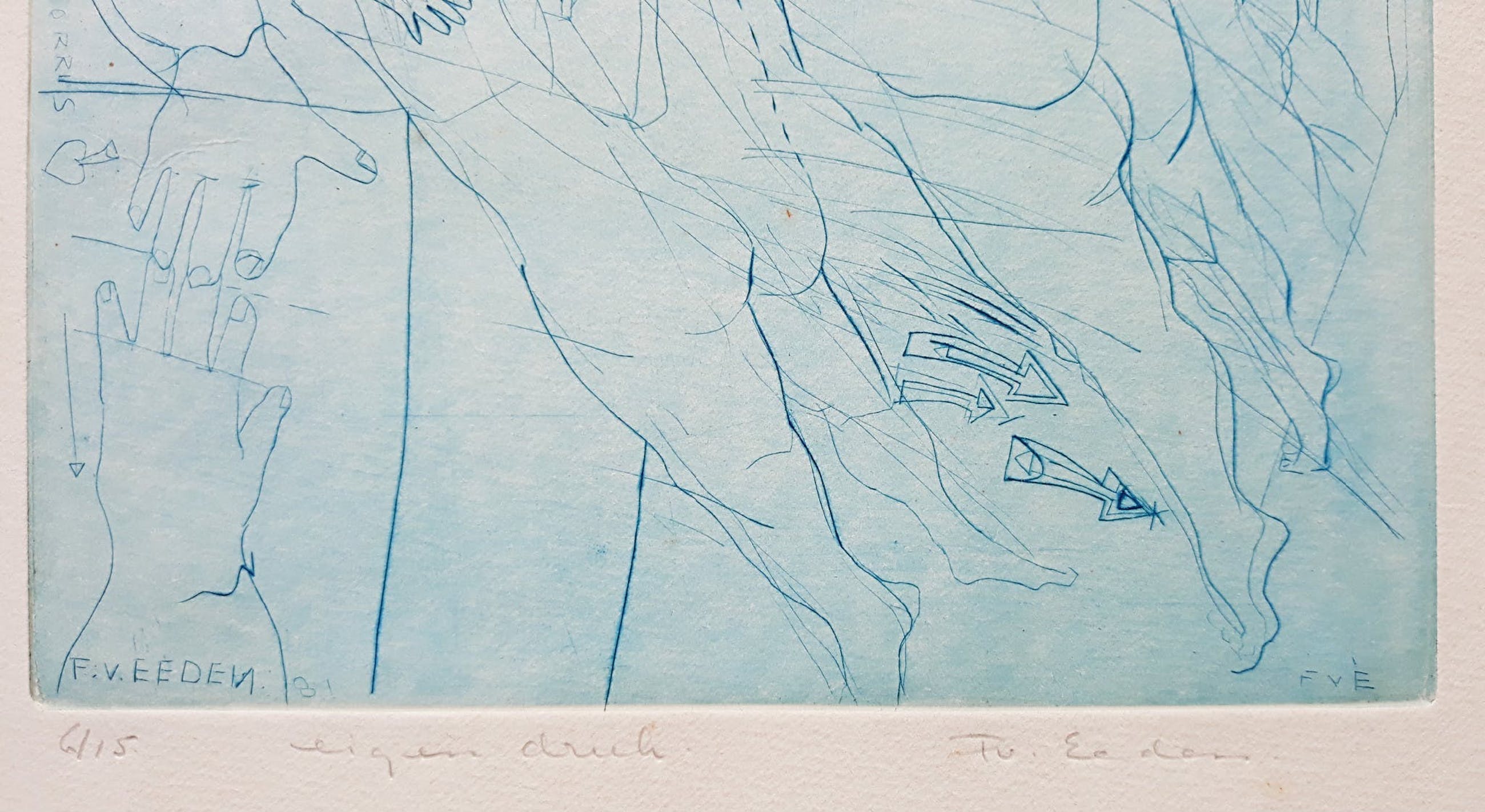 Karakteristieke compositie met figuren van Frits van Eeden. Aquatint ets op papier, met potlood gesigneerd en genummerd (6/15), in de plaat nogmaals gesigneerd, gemonogrammeerd en gedateerd (81). In zeer goede conditie.