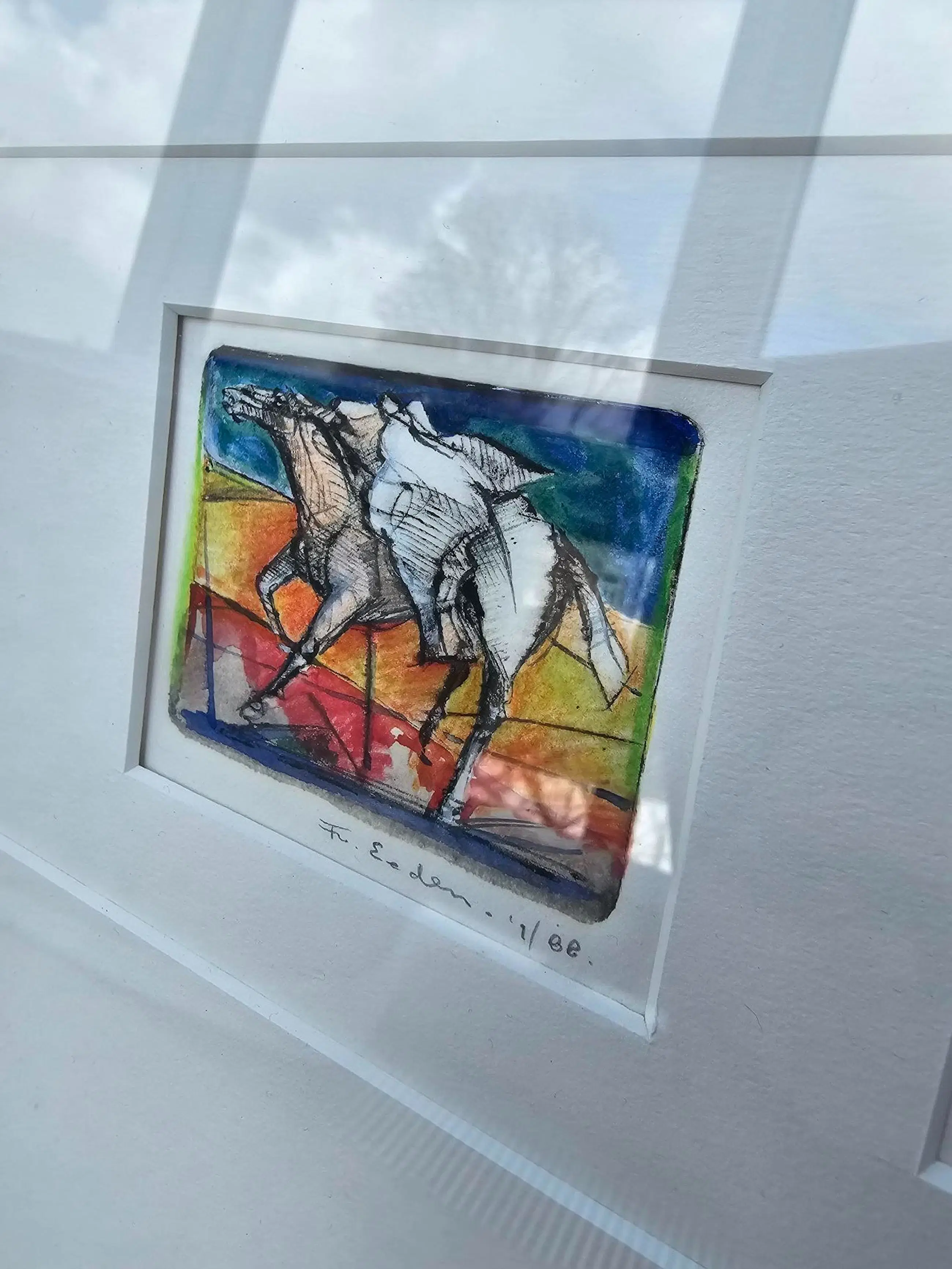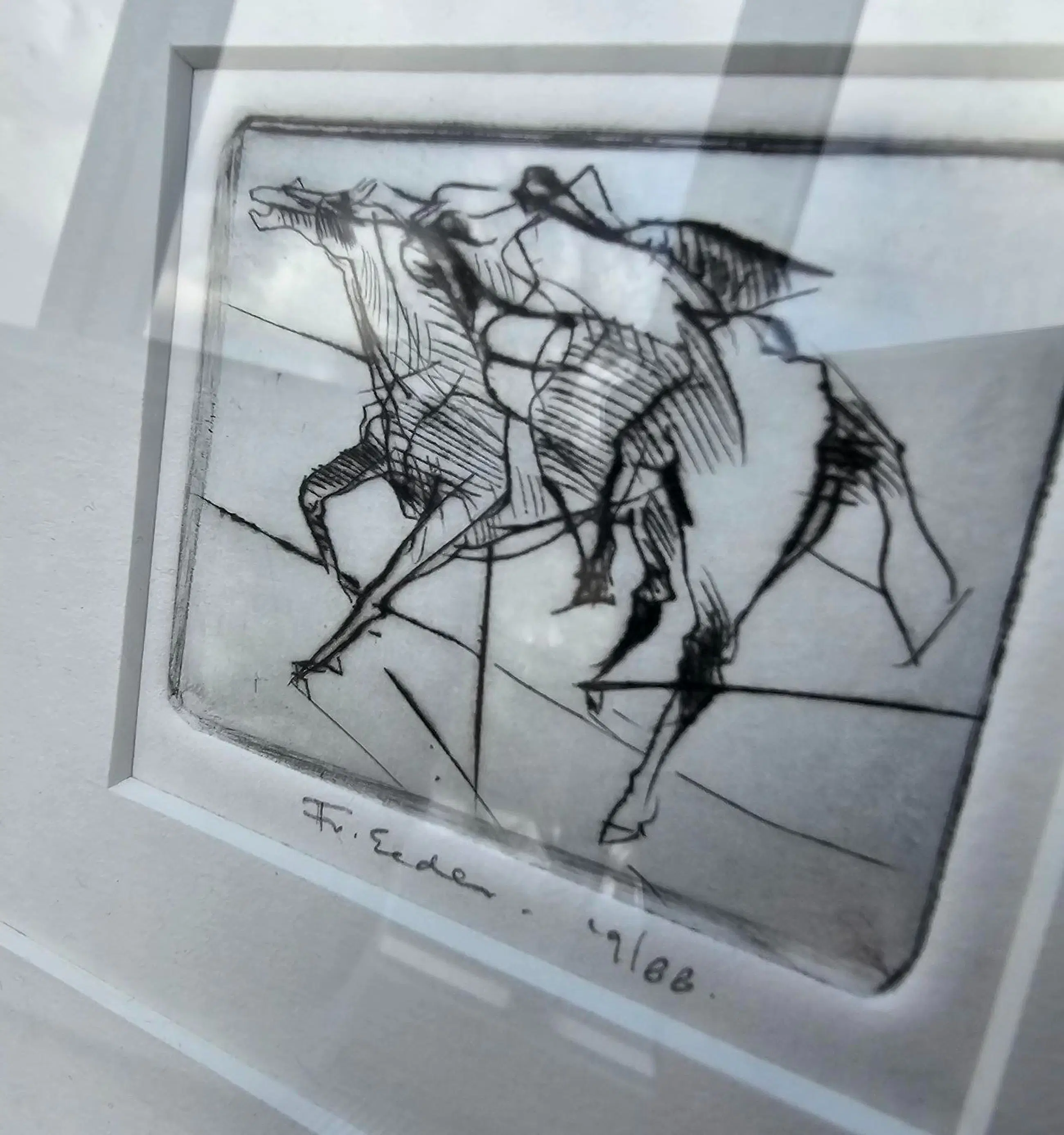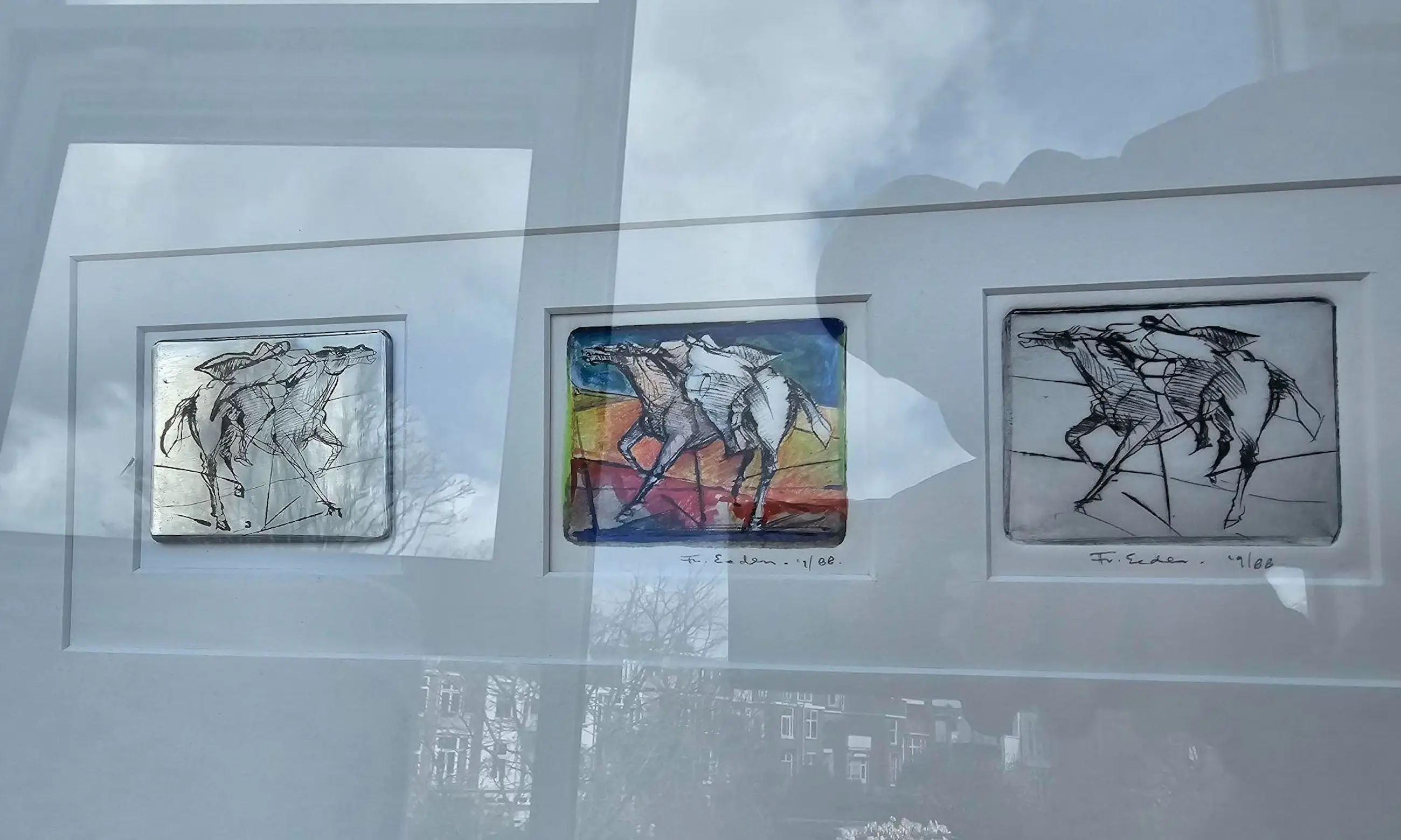 Een drieluik van 3 etsen van een paard. Aan de achterkant van de lijst staat de tekst "Voor mevr. L. Erkelens. Met Dank. Frits van Eeden. Augustus 1988."