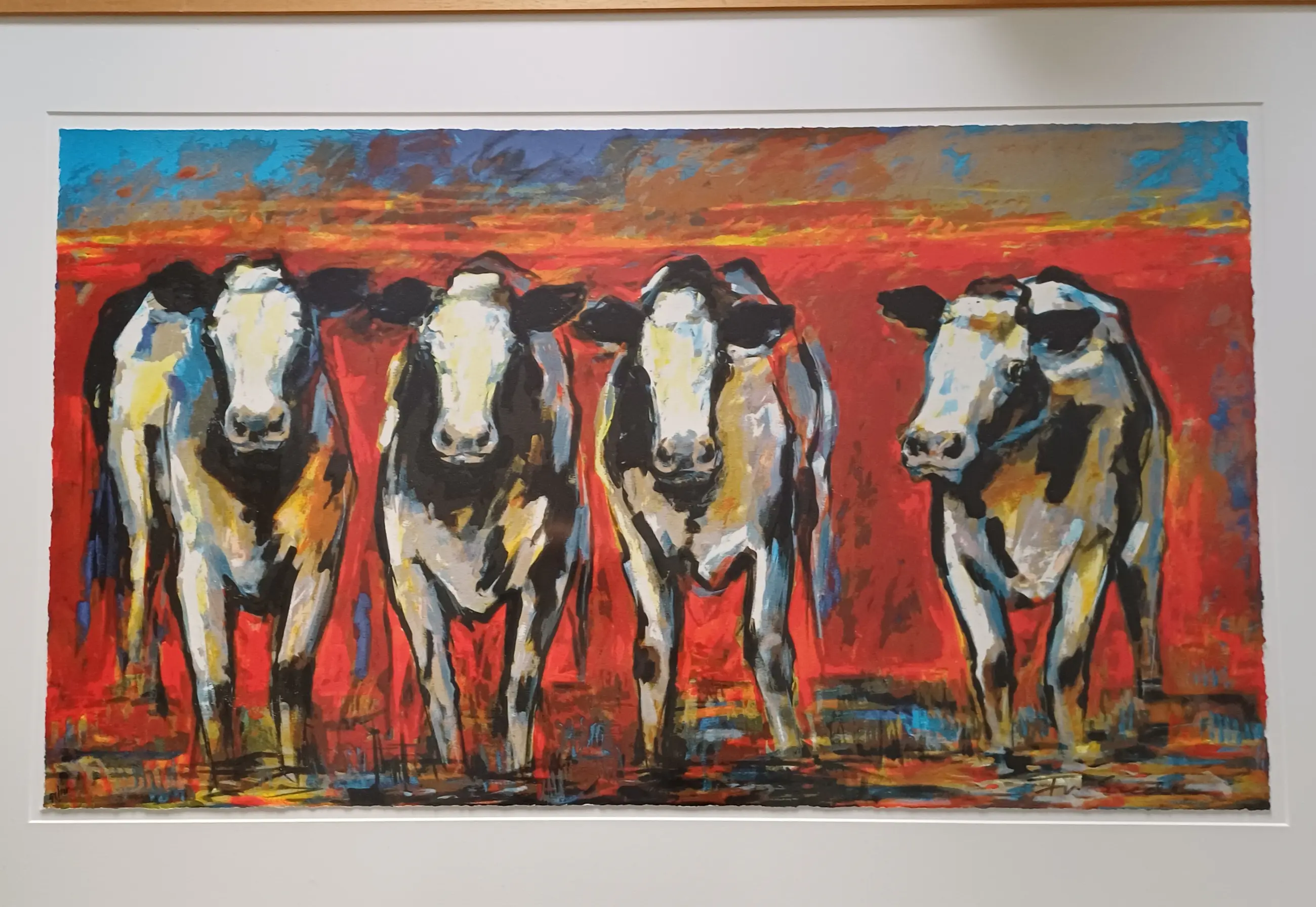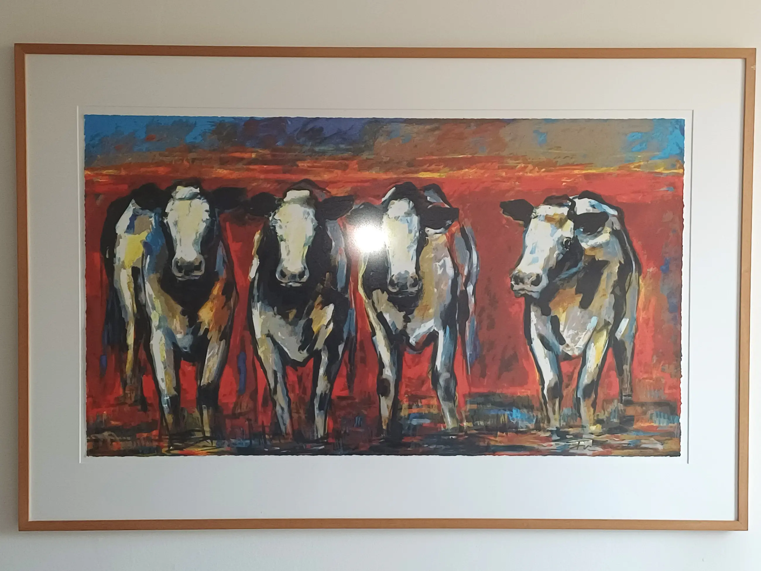 Heel fraai werk van Frits van Eeden. Deze vier koeien voor een rode gloed. Geheel voorzien van een donker rode slemper.