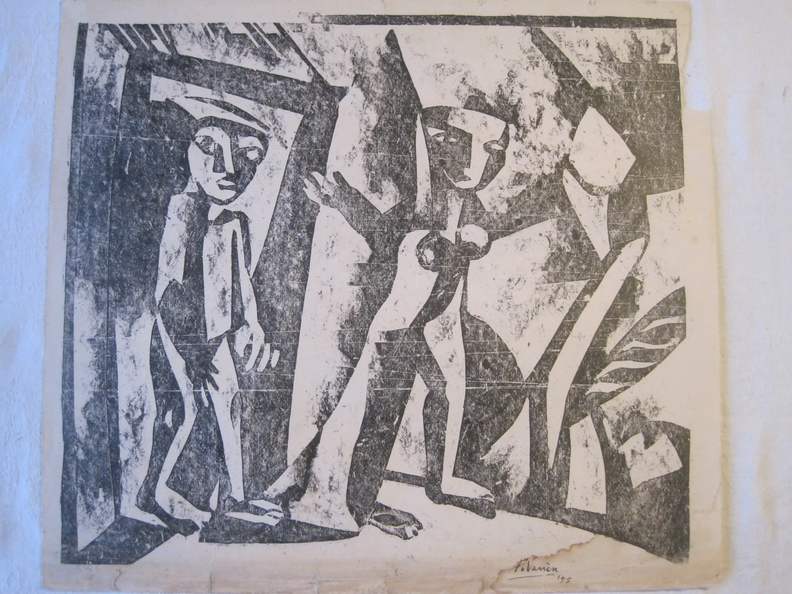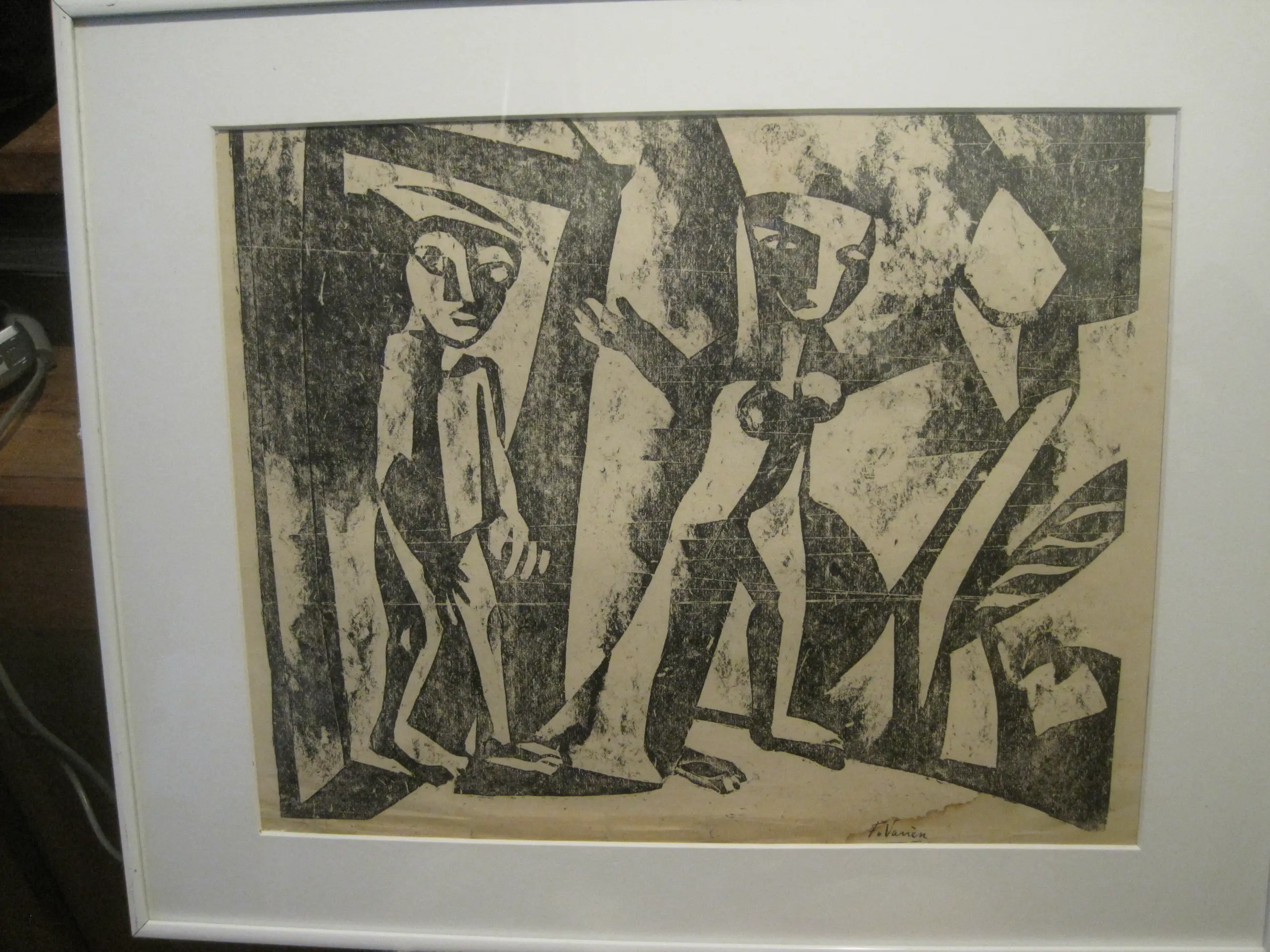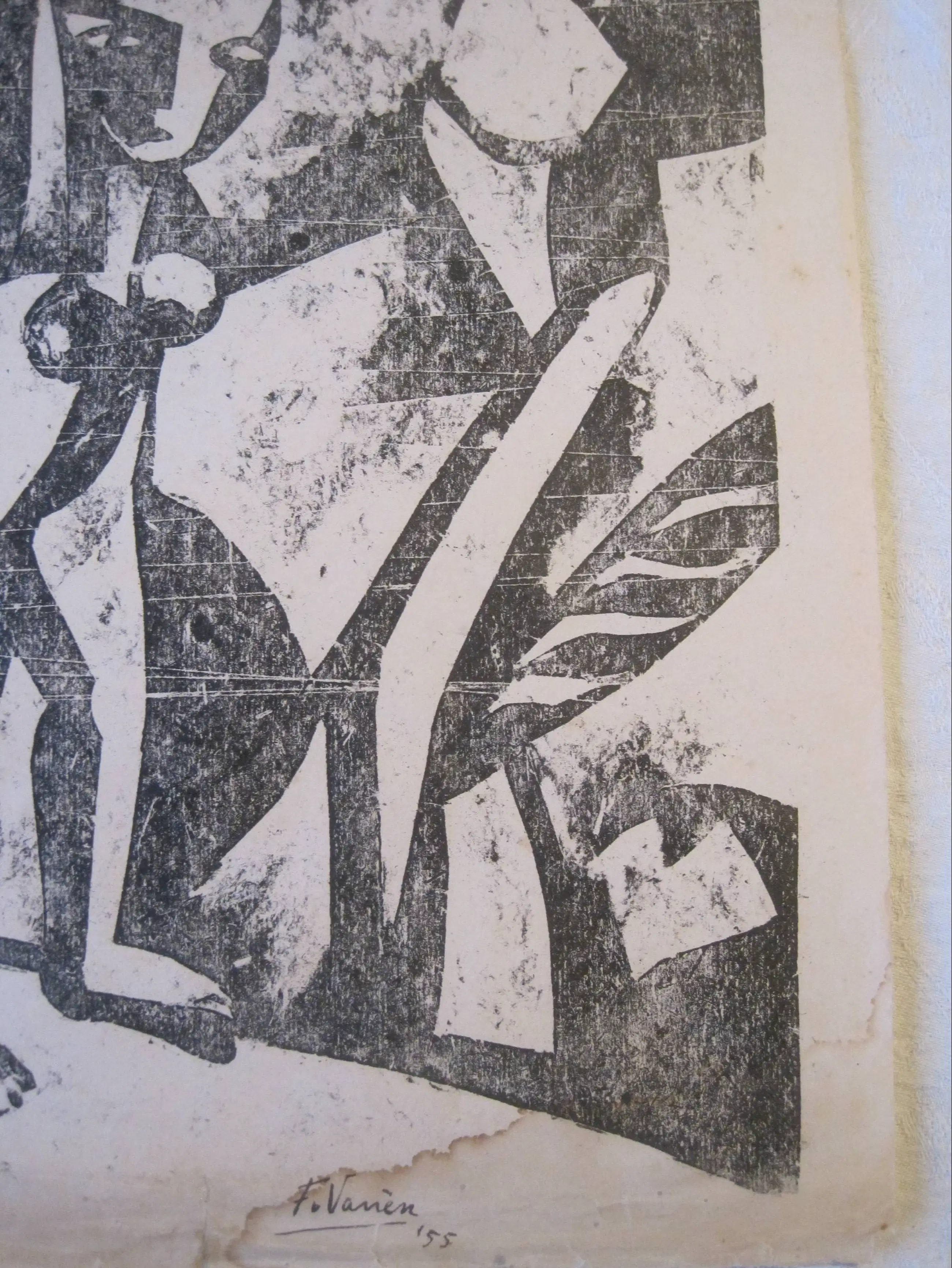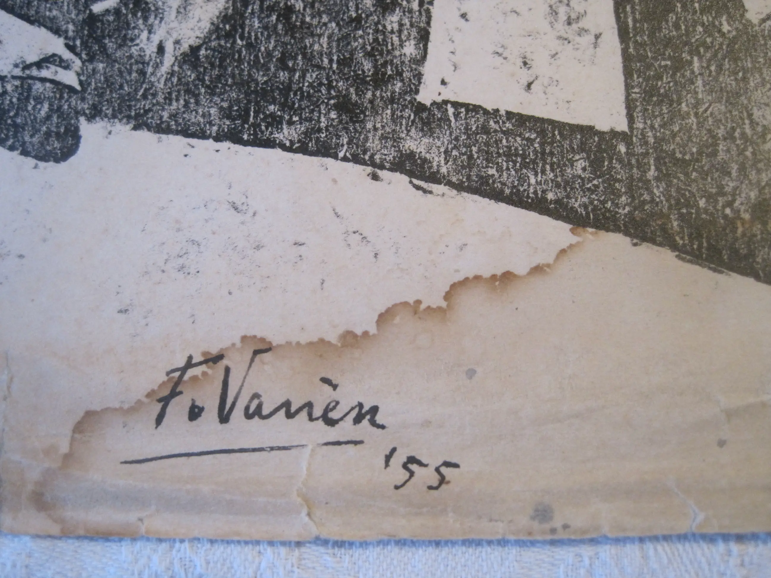 Vroeg expressionistisch werk van Frits Vanen (1933). Het betreft een een hout of linodruk op papier uit 1955. Het papier is aan de rand beschadigd en heeft vlekken ( zie de foto's ), maar de voorstelling is onbeschadigd.