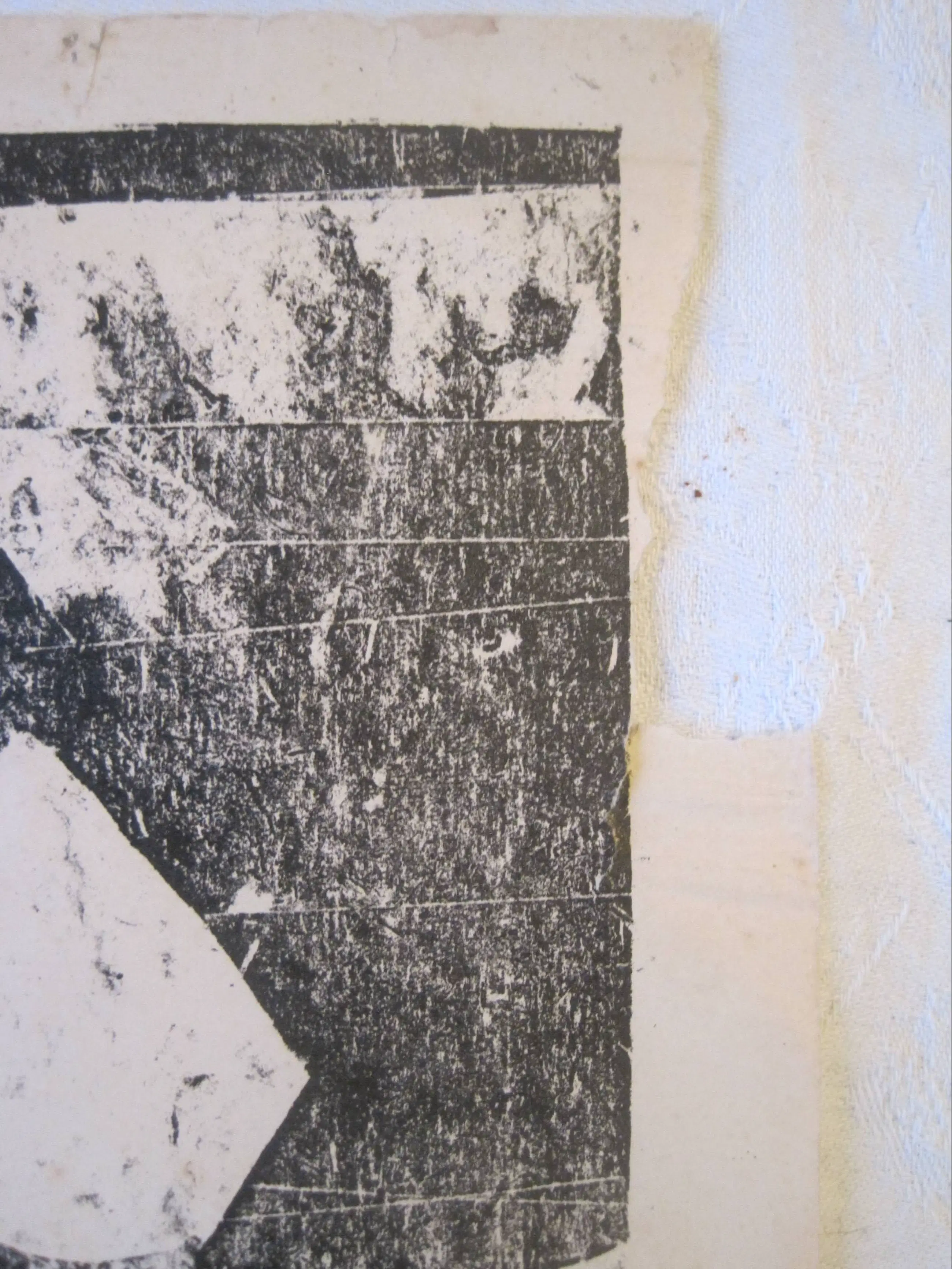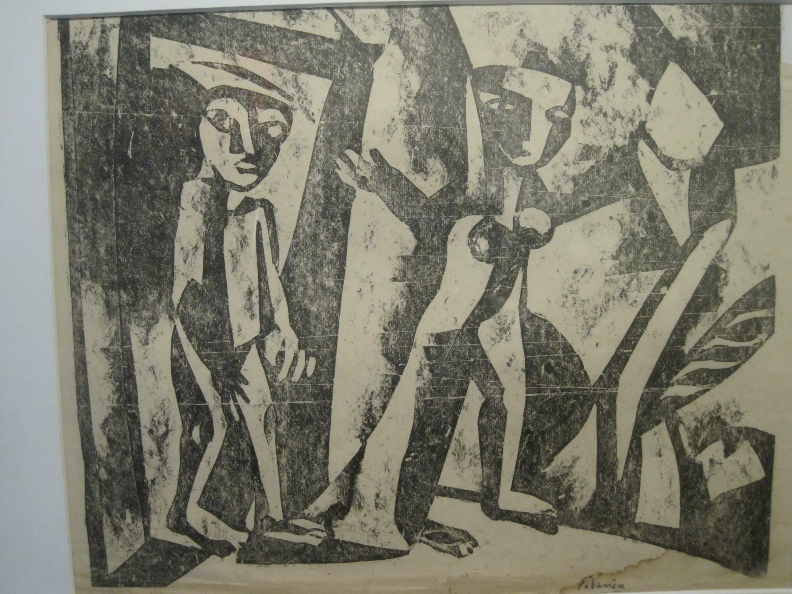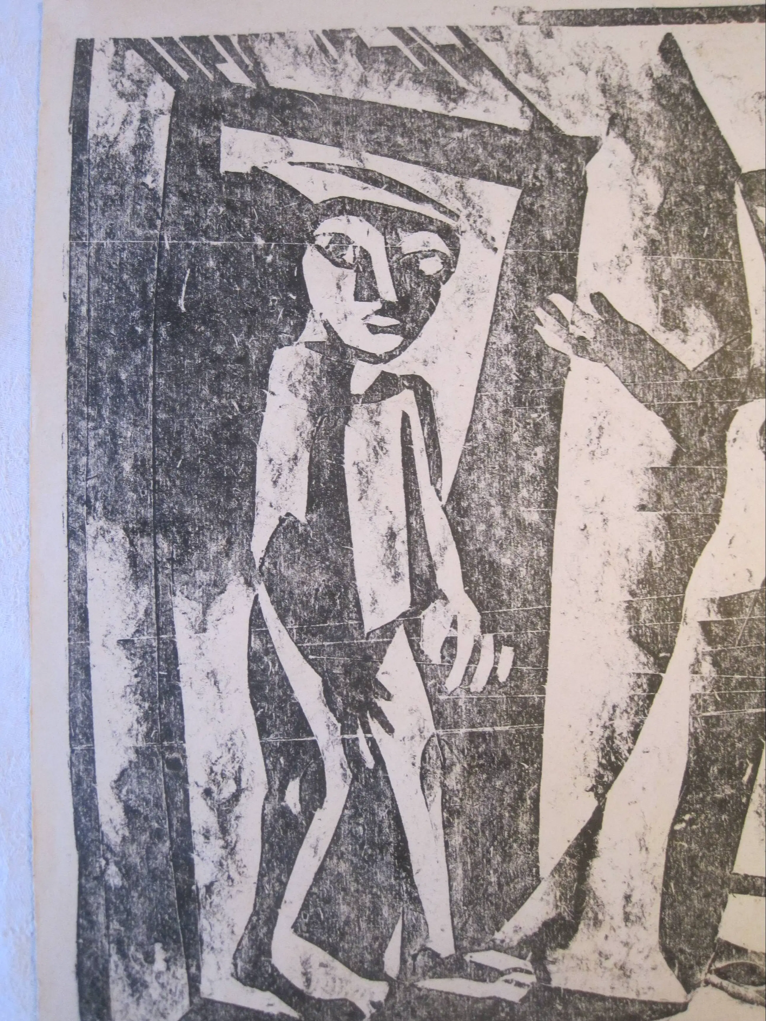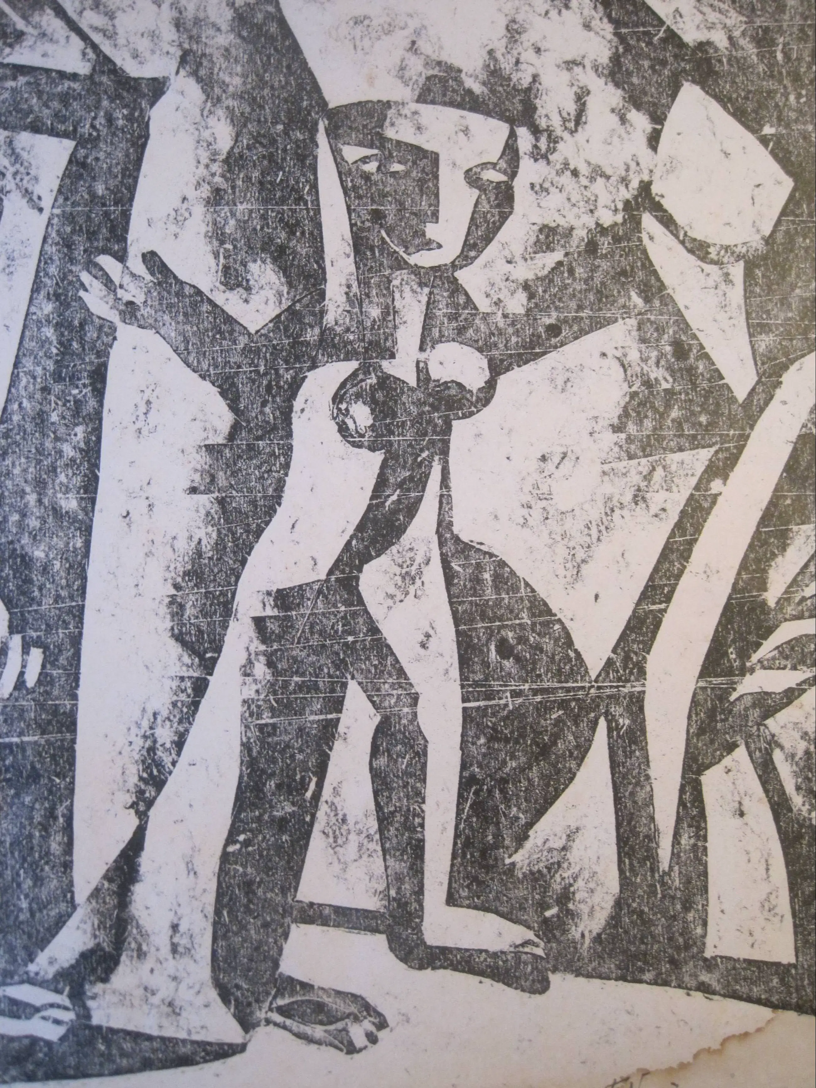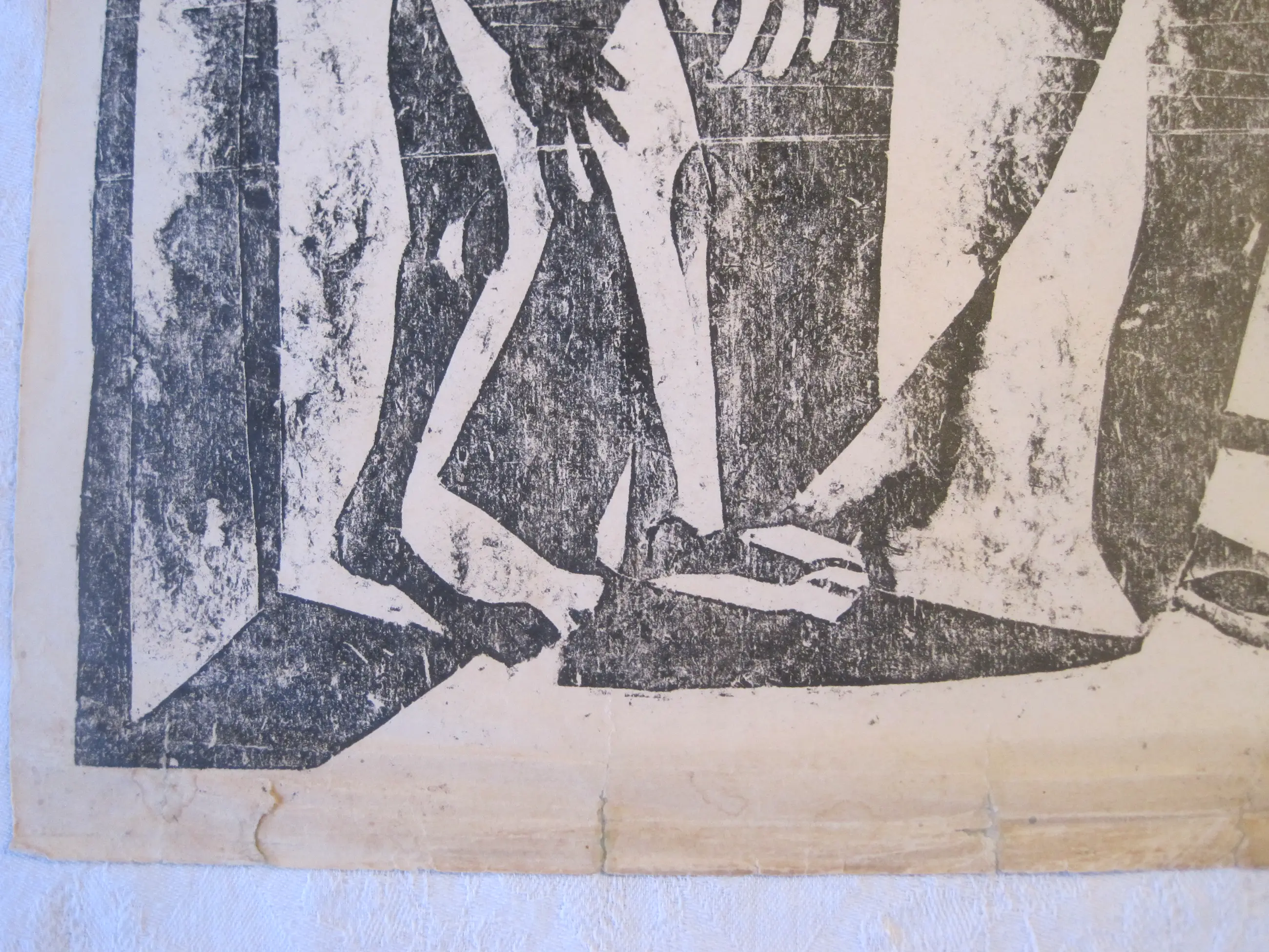 Vroeg expressionistisch werk van Frits Vanen (1933). Het betreft een een hout of linodruk op papier uit 1955. Het papier is aan de rand beschadigd en heeft vlekken ( zie de foto's ), maar de voorstelling is onbeschadigd.