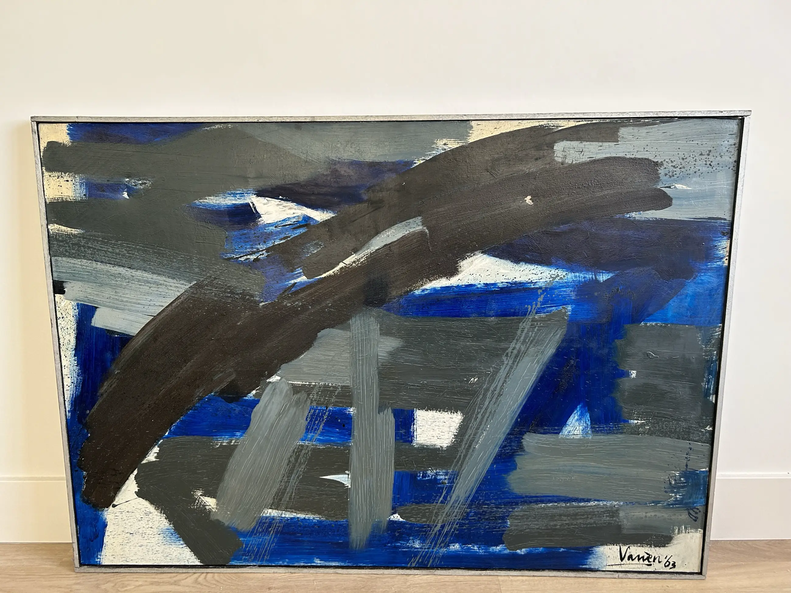 2 beschadigingen op het doek: bovenin links op de bruine verf en bovenin rechts op de grijze verf. Doek ik heel.