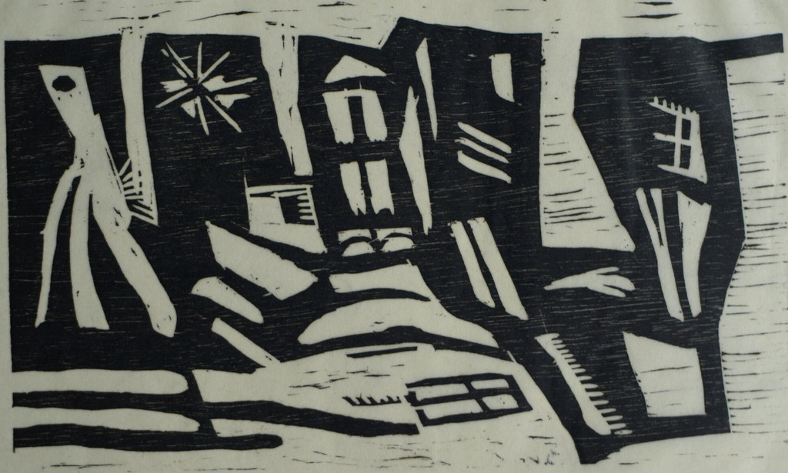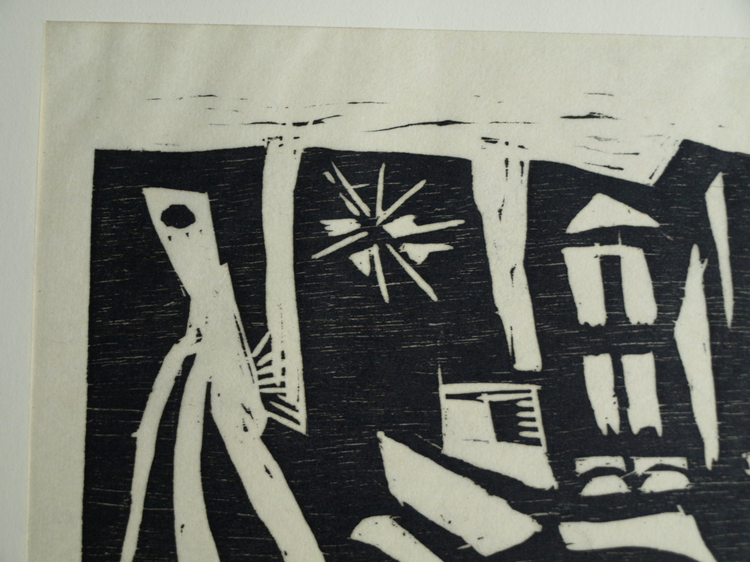 Techniek: Druk van een houtsnede op papier.