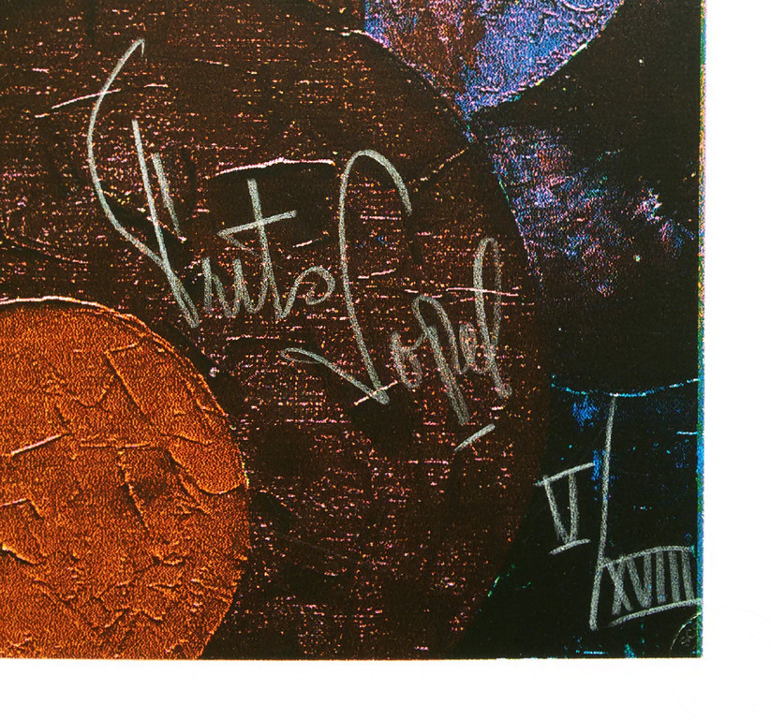 Kleurrijk, spannend werk van Frits Vogel. Een SF-achtig landschap dat zo als illustratie in een boek van Asimov gebruikt kan worden. Zeefdruk op dik papier, met potlood gesigneerd en genummerd (V/XVIII = 5/18). In zeer goede conditie, alleen wat vouwtjes in de uiterste witte marge rechts en linksonder. Ingelijst met passe-partout is het werk perfect.
