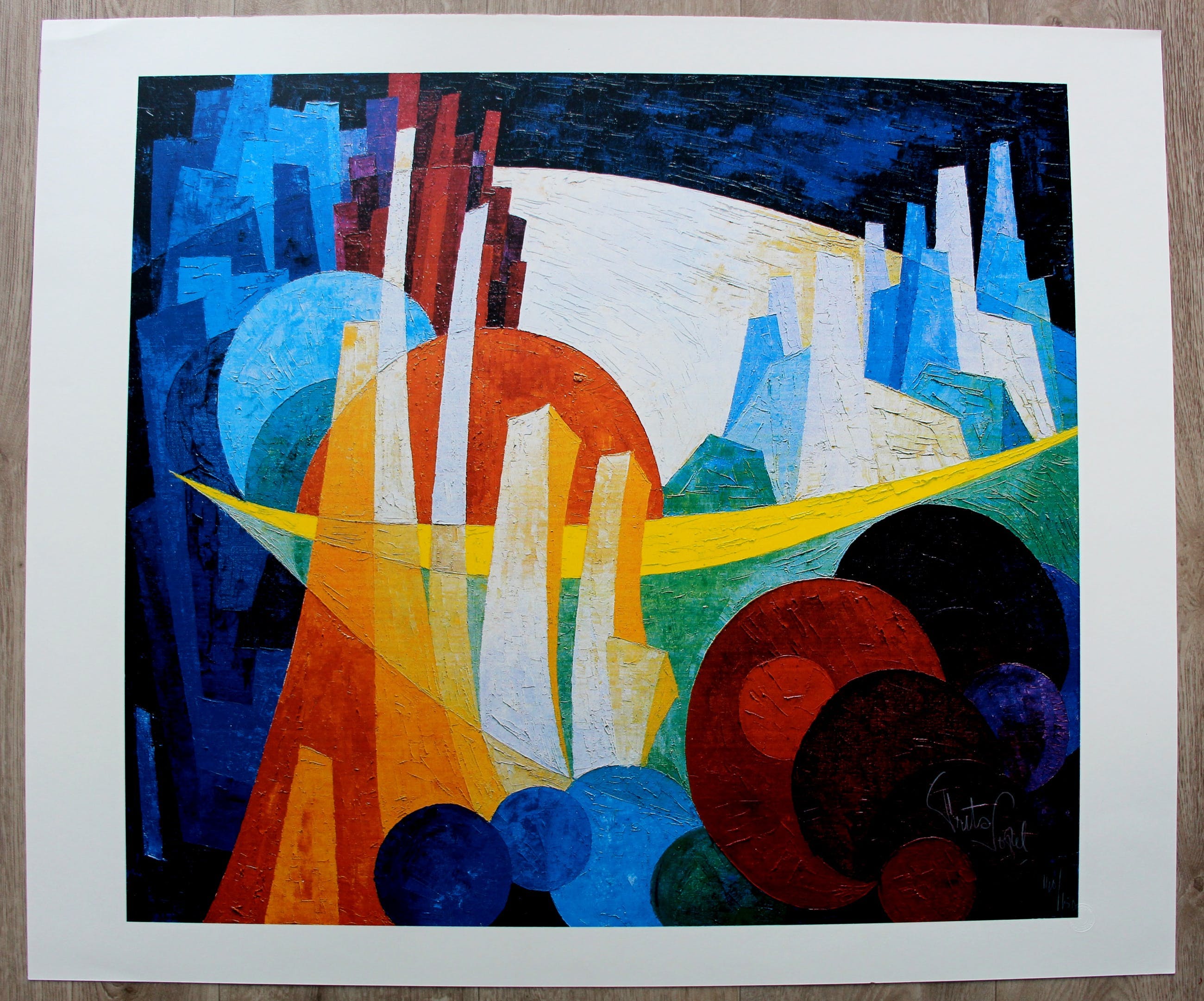 Zeefdruk van Frits Vogel. Geometrische compositie. Nummer: 138/150 . (nummer kan afwijken van het getoonde nummer op de foto). Afmetingen blad: H75.5 x b89.5. Afmetingen voorstelling H65.5 x b73.5. Het werk is rechtsonder met potlood gesigneerd door de kunstenaar. De authenticiteit van het aangeboden werk wordt volledig gegarandeerd. Een certificaat van echtheid kan, op aanvraag, worden gemaild.