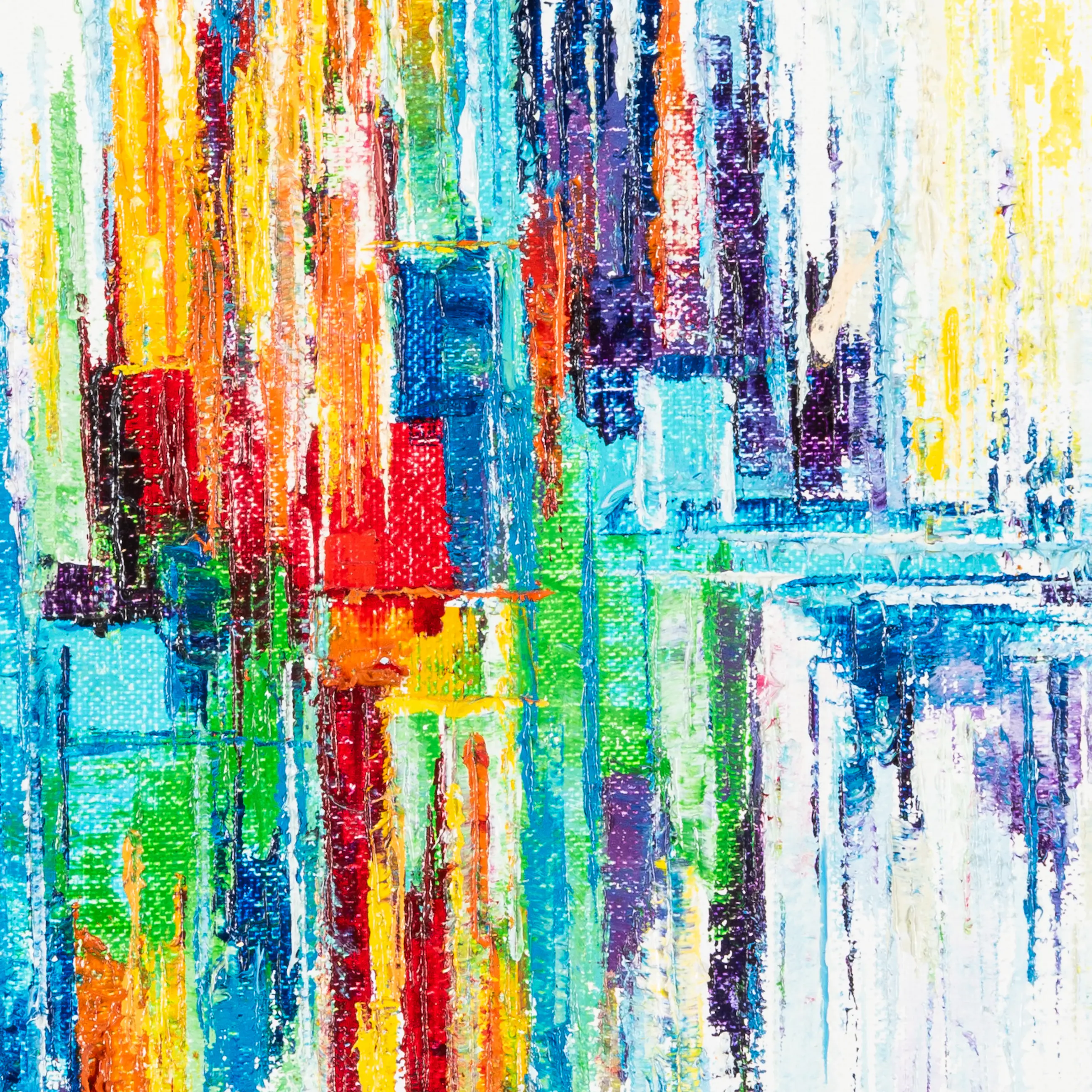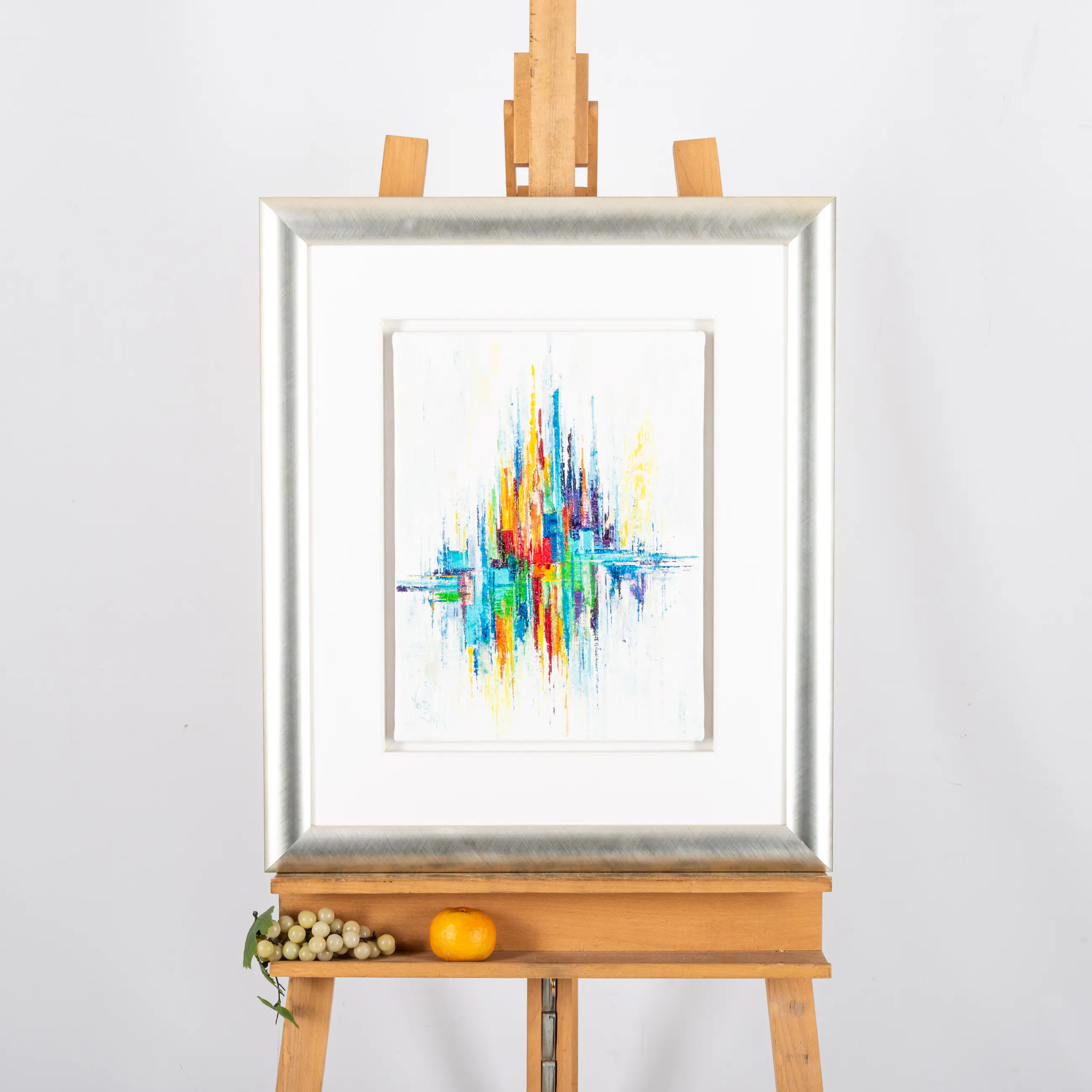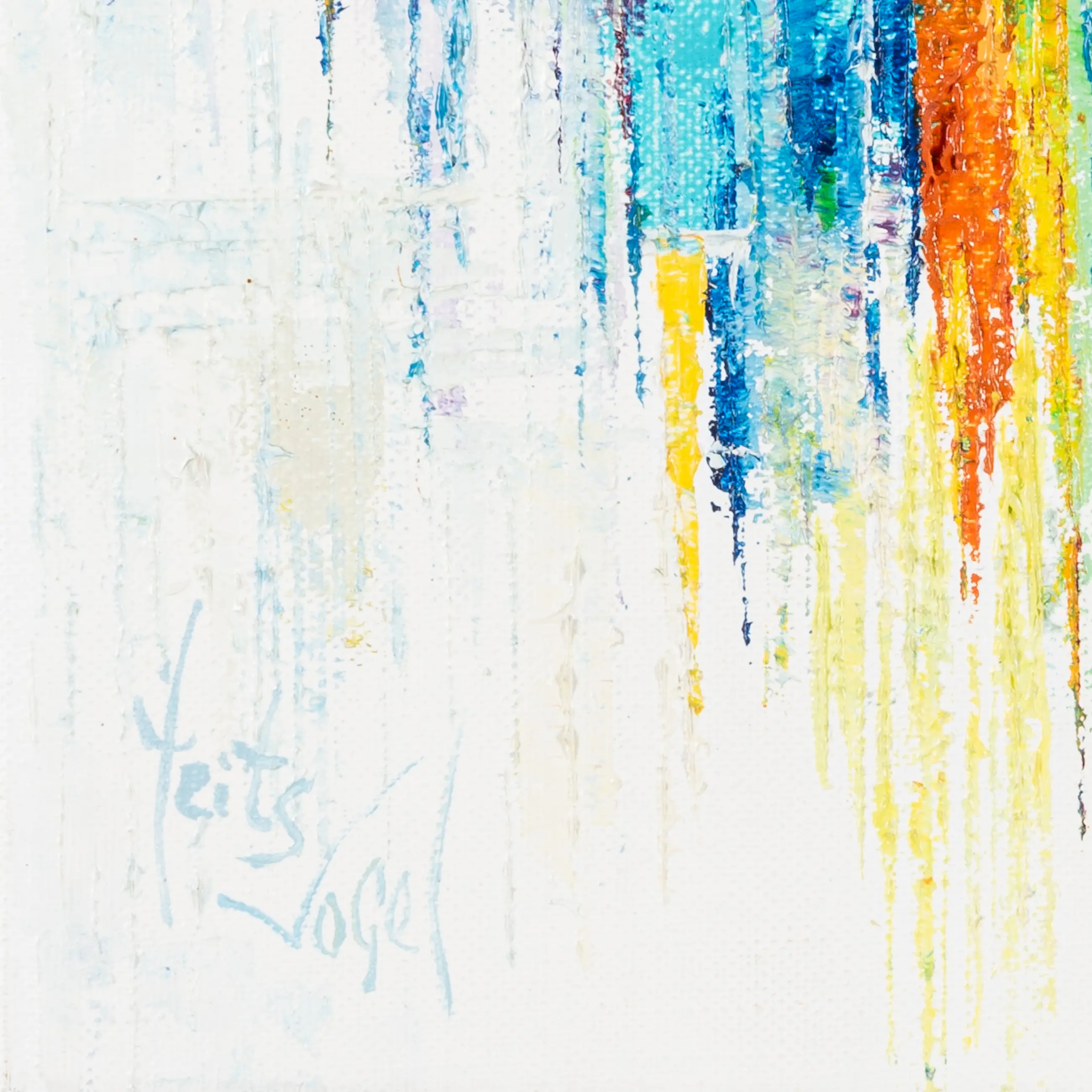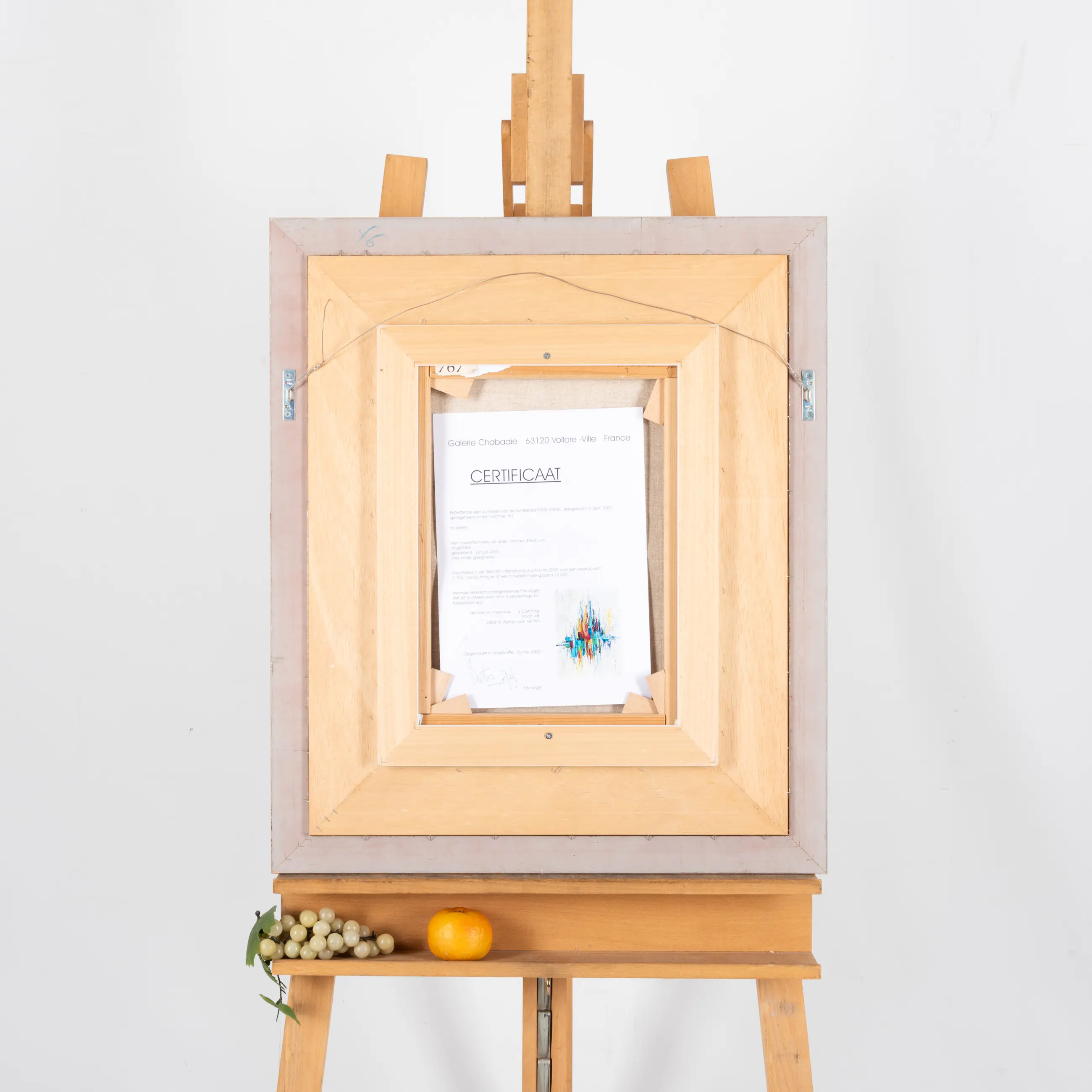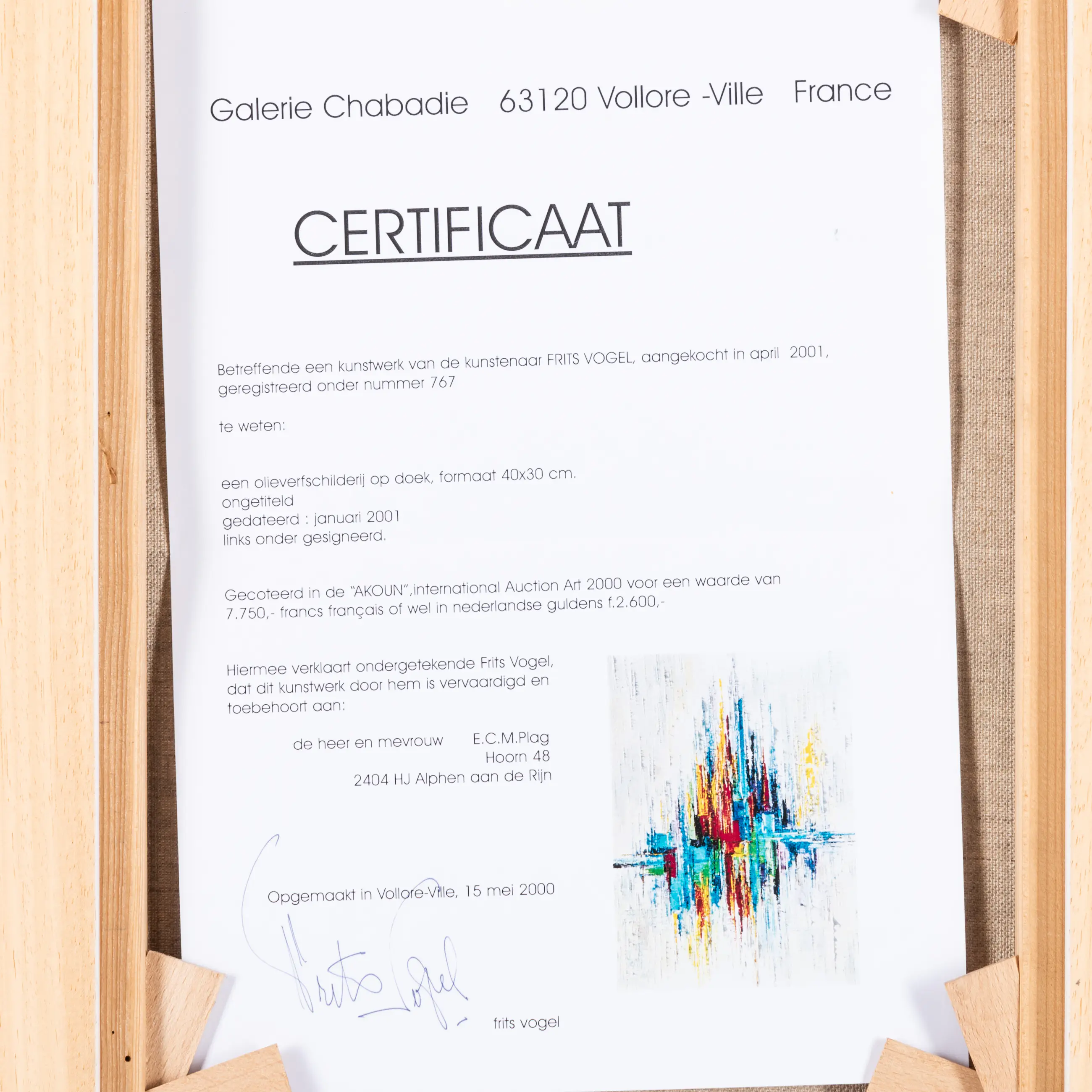 Dit abstracte, kleurrijke werk van Frits Vogel weerspiegelt de expressieve stijl die hij in de loop van zijn carrière ontwikkelde. In 1957 vestigt Vogel zich als zelfstandig kunstenaar. Hij maakt aquarellen, stadsgezichten en landschappen naar de natuur, en verdient daarnaast bij door sieraden te ontwerpen voor exclusieve winkels, natuurarrangementen te maken voor de Bijenkorf en praalwagens te ontwerpen en decoreren voor diverse bloemencorso’s in Nederland — waarmee hij meerdere malen hoge onderscheidingen behaalt.