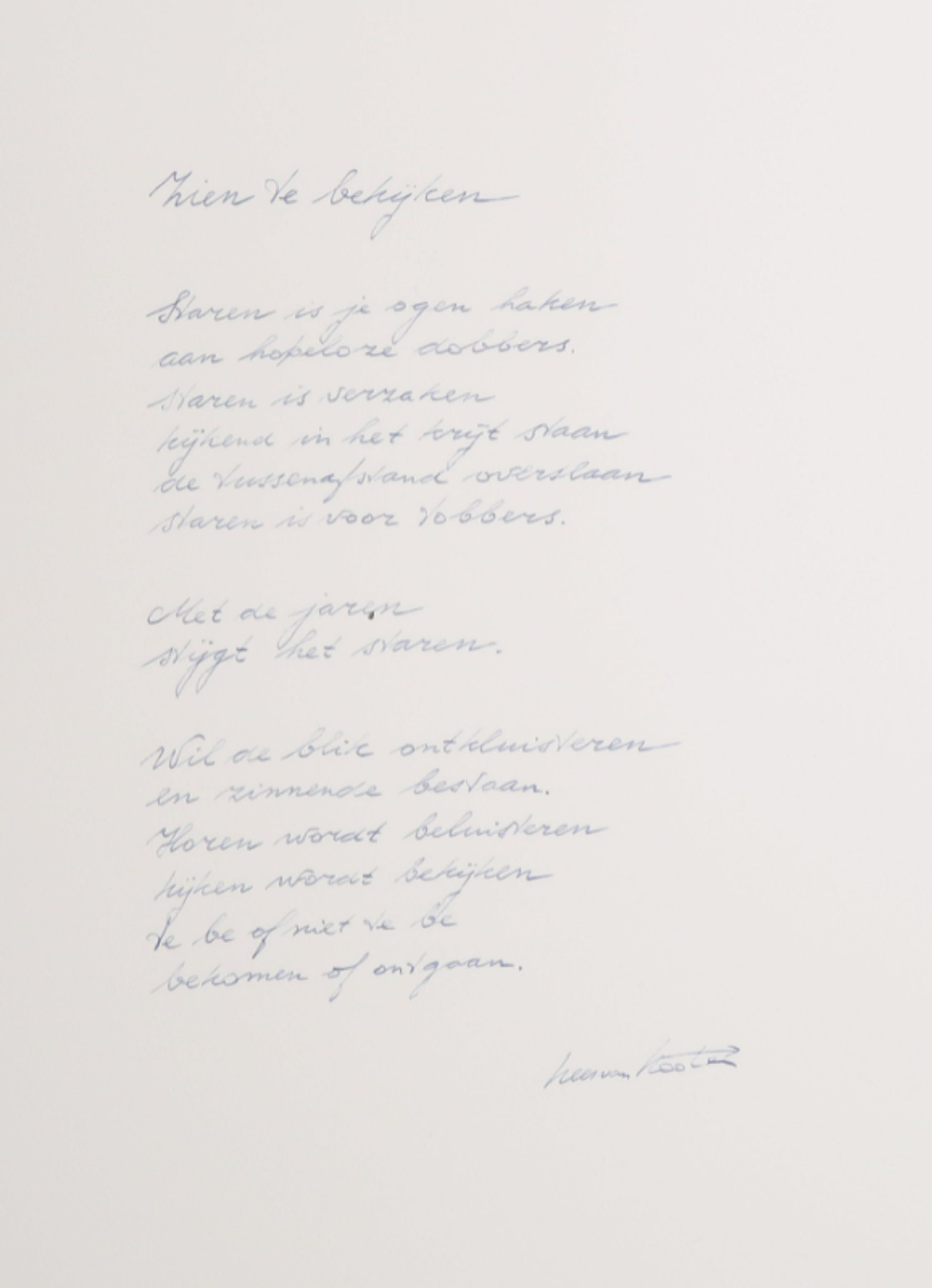 Voor het project Grafiek Nu 8 & Poëzie werden in totaal 28 gedichten en prenten uitgebracht. 7 dichters schreven 2 gedichten en nodigden vervolgens een kunstenaar uit om daarbij een beeld te creëren; 7 kunstenaars maakten ieder 2 prenten en nodigden een dichter uit om bij de prenten een gedicht te schrijven. De serie werd in 1998 uitgegeven door Singer Museum Laren/Galerie Clement/Galerie Petit, Amsterdam met een oplage van 50.