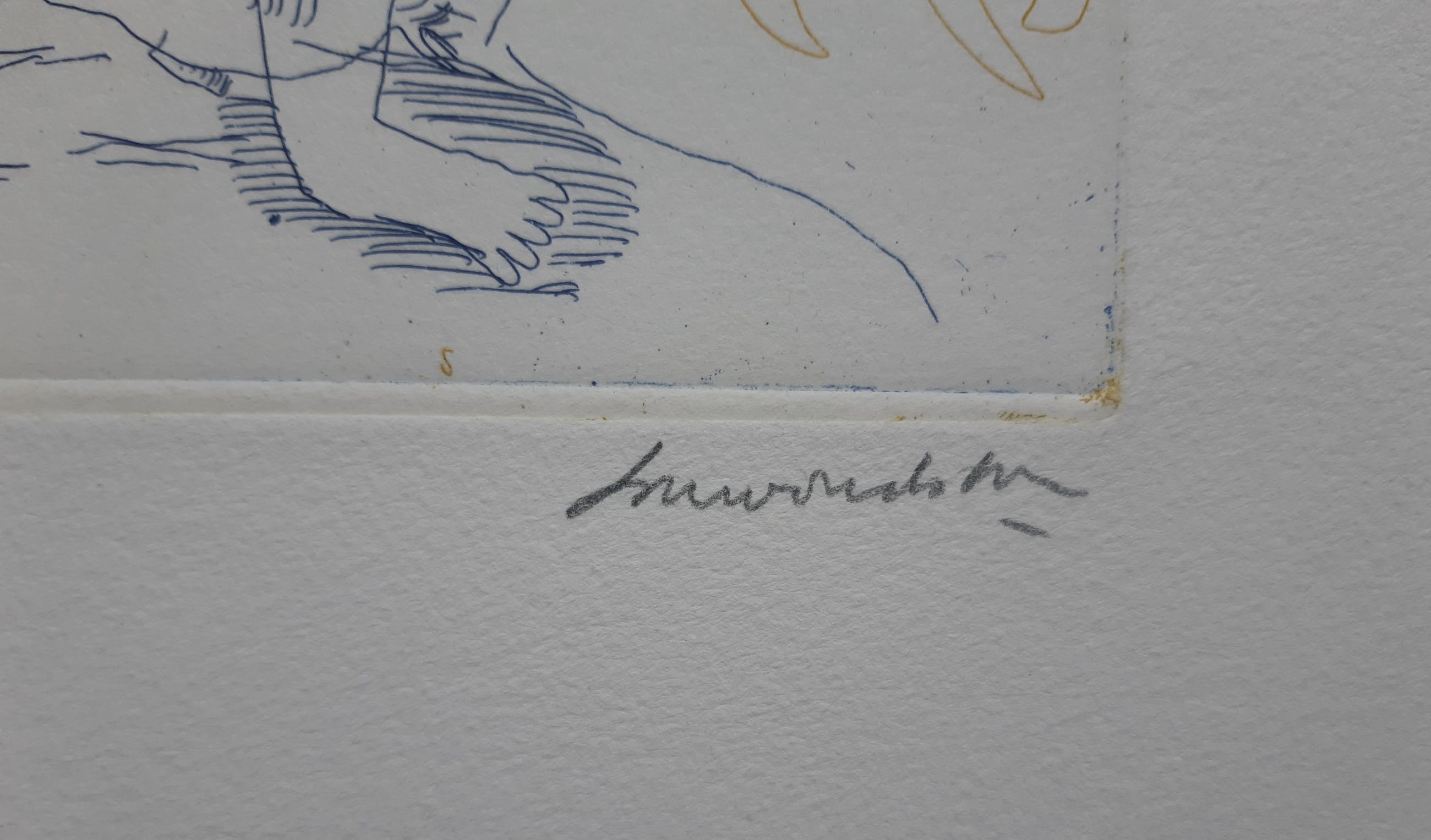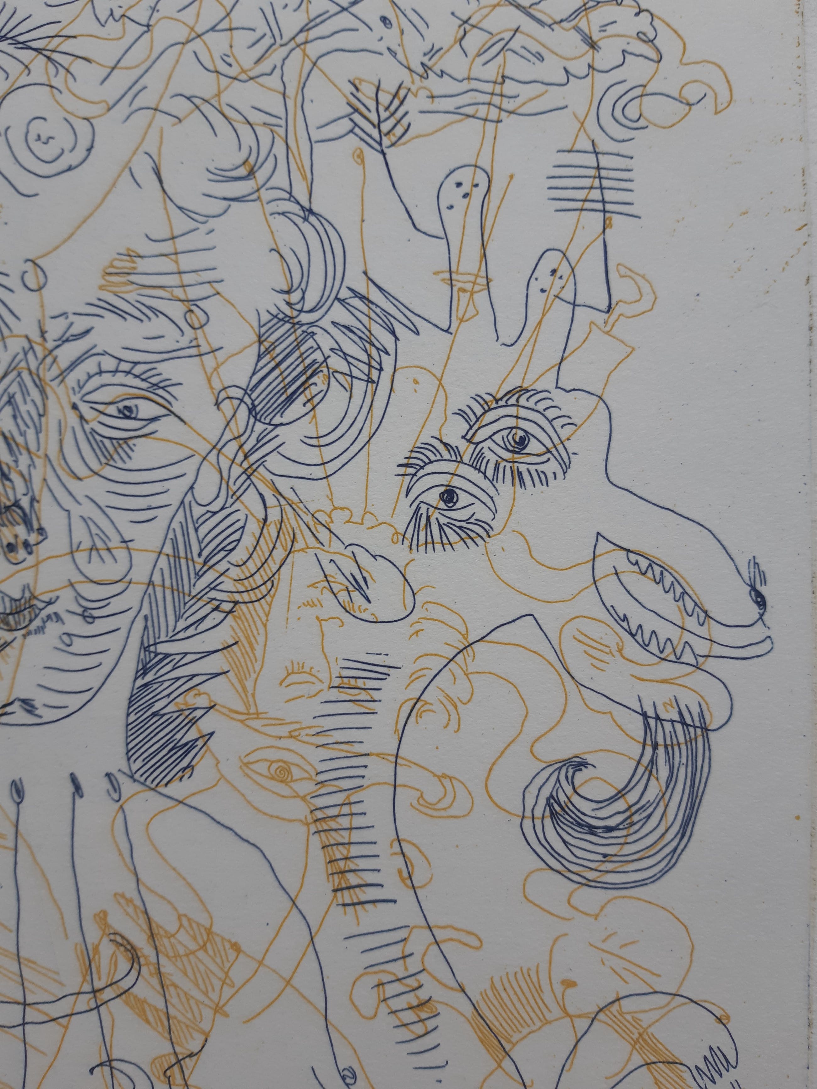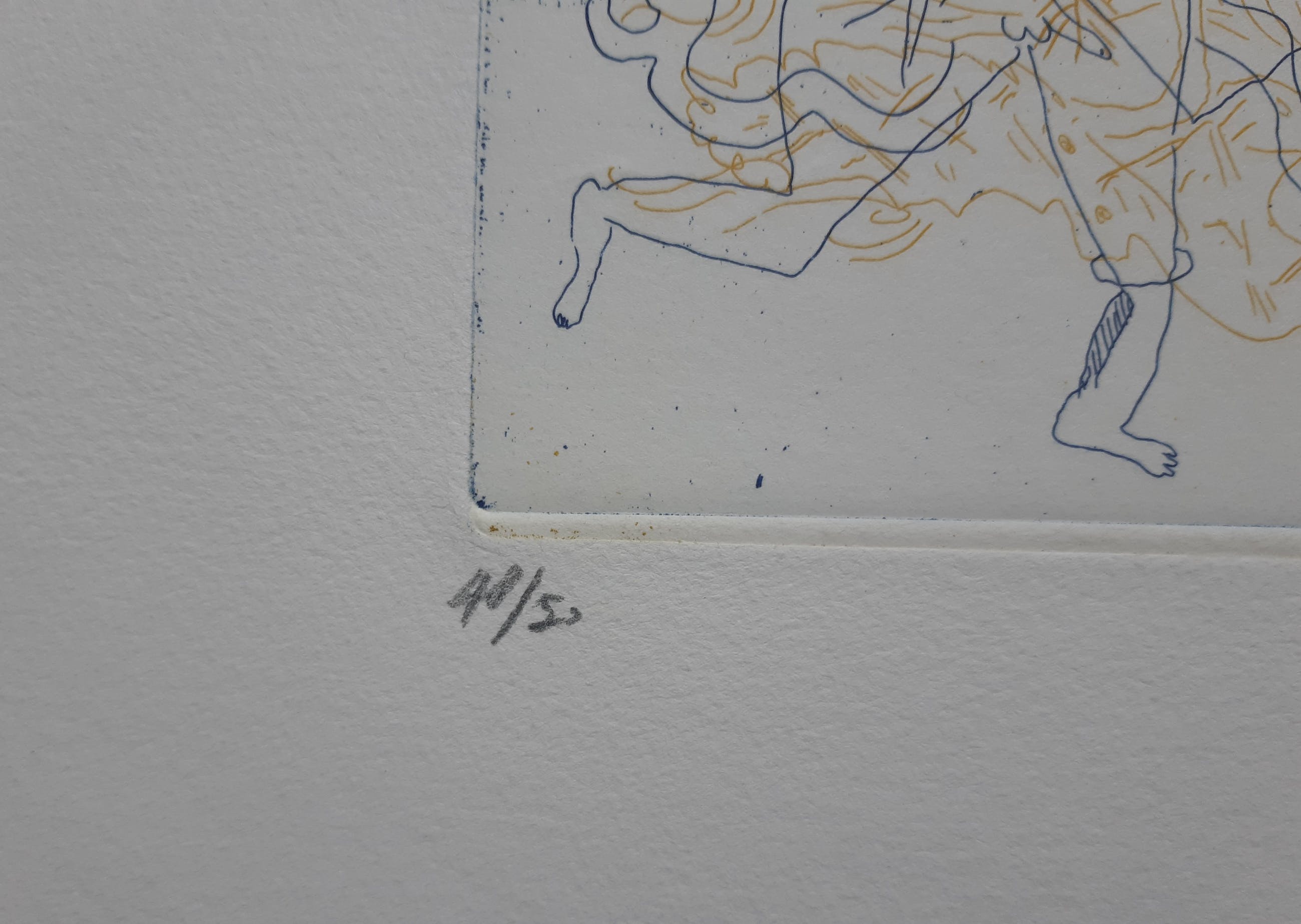 Ets van Frits Woudstra, twee maal afgedrukt, 1x in gele en 1x in blauwe inkt, 180 graden gedraaid te opzichte van elkaar. De ets is met potlood gesigneerd en genummerd 48 / 50. Gedrukt op geschept papier van 56 x 39 cm, dat is gemonteerd op een stevig kartonnen blad van 50 x 65 cm. De conditie van de ets is uitstekend.