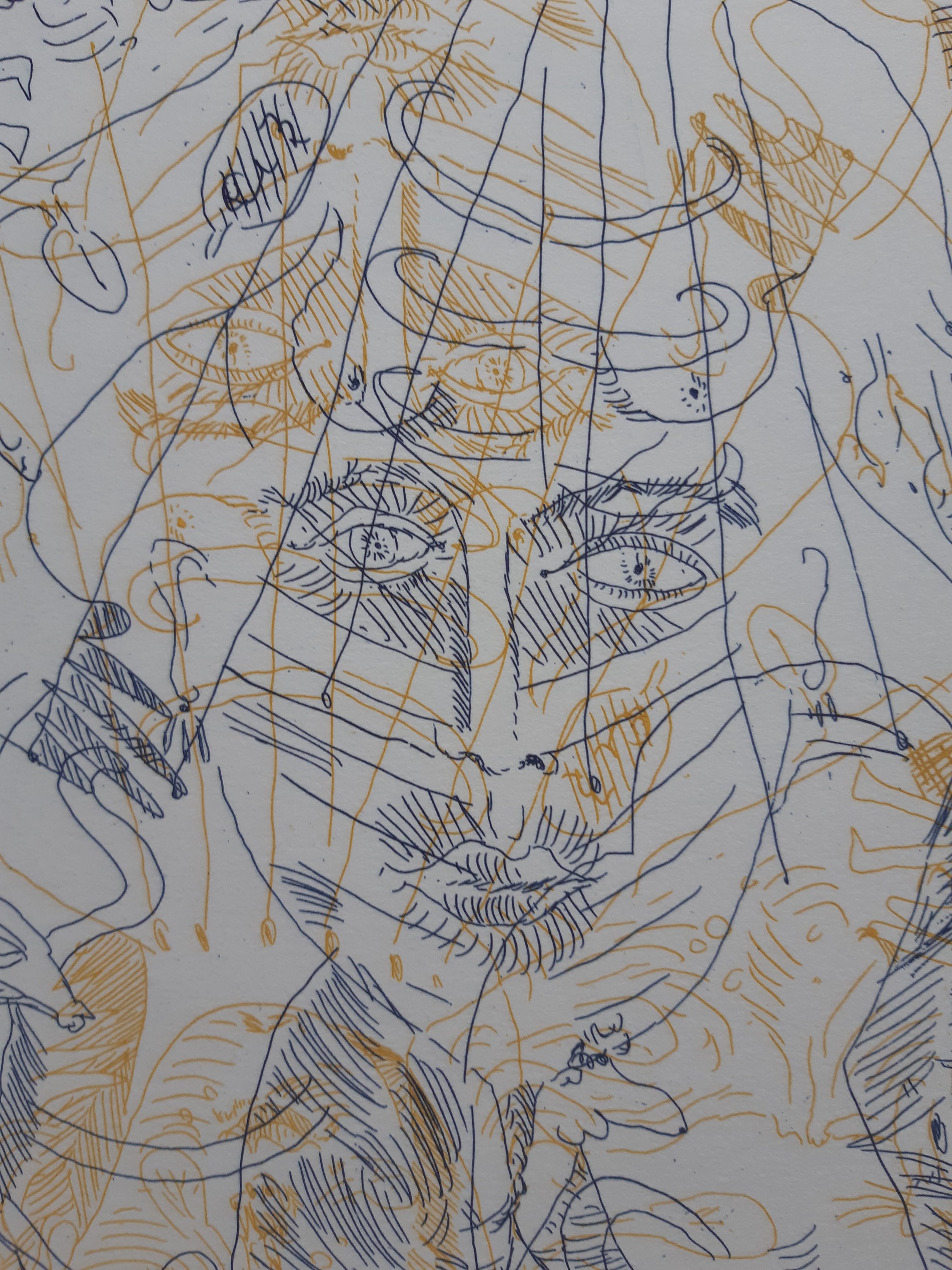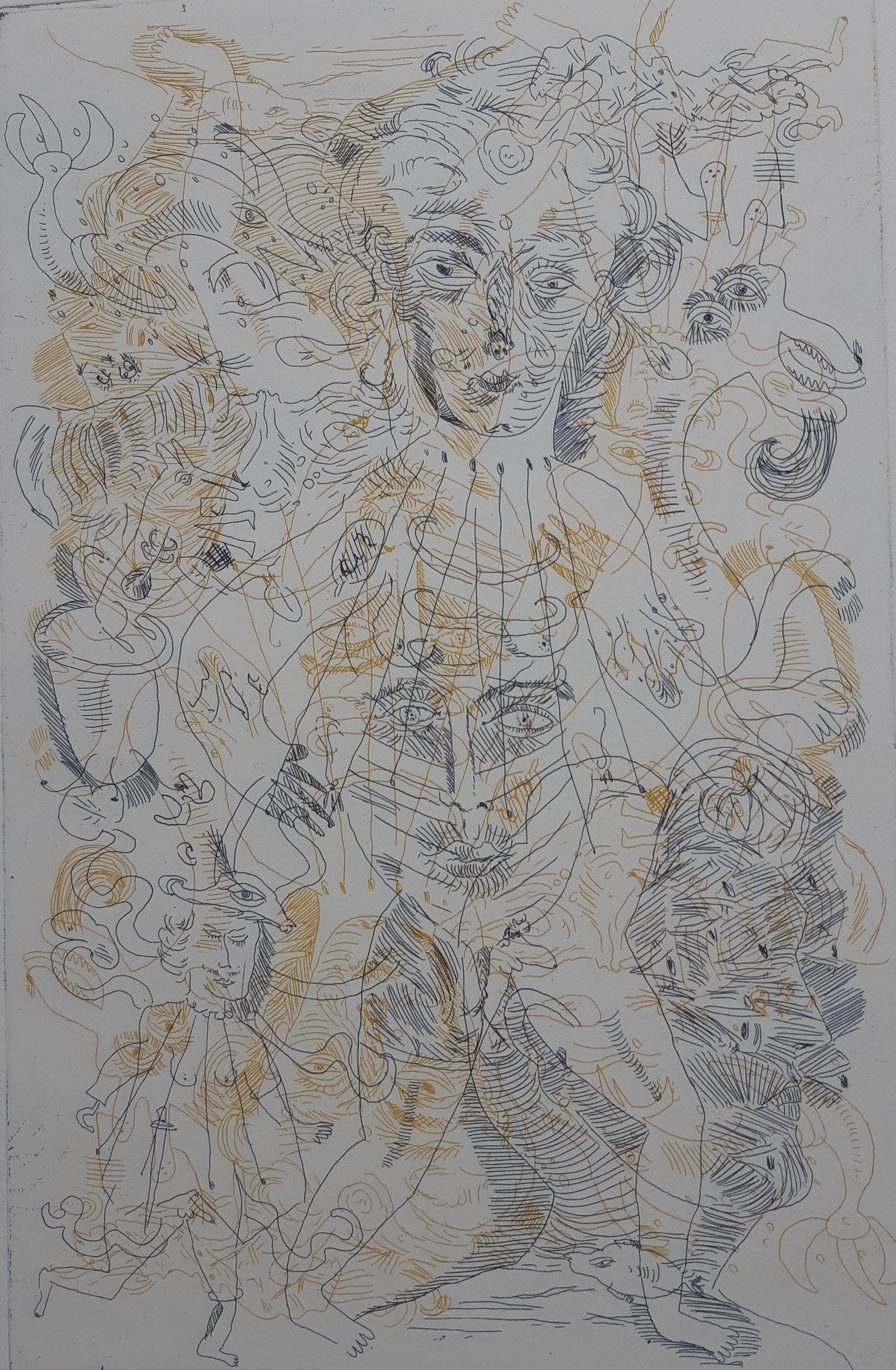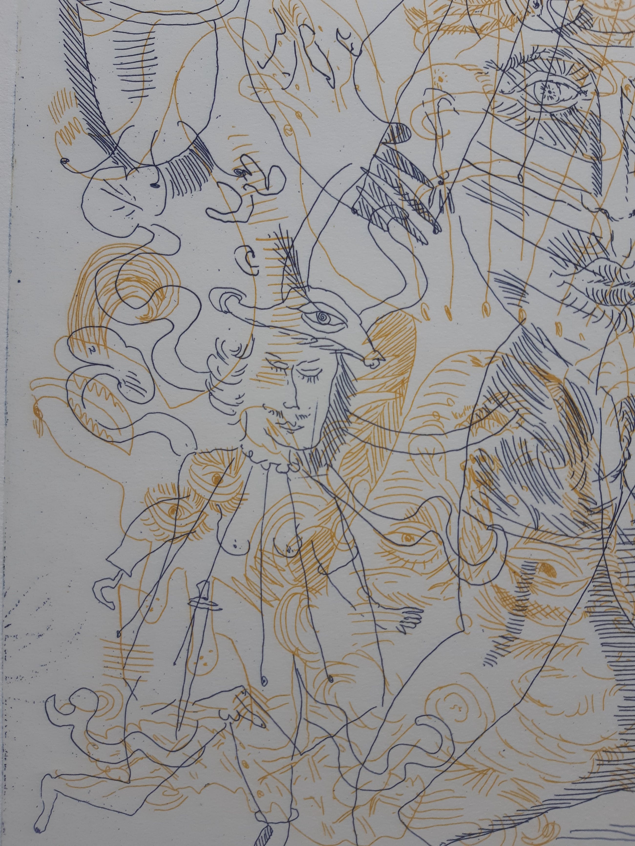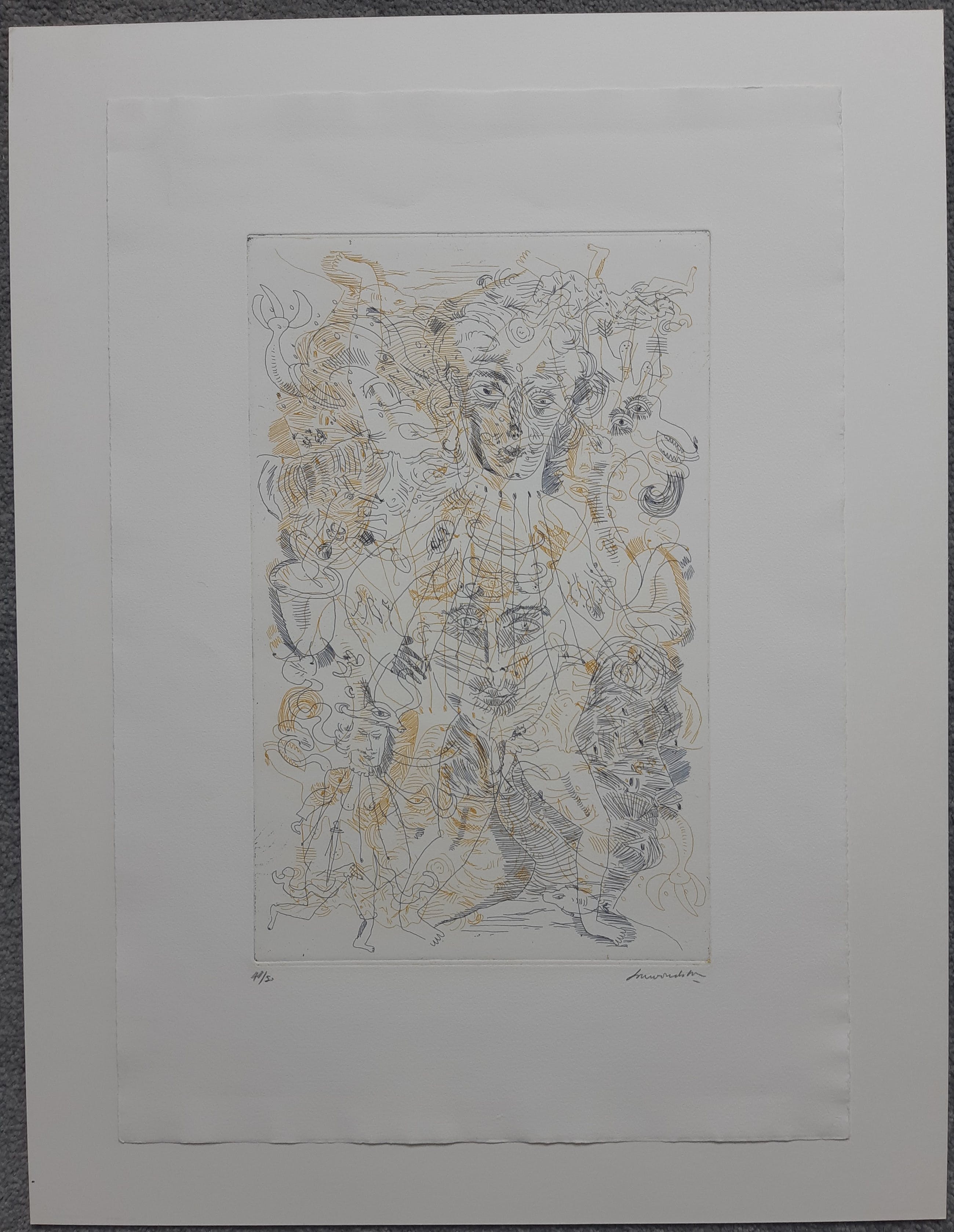 Ets van Frits Woudstra, twee maal afgedrukt, 1x in gele en 1x in blauwe inkt, 180 graden gedraaid te opzichte van elkaar. De ets is met potlood gesigneerd en genummerd 48 / 50. Gedrukt op geschept papier van 56 x 39 cm, dat is gemonteerd op een stevig kartonnen blad van 50 x 65 cm. De conditie van de ets is uitstekend.