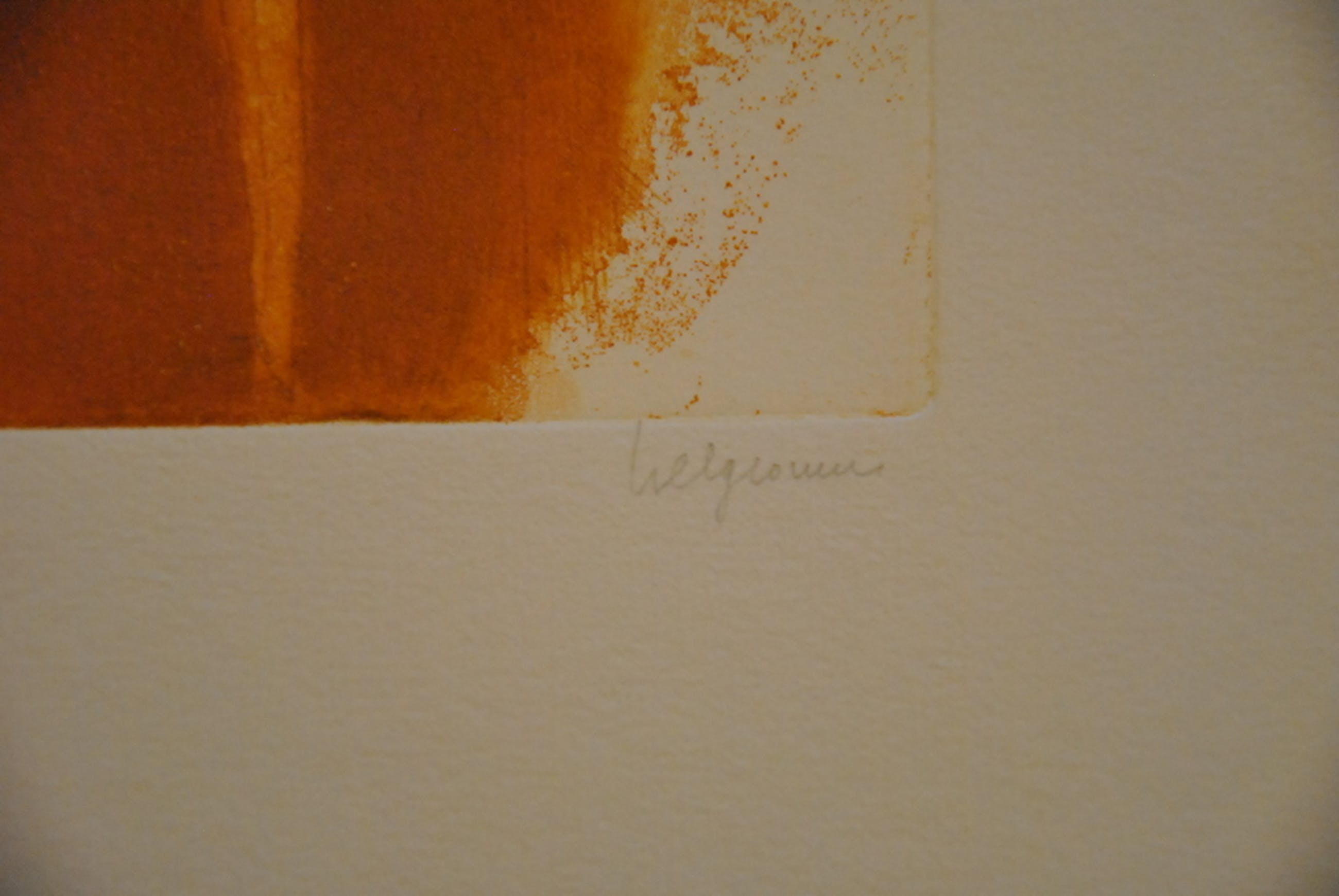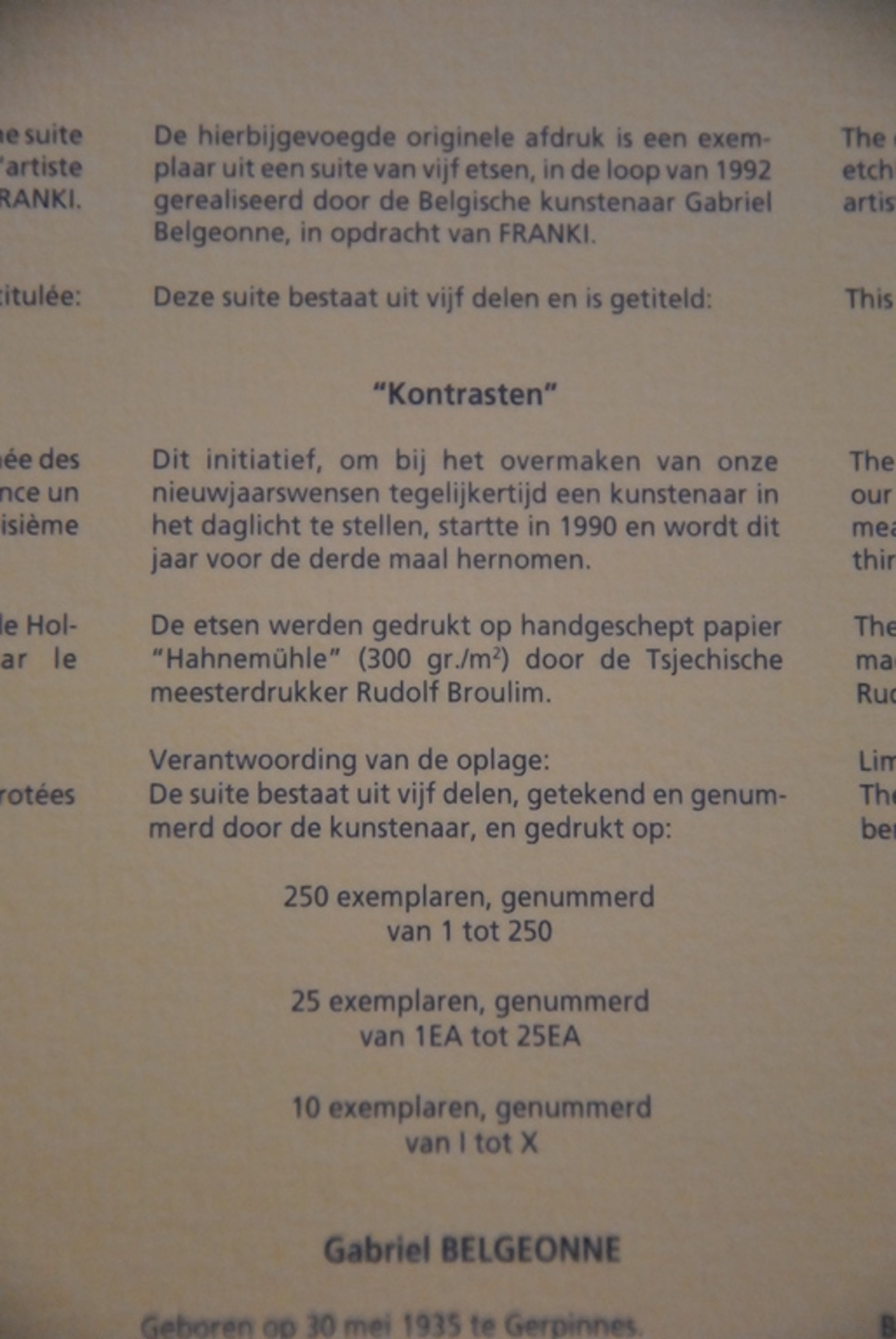 Het betreft de originele afdruk van een ets op A4-formaat, gerealiseerd door de Belgische kunstenaar Gabriel Belgeonne in 1992. Het is een exemplaar uit een suite van 5 delen, getiteld “Kontrasten”. De ets is getekend en genummerd door de kunstenaar. Het draagt nr. 204/250. Niet ingelijst.