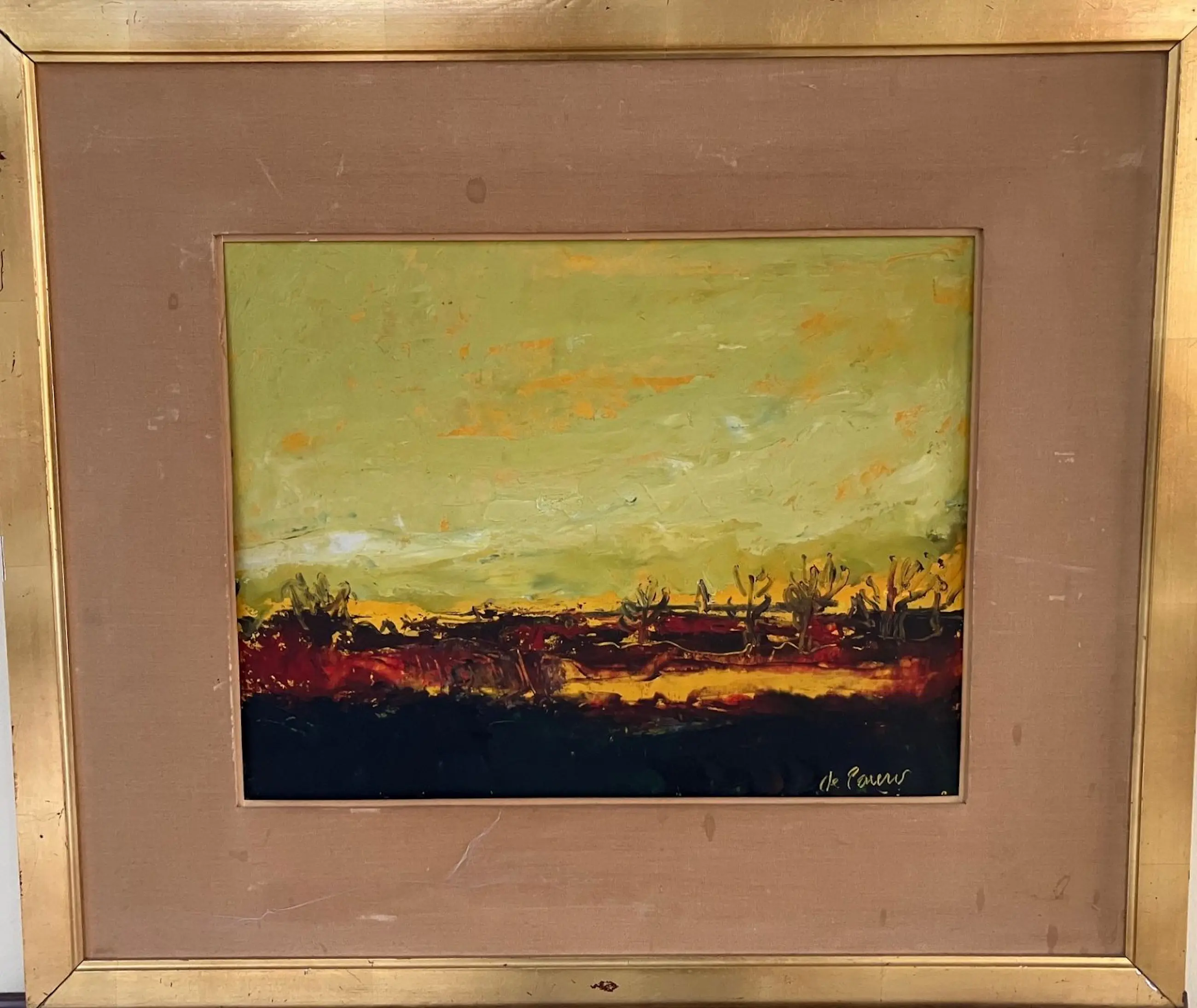 Avondlandschap - huidig kader is beschadigd - is op dun paneeltje geschilderd van ca 34x44 cm. Gemakkelijk te herkaderen in nieuwer en meer eigentijds kader dat past uw interieur