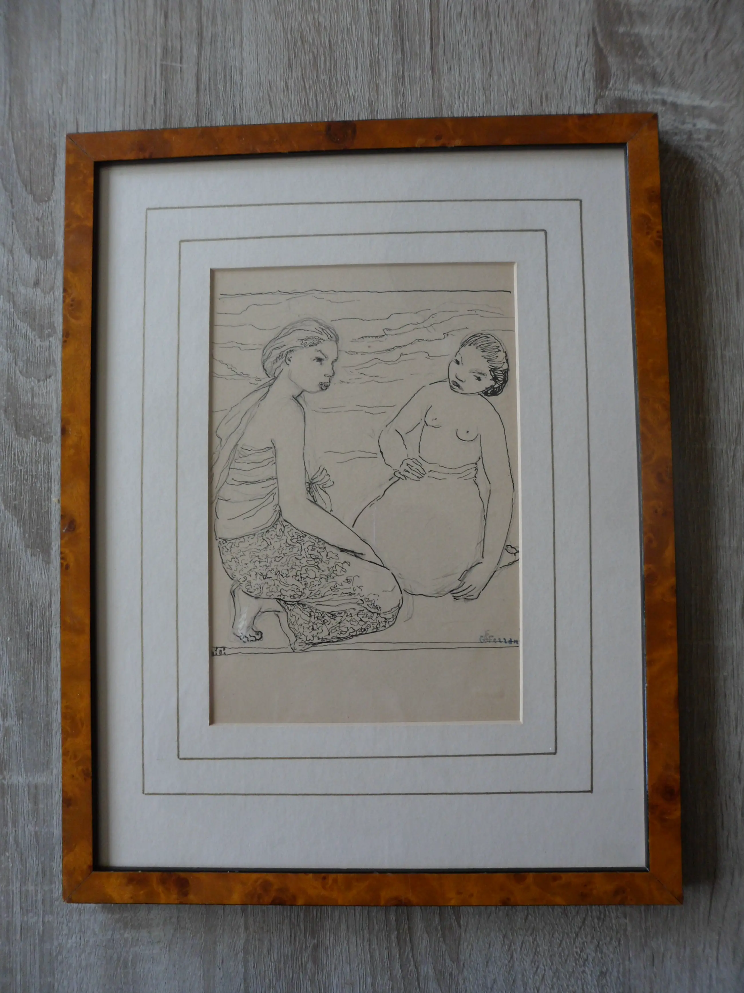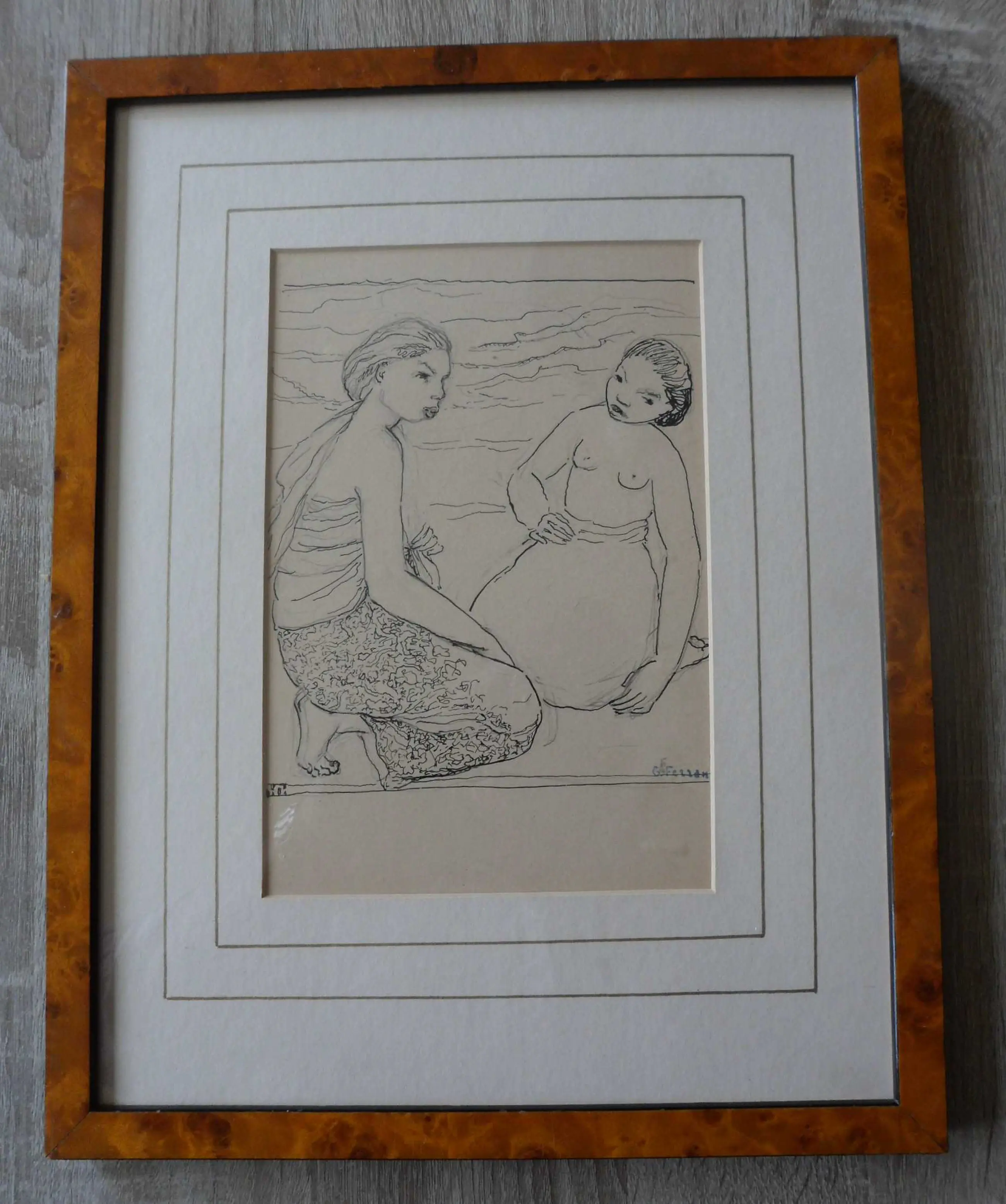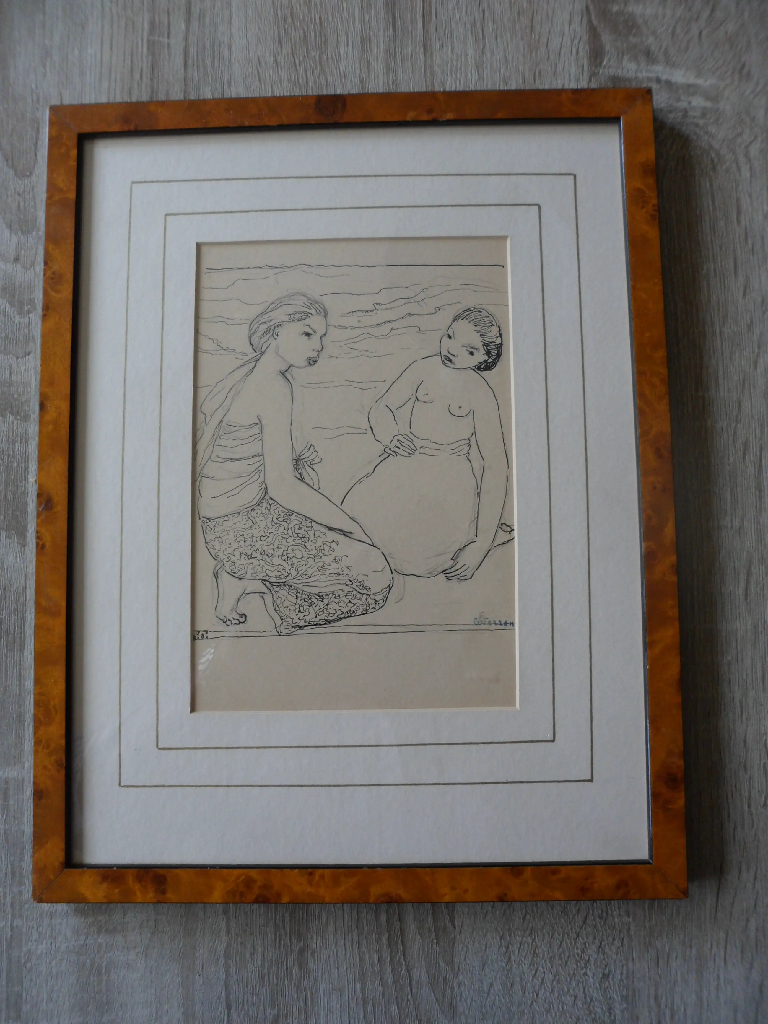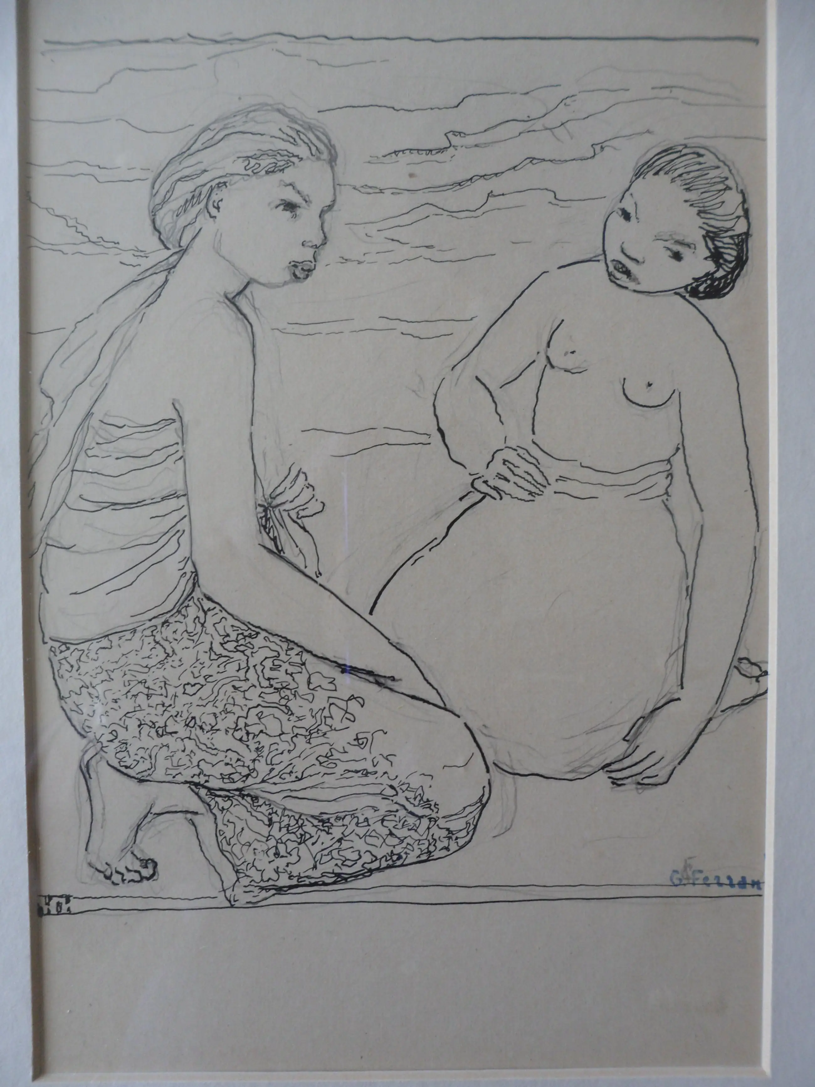 Hand gesigneerde pentekening Gelijst achter glas en in zeer goede staat. Gabrielle Ferrand werd geboren in Bordeaux in 1887 en volgde zijn opleiding aan de Ac. voor Beeldende Kunst ook in die plaats. Van 1922 tot 1925 reisde hij in Nederlandsch Indië op Java en Bali.Na 1925 vestigde hij zich in Parijs. Van 1923 tot 1936 was hij actief deelnemer aan De Bataafsche Kunstkringtentoonstelling. Hij werkte toen in impressionistische stijl. Ferrand wordt vermeld in het Lexicon of Artists of Indonesia blz. 89.