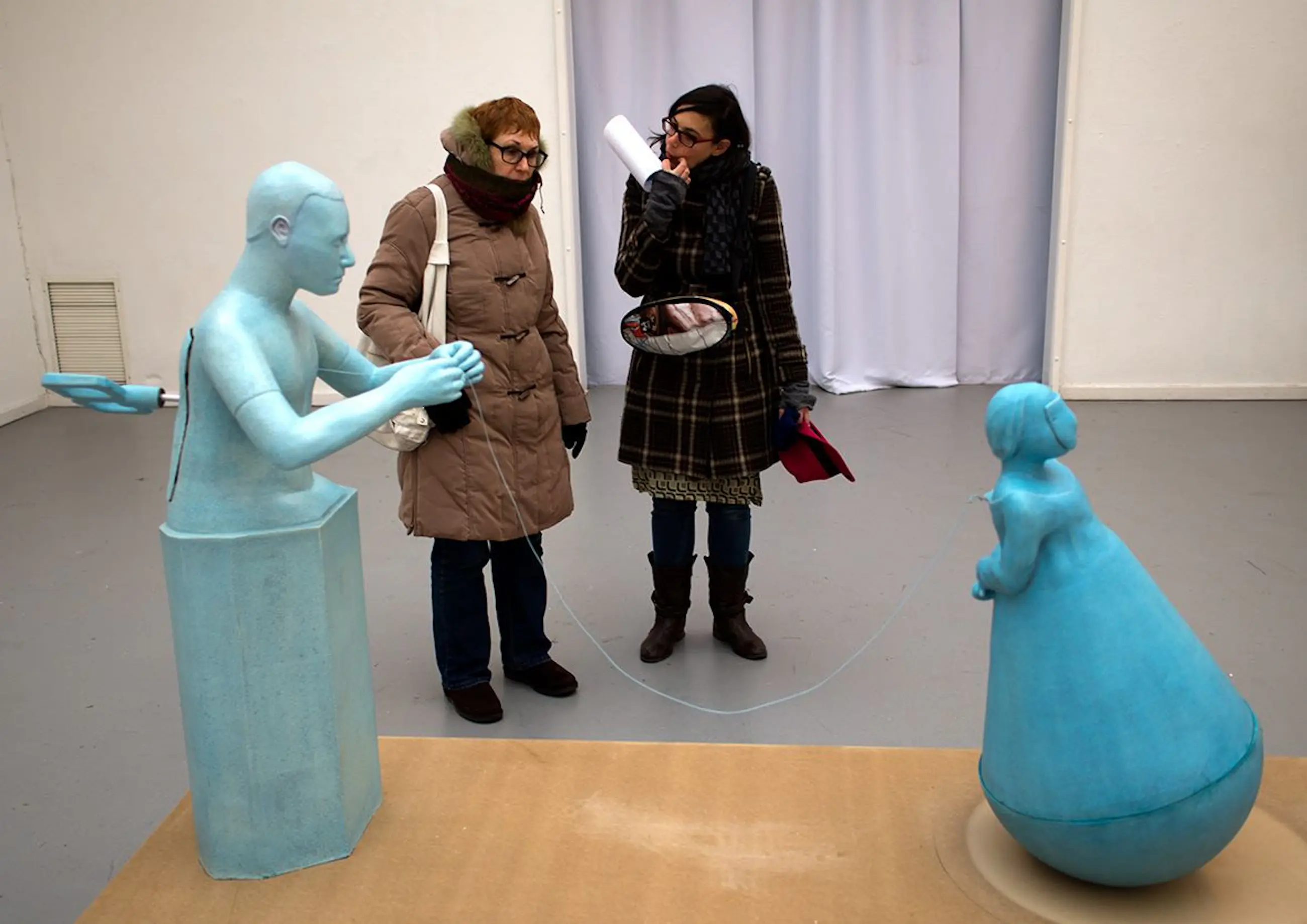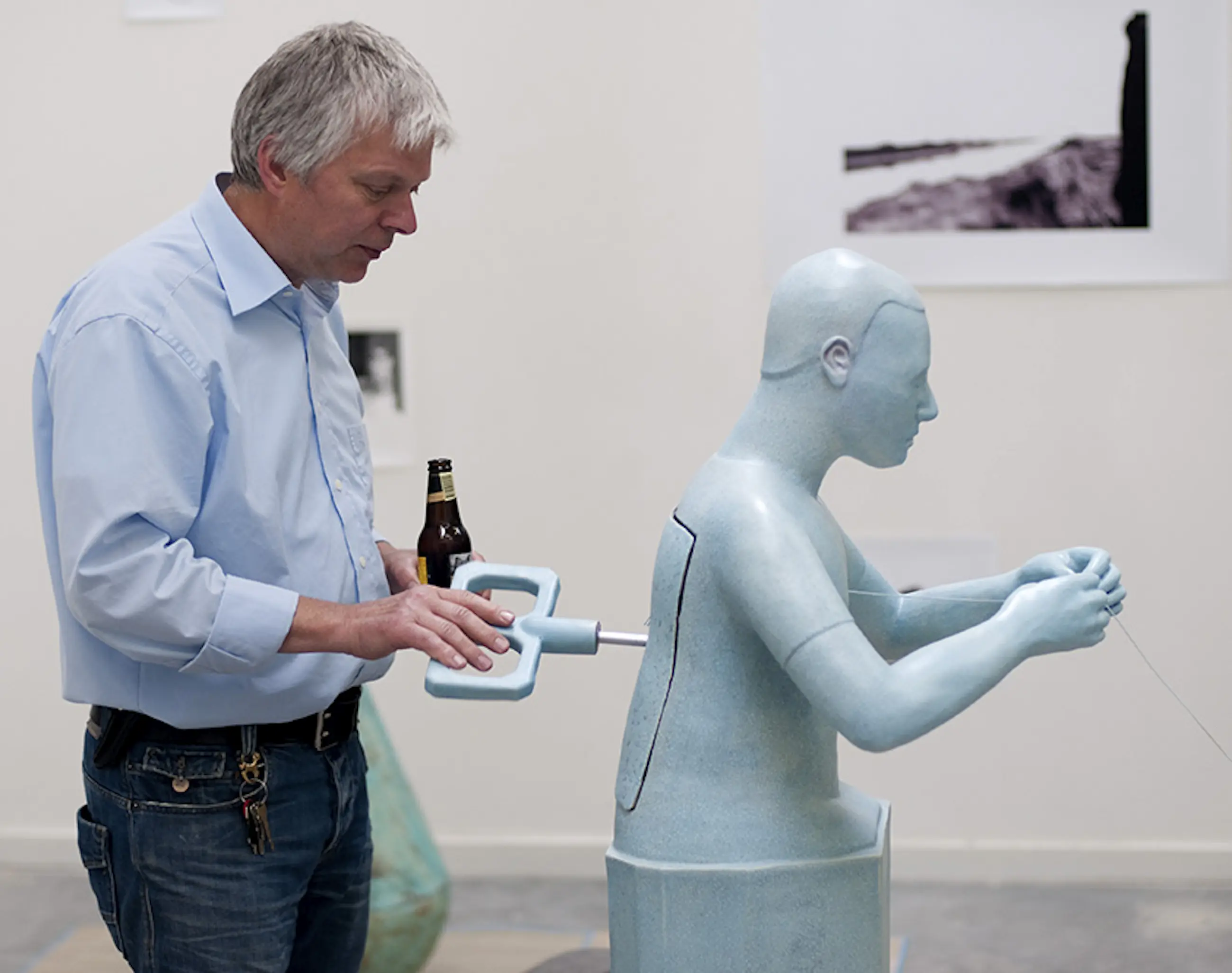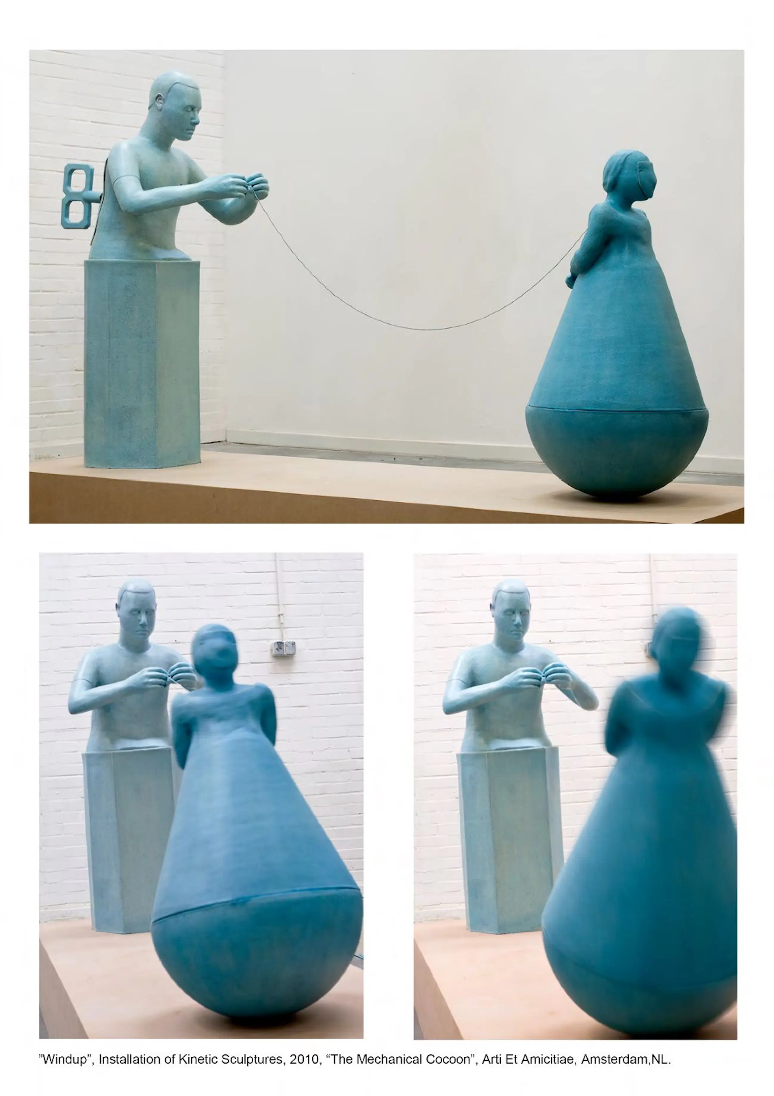 “WindUp” (Interactieve kinetische keramische sculptuur, 2011) onderzoekt de spanning tussen speelsheid en angst, en behandelt fragiliteit en de angst om los te laten binnen relaties. De kijker ziet een levensgrote keramische installatie die functioneert als een vergroot opwindbaar speelgoed. De installatie bestaat uit twee figuren. De ene is een mannelijke figuur met een sleutel in zijn rug. Vanuit zijn borst loopt een draad door zijn vingers naar de rug van een tweede figuur – een geblinddoekt meisje. Wanneer de kijker de sleutel drie keer draait, wordt het mechanisme geactiveerd: de draad spant zich aan en trekt het meisje naar een gevaarlijke plek, waarna ze plotseling wordt losgelaten. De sculptuur is op een subtiele, bijna magische manier interactief – ze komt pas tot leven wanneer de kijker ervoor kiest om mee te doen door haar op te winden. De figuren zijn volledig gemaakt van keramische klei en bedekt met een craqueléglazuur dat hun gevoel van kwetsbaarheid versterkt. Hun lichamen zijn zowel zwaar als fragiel, waardoor een intrigerende spanning ontstaat tussen de mechanische beweging en de delicate aard van het materiaal. In de keramische behuizing bevindt zich een hybride mechanisch en digitaal systeem, bestaande uit een krachtige motor, mechanische componenten, sensoren en een printplaat. Dit interne mechanisme weerspiegelt de eenvoudige logica van kleine opwindspeeltjes, maar dan vergroot en zichtbaar gemaakt door de schaal en het materiaal. Tijdens de tentoonstelling voelden bezoekers een sterke drang om herhaaldelijk met de installatie te "spelen". Elke cyclus – waarbij het draadje de figuur aantrekt en haar vervolgens loslaat in een zachte schommelende beweging – zorgde voor een gevoel van catharsis en versterkte de emotionele lading van het werk.