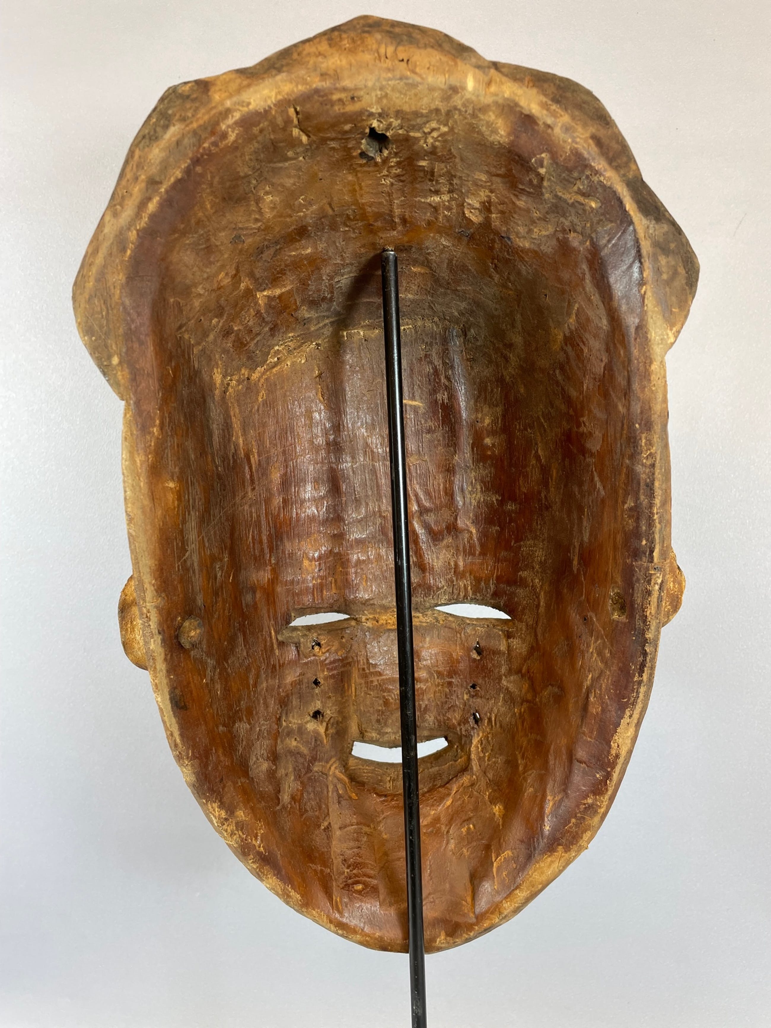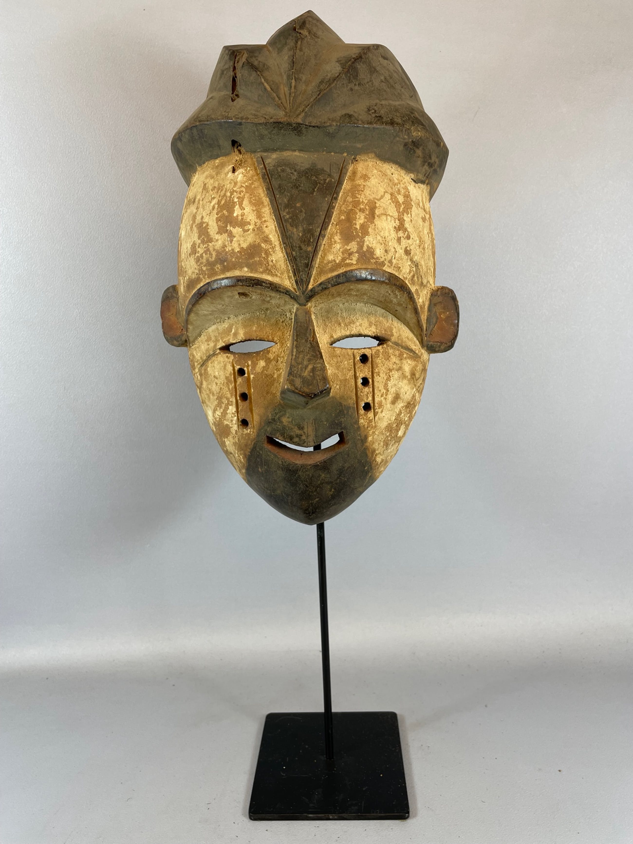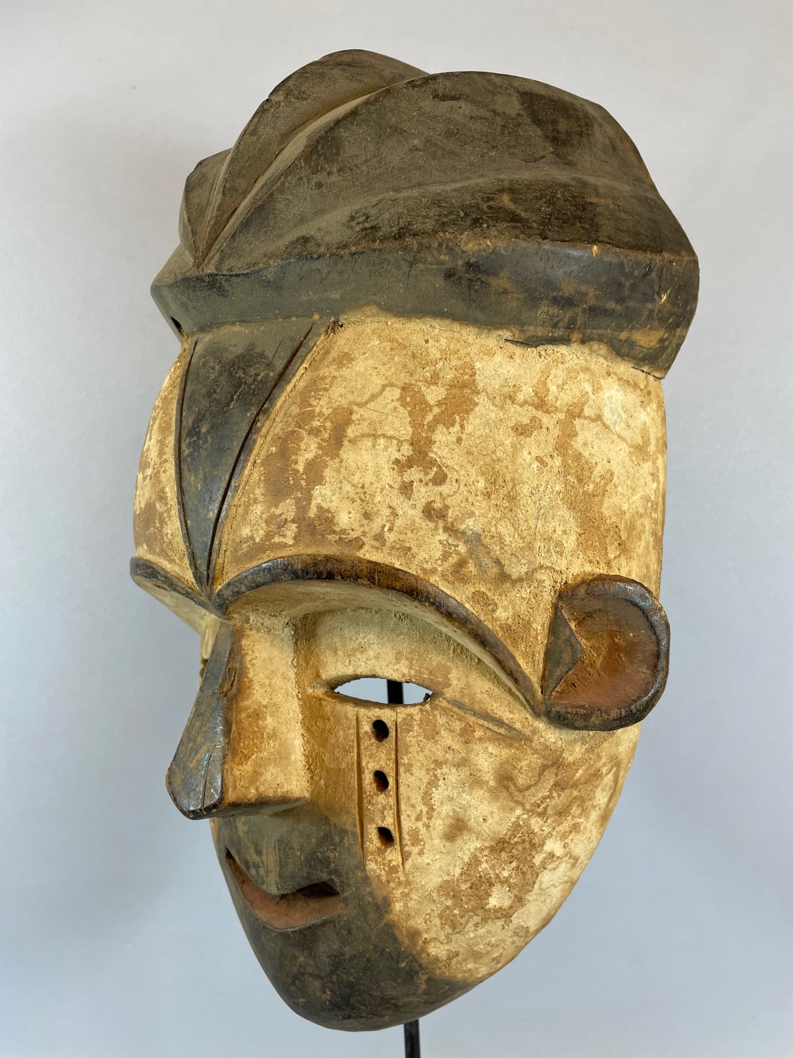 The Galoa people settled in the lakes area, near the Atlantic shore, and carved rectangular masks bearing triangular motifs designed with pigments. These masks are worn during important ceremonies such as the death of a prominent chief or the birth of twins. Through the power and authority believed to be inherent in them, the bearer of the mask can regulate the social life of the Galoa villagers.