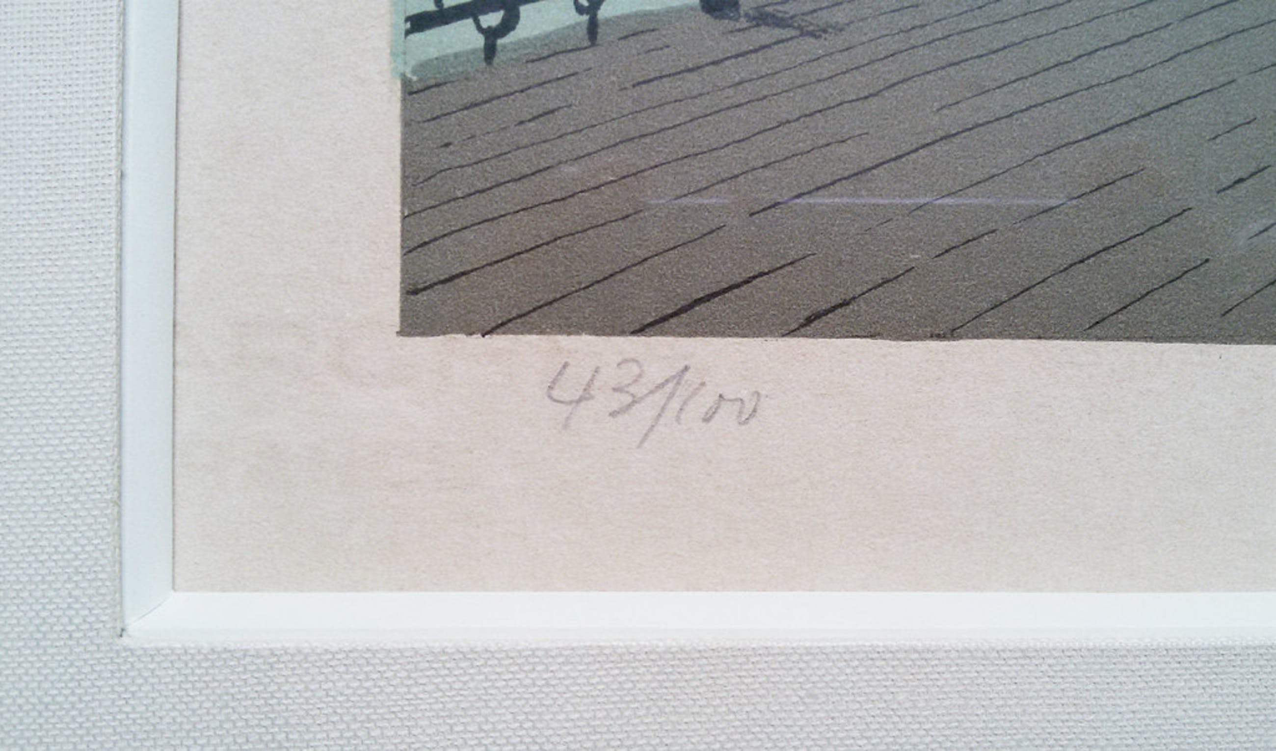 Mooi, herkenbaar werk van deze Belgische kunstenaar. Litho op Arches papier, met potlood gesigneerd, getiteld en genummerd (43/100). Ingekaderd in zeer solide, aluminium lijst met diep, luxueus passe-partout en achter glas door de firma Schleiper & Fils uit Brussel. In zeer goede conditie.