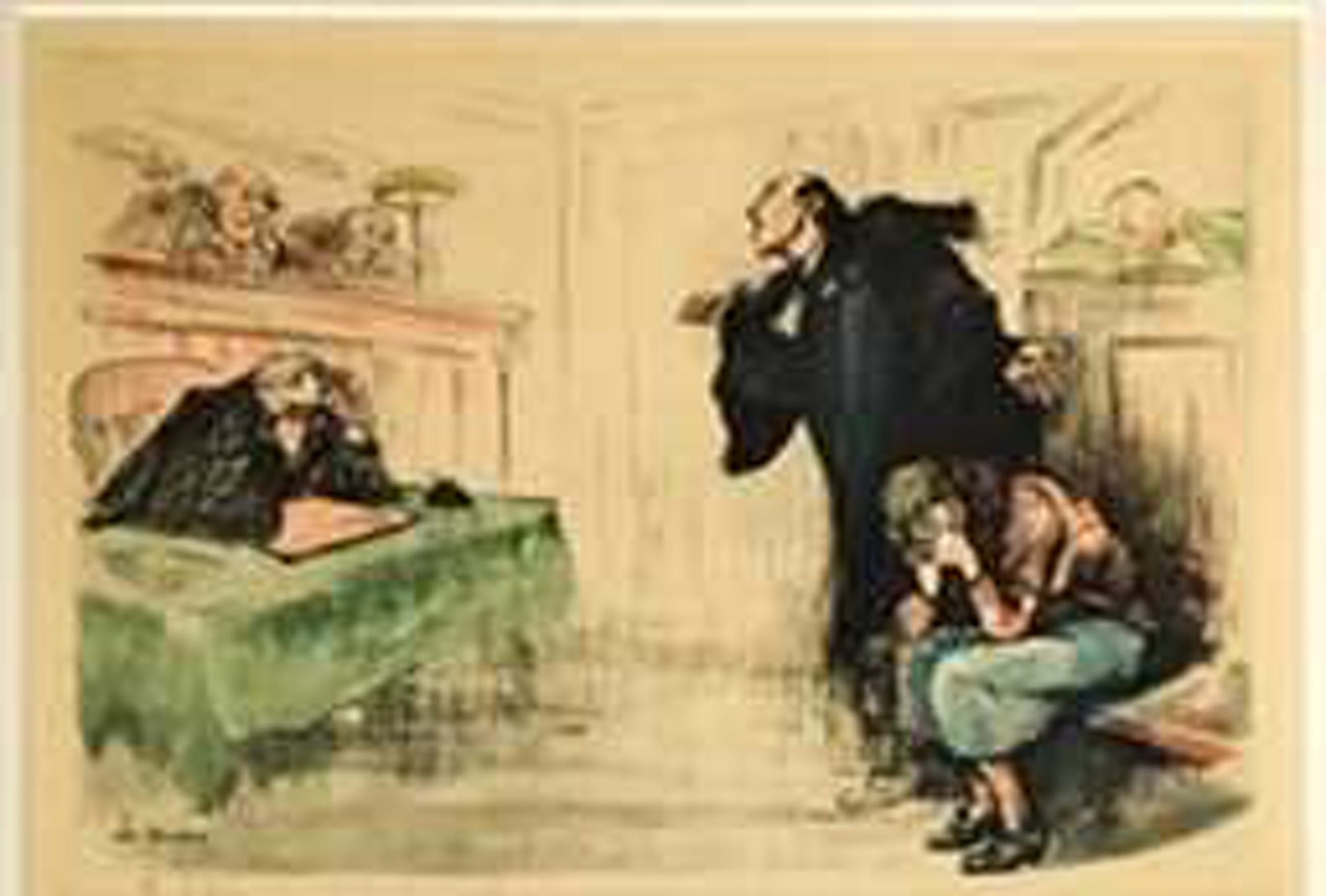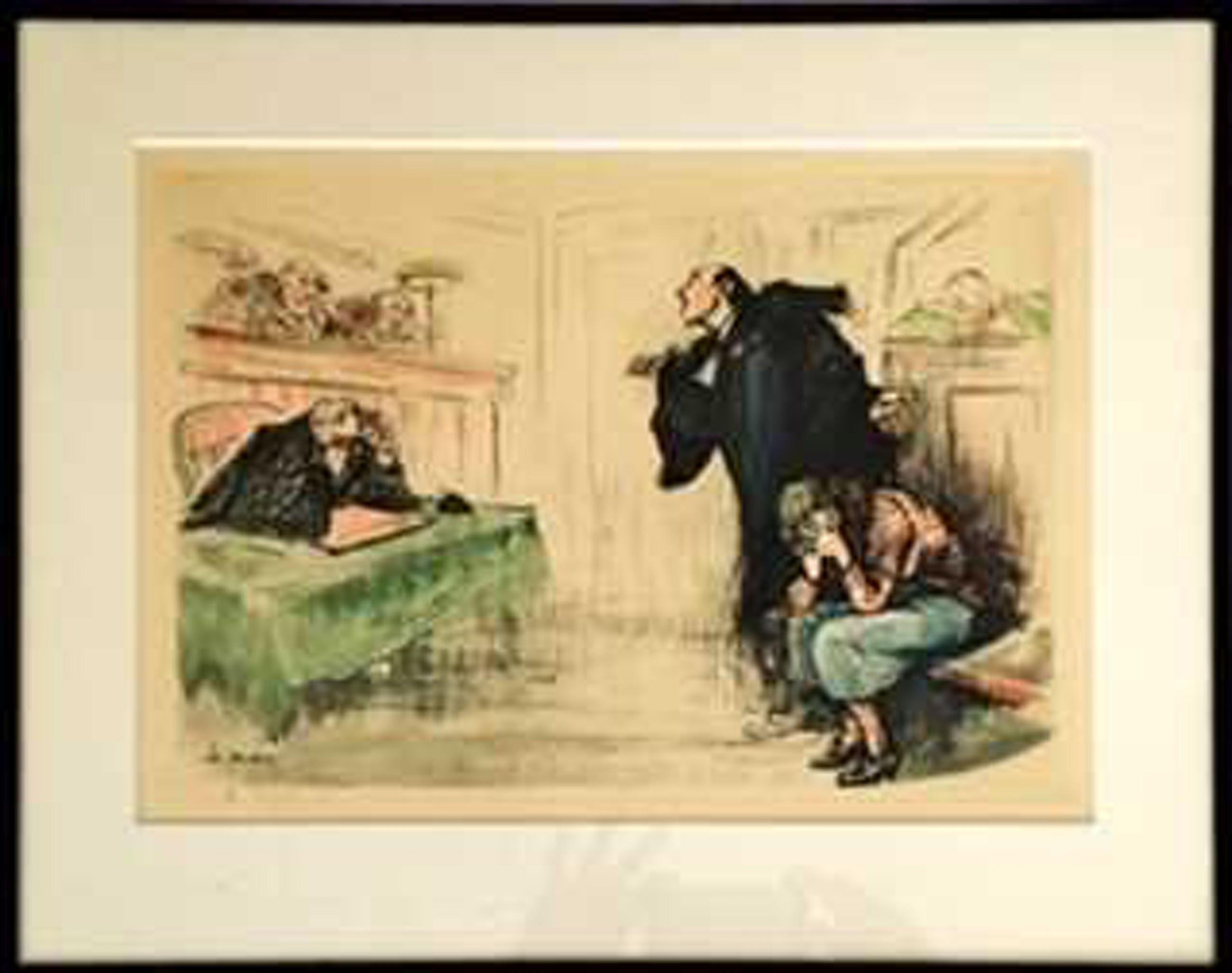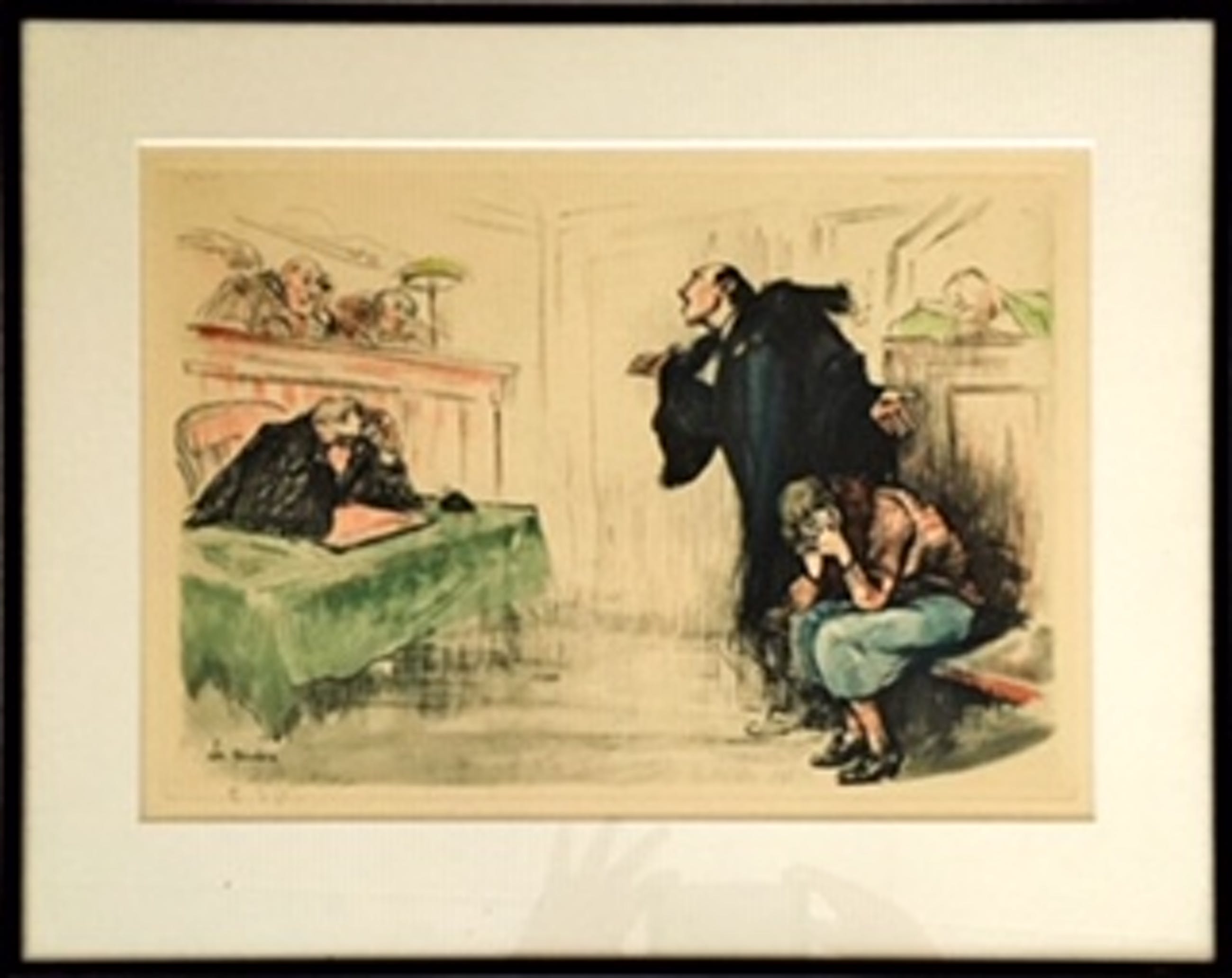 De litho betreft een tafereel in een rechtbank. Er wordt een vurig pleidooi gehouden voor iemand die heel veel spijt lijkt te hebben. Aan het overwegend gebroken wit en zwart, zijn voorzichtig de kleuren rood, groen en blauw toegevoegd. De Litho is ingelijst door een lijstenmakerij in een neutrale, zwarte lijst die onbeschadigd is.