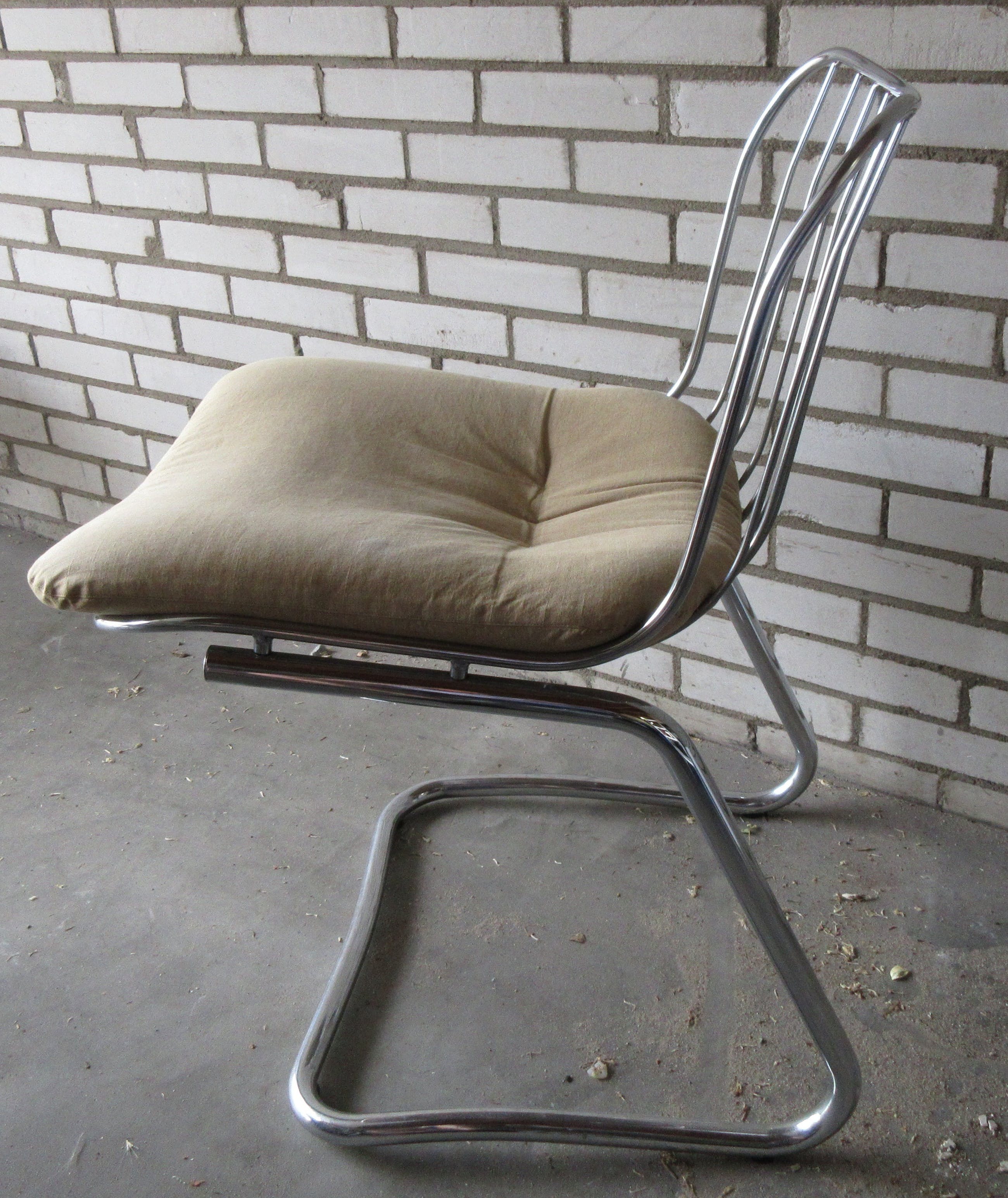 Twee draad metalen eetkamerstoelen voor Rima / Roche Bobois ontwerp Gastone Rinaldi in de jeren´60. De twee stoelen zijn in redelijke conditie, bij een stoel is een stukje draadstaal los. De ander heeft vier opnieuw gelaste stukken draadstaal. Voorzien van originele bekleding met en creme witte hoes welke niet origineel is. De meeste van de hoezen zijn in goede gebruikte conditie, een enkele heeft wat slijt plekjes. De stoelen zijn niet gemerkt maar zijn gemaakt bij Roche Bobois, de exclusieve Franse design meubelzaak waarvan in Nederland in ieder geval een vestiging is in Amsterdam en was in Rotterdam.