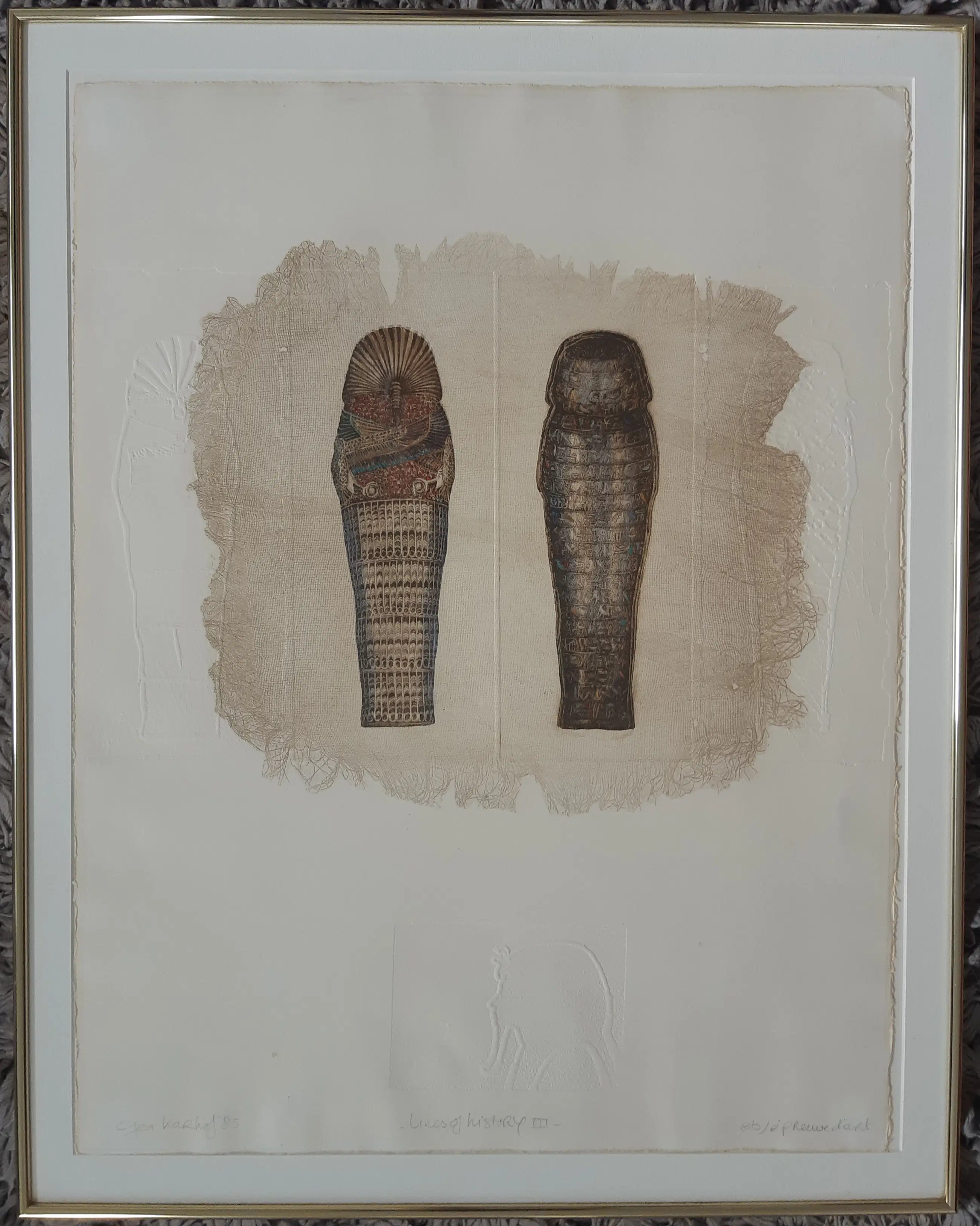 Prachtige zeer gedetailleerde met de hand ingekleurde ets, met blinddruk. Met de hand gesigneerd en gedateerd, voorzien van titel en annotatie épreuve d'art. Ingelijst in goudkleurige aluminium lijst. De conditie is zeer goed, de uiterste rand van het blad is vergeeld (zie foto's).