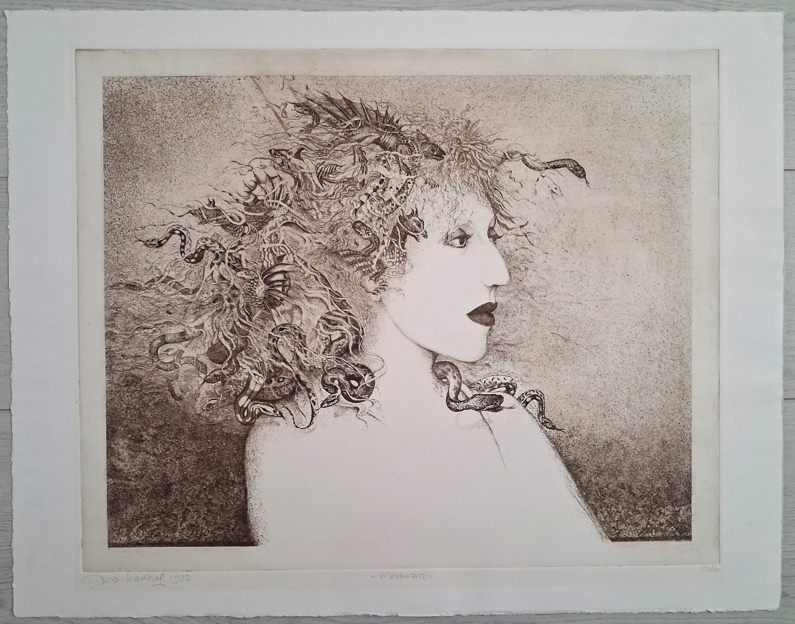 Prachtige gedetailleerde ets van Gea Karhof. Met potlood gesigneerd, gedateerd, genummerd en van titel voorzien. De afbeelding (plaatmaat) is 43 x 54 cm. De conditie van de ets is uitstekend.