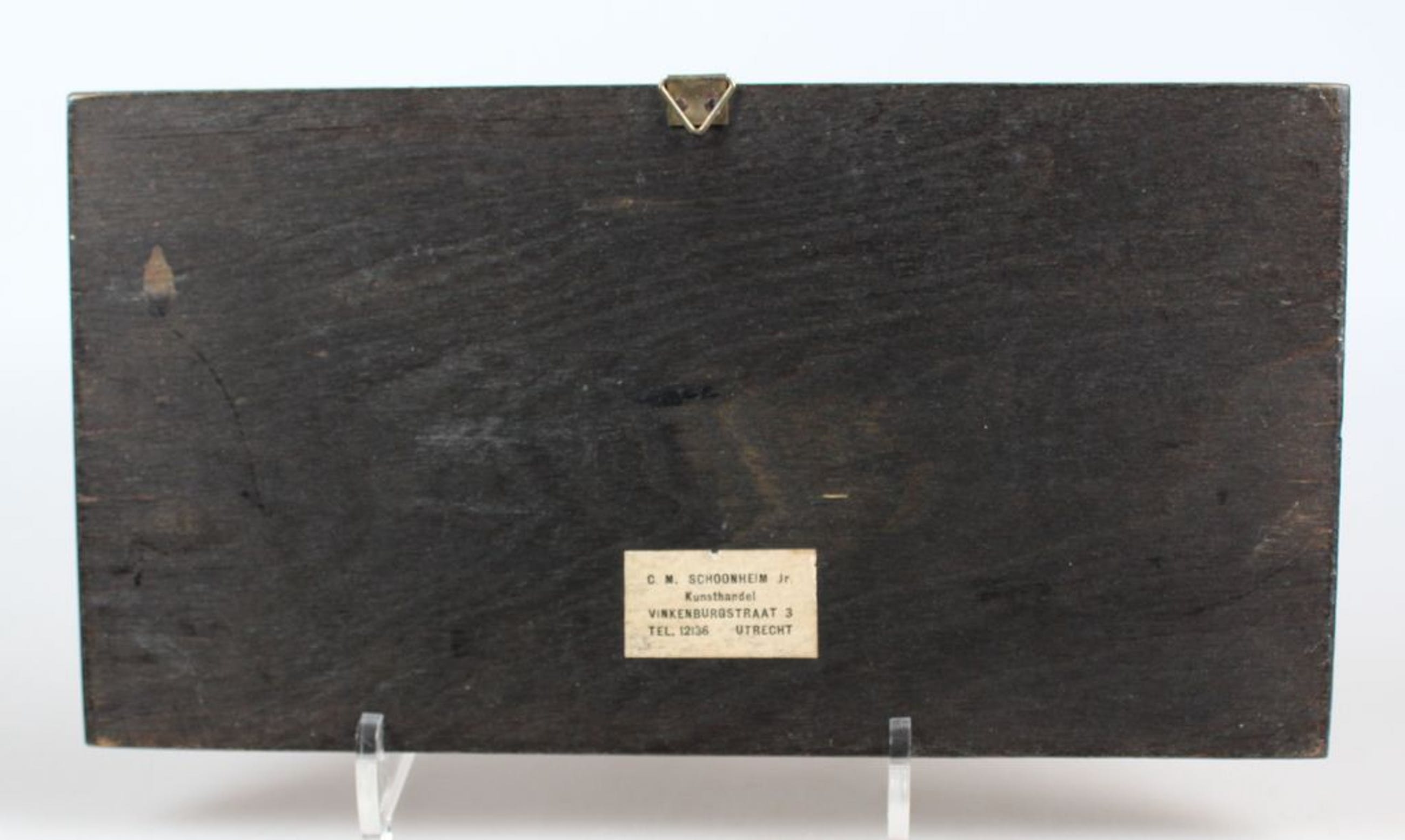 Gebrandschilderd art deco houten plankje met afbeelding van boerderij. 22 x 11,5 cm. Prima staat, minimale leeftijdssporen, zie foto's. Kan binnen Nederland eventueel als brievenbuspakket worden verzonden (4,25).