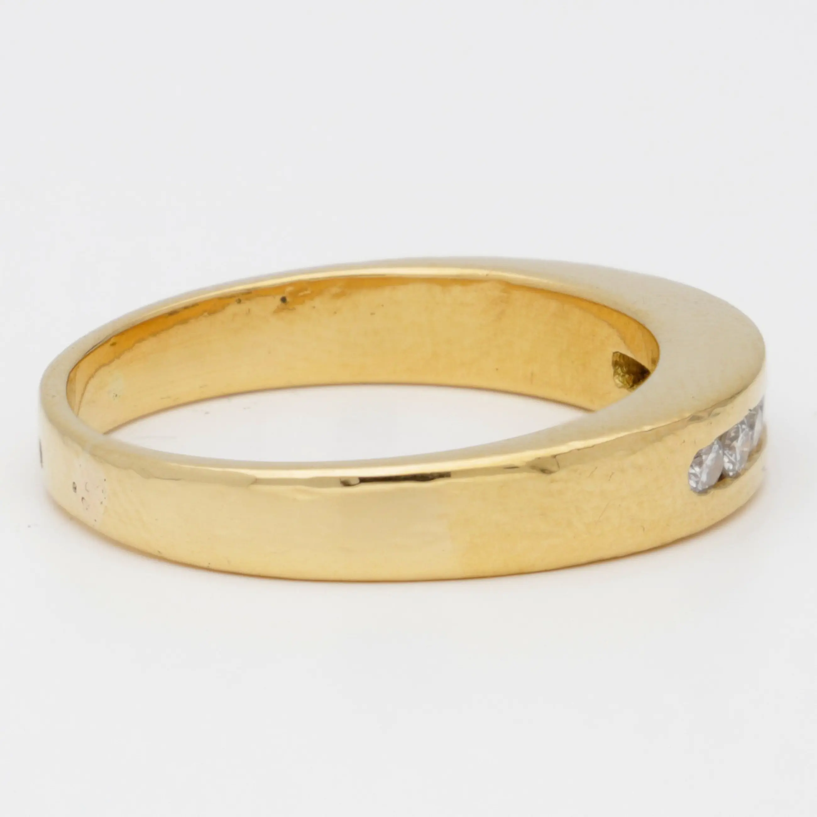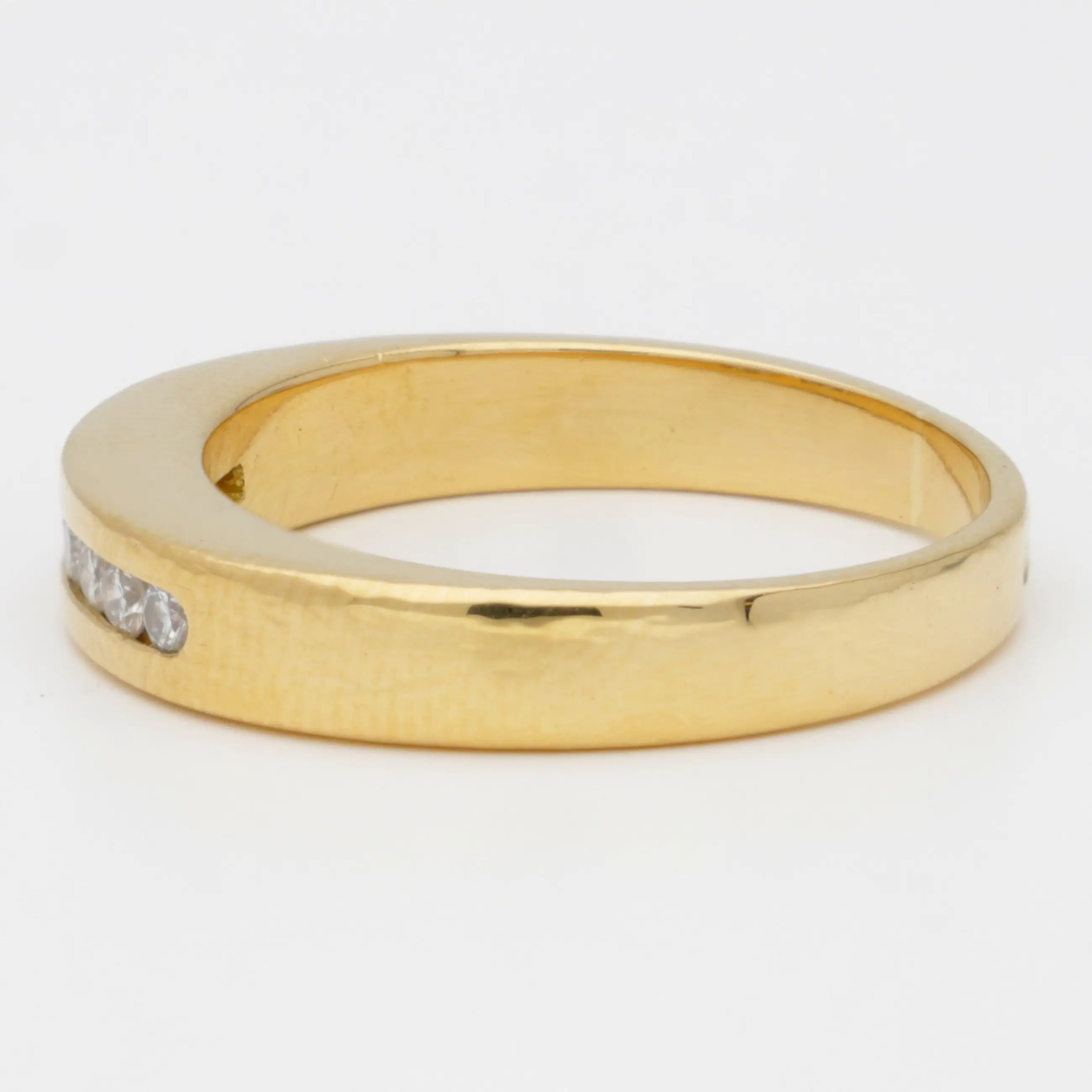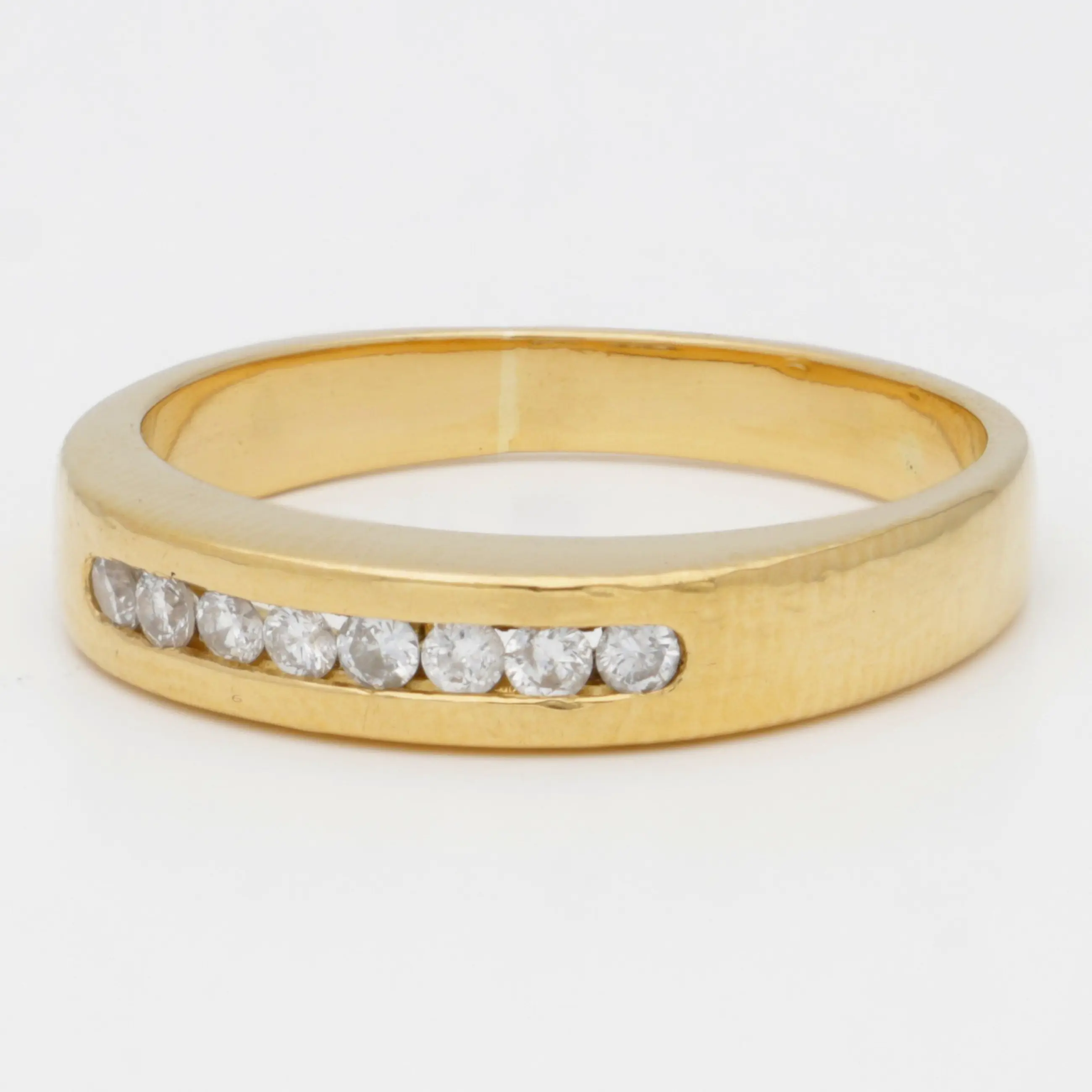 Geelgouden rij ring bezet met 8 briljant geslepen diamanten van totaal ca. 0.16 ct. De diamanten zijn gezet in een span zetting.