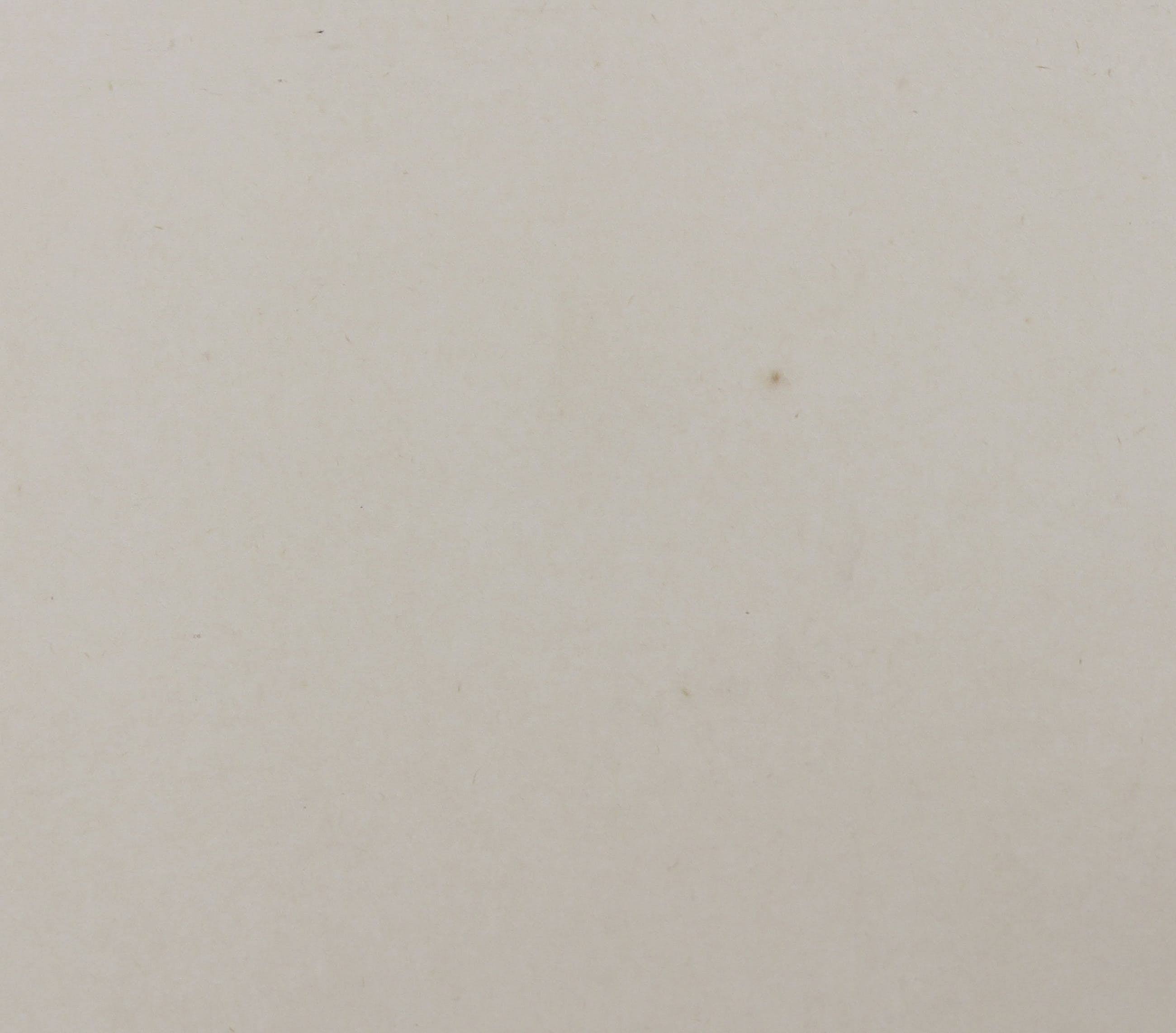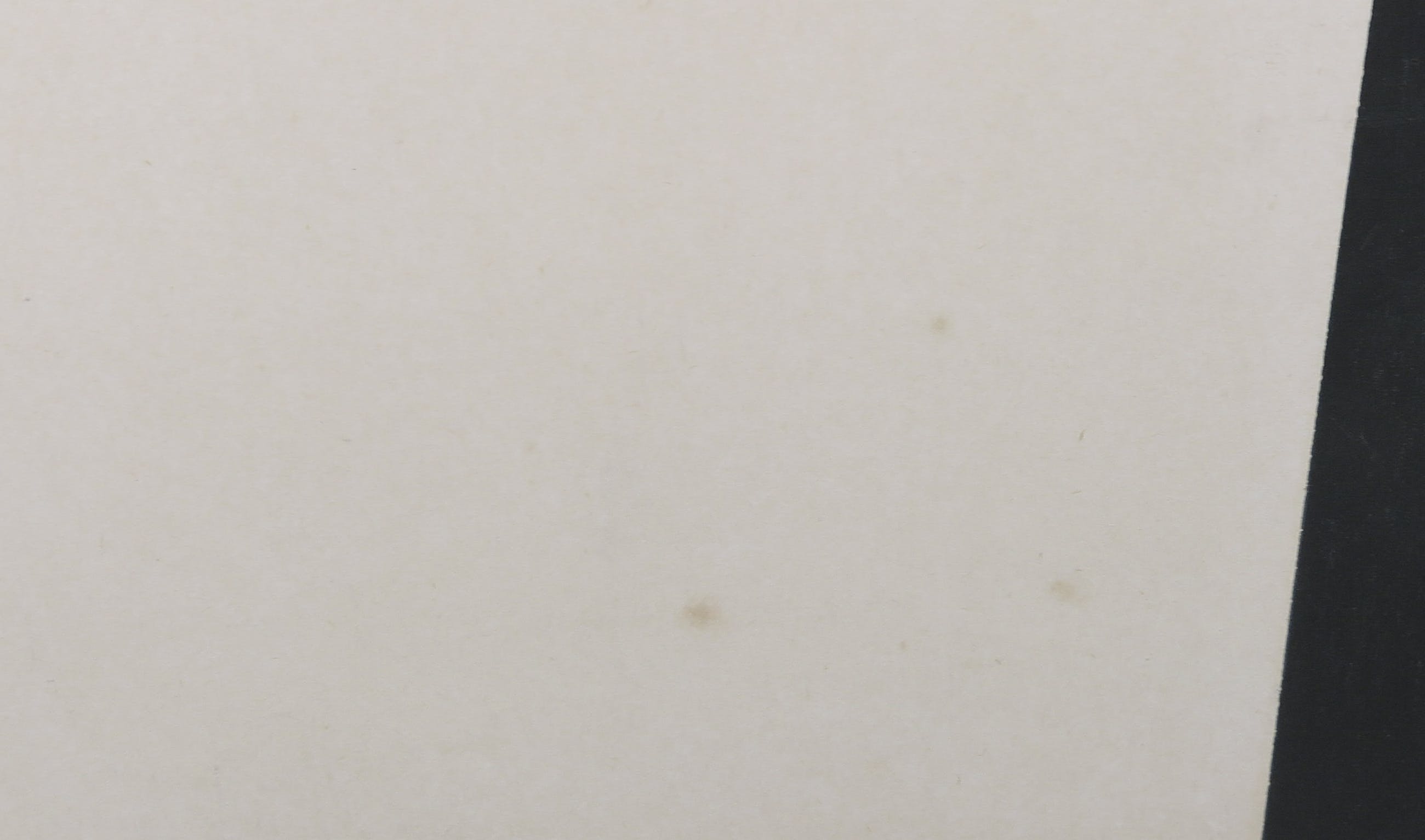 | Het blad is licht verkleurd en heeft een aantal oxidatievlekjes. Verder wat zwarte veegjes. Let op: glasplaat ontbreekt. Het blad is verlijmd op een onderblad. | |