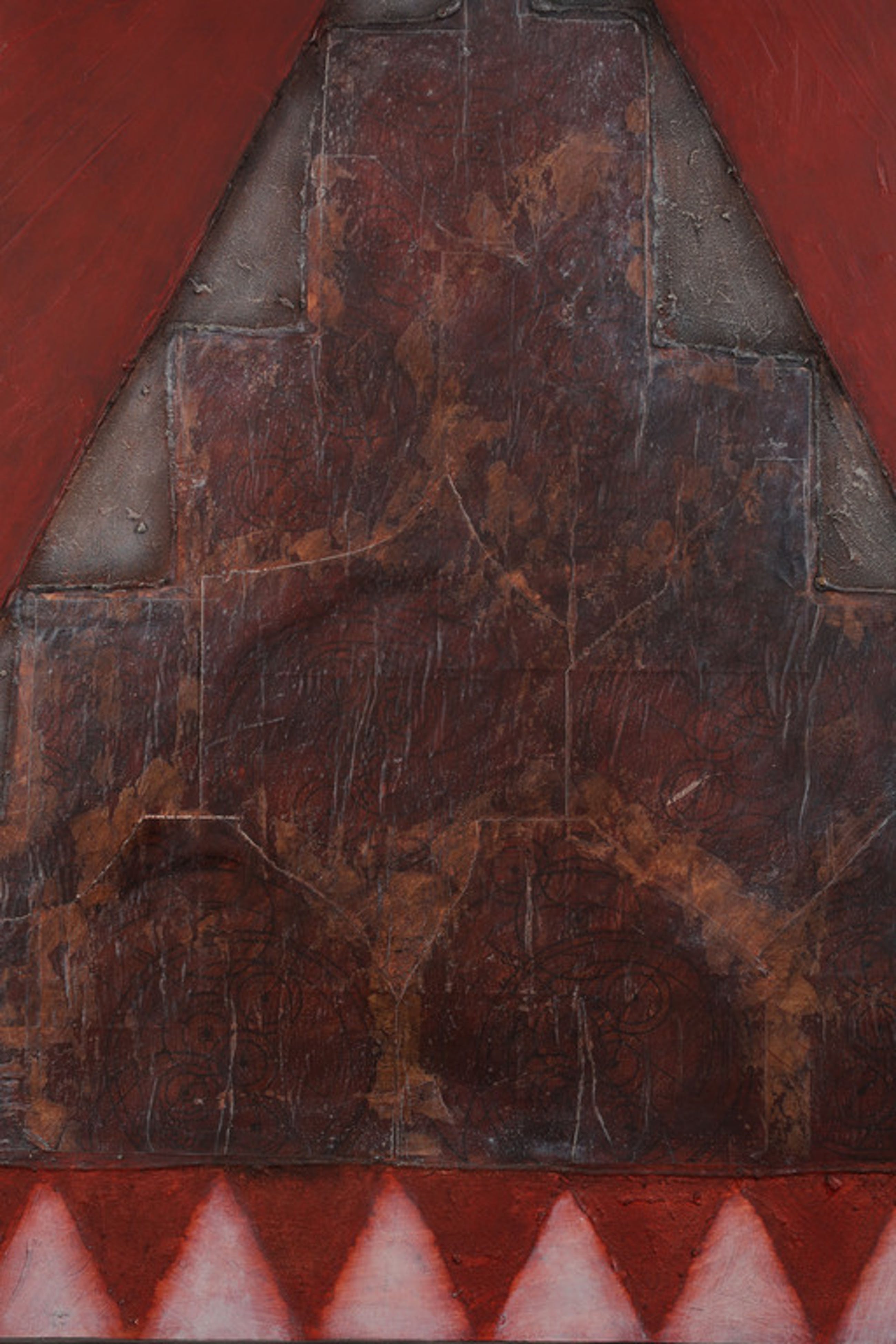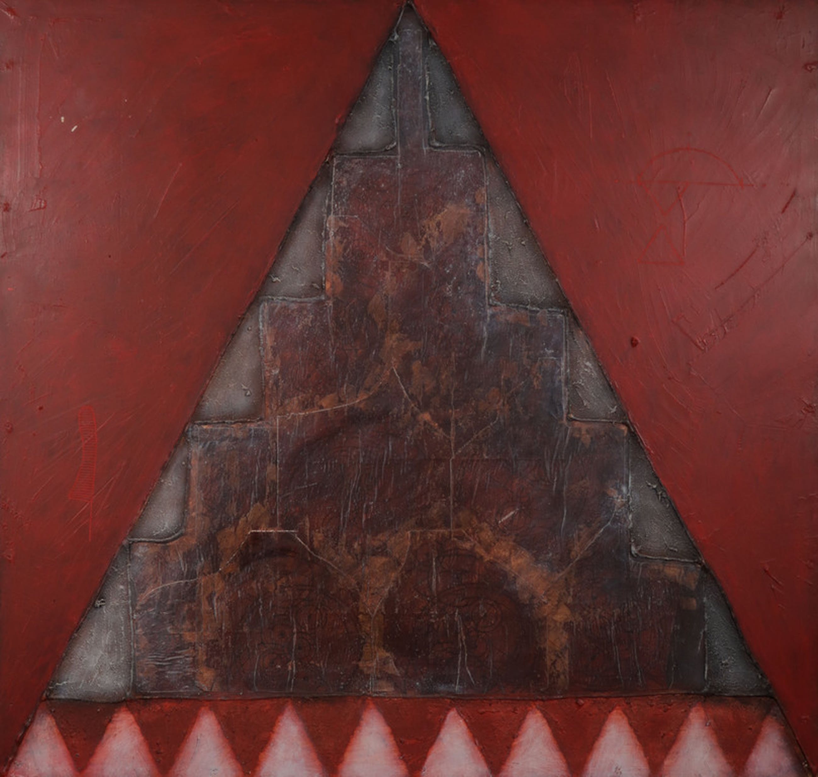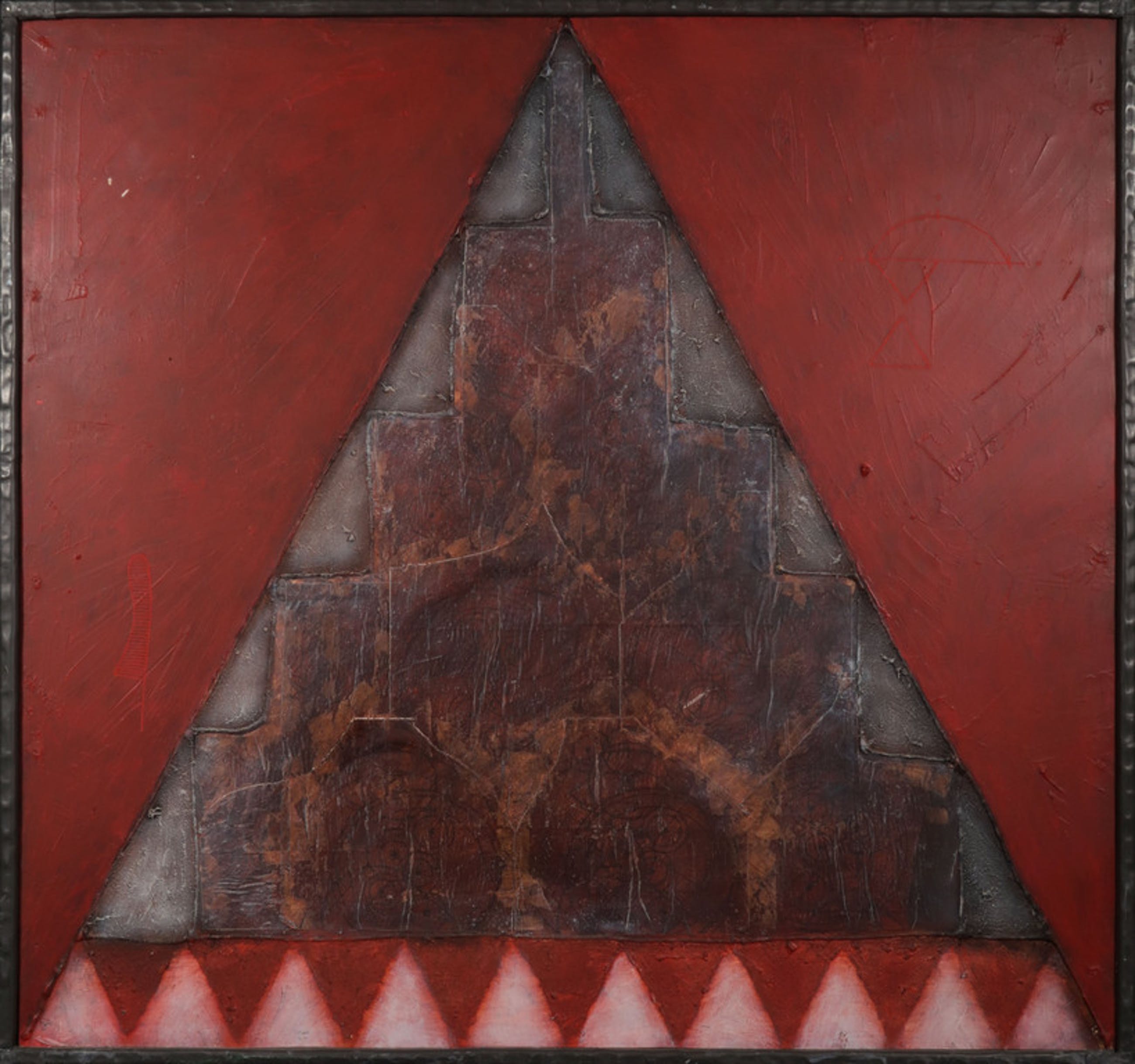 Conditie kunstwerk: In goede staat. Met enkele lichte beschadigingen in de verflaag linksboven. Twee van de opgeplakte delen (in de piramide) laten licht los van de ondergrond.