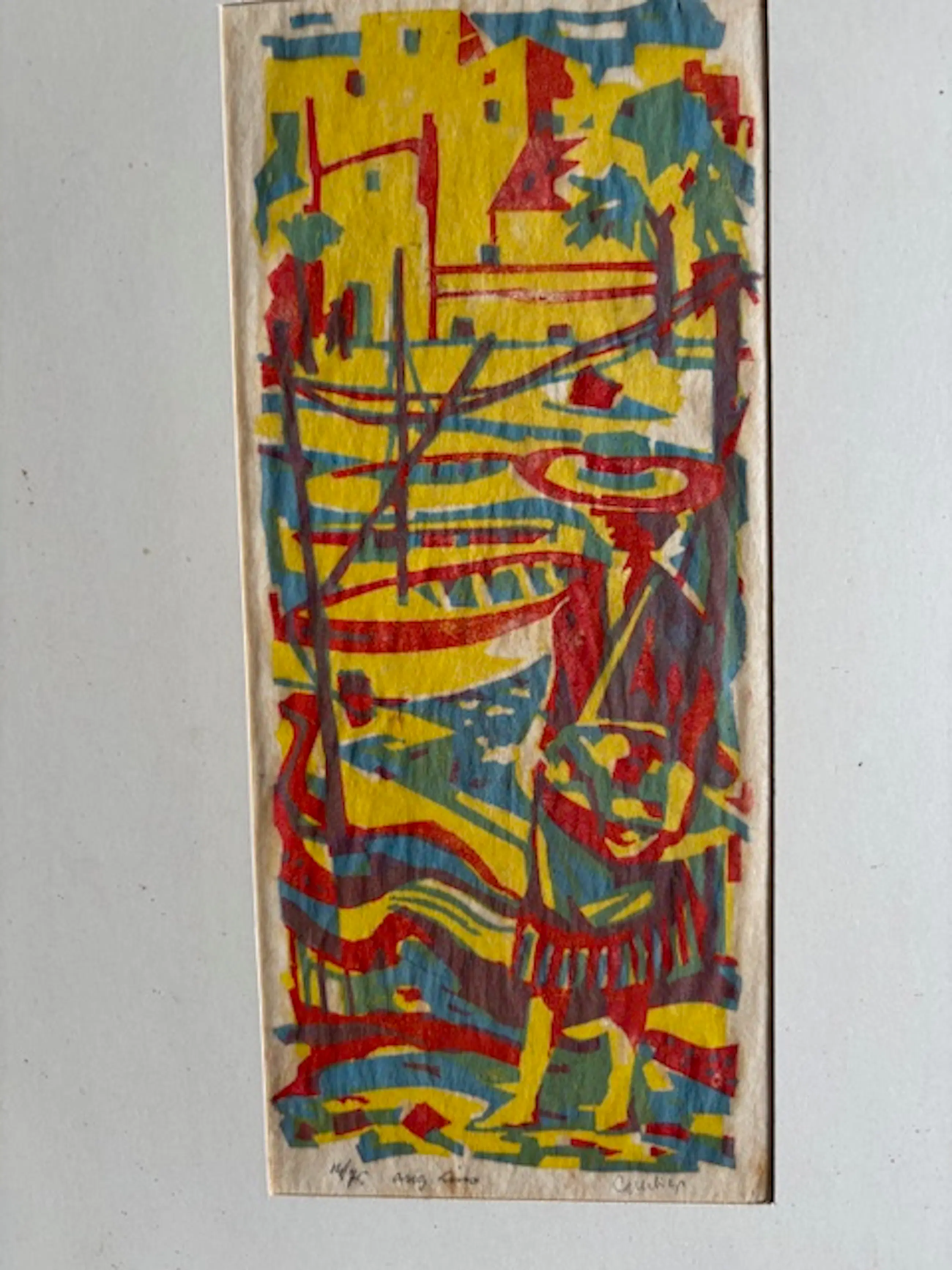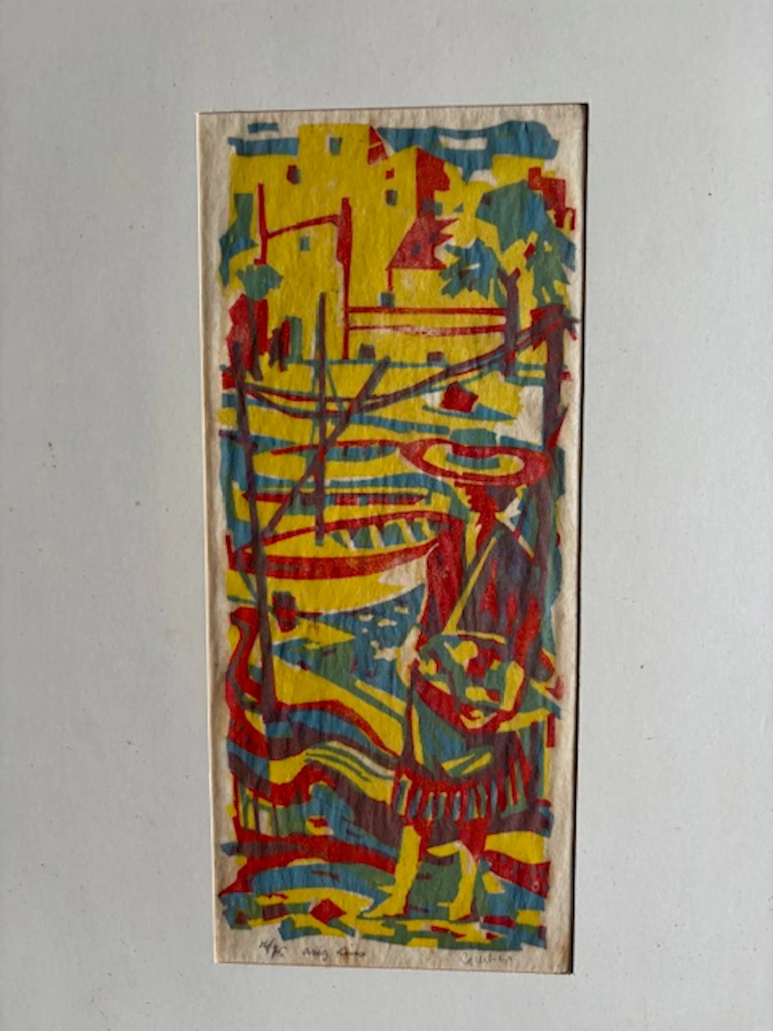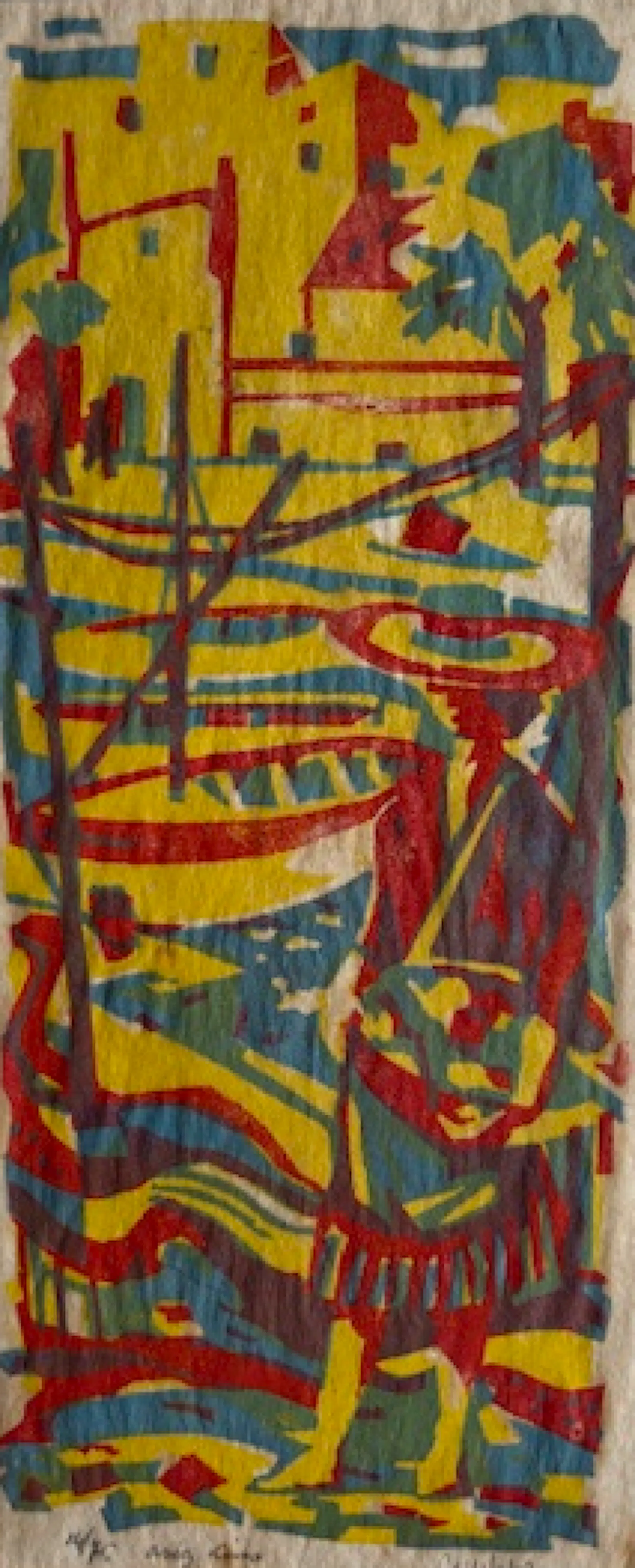 Een figuur op de kade, een visser in een bootje of een wandelaar in een bergstadje. Geert Geerligs laat zijn kleuren dansen.