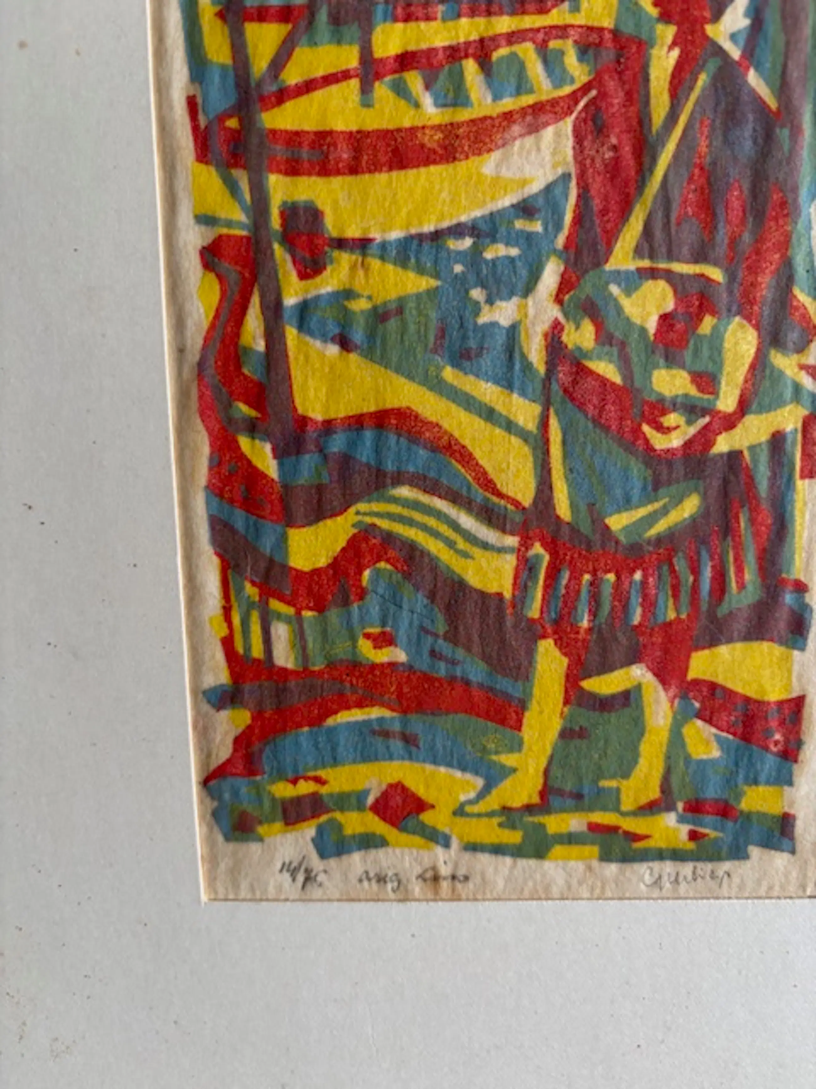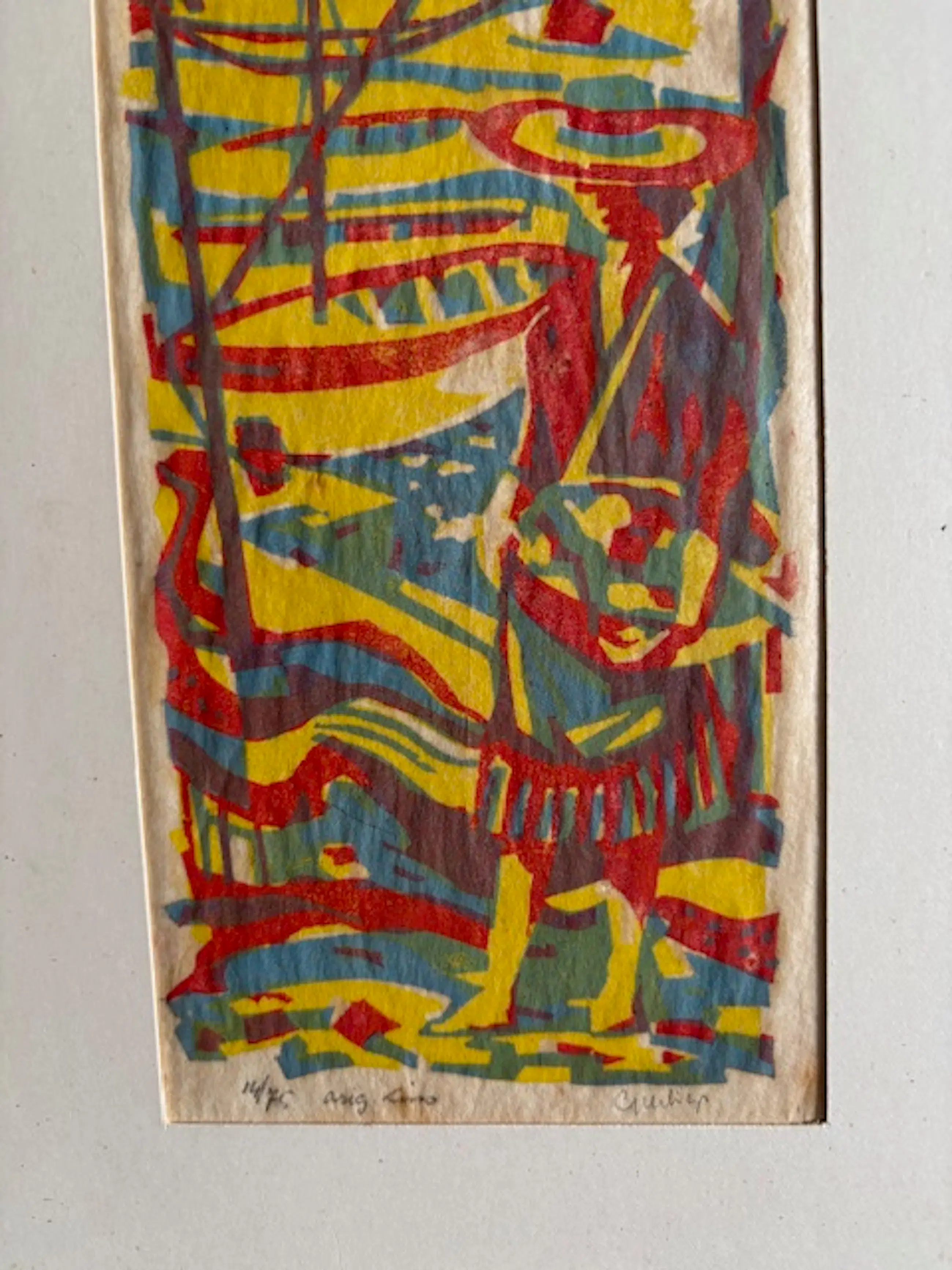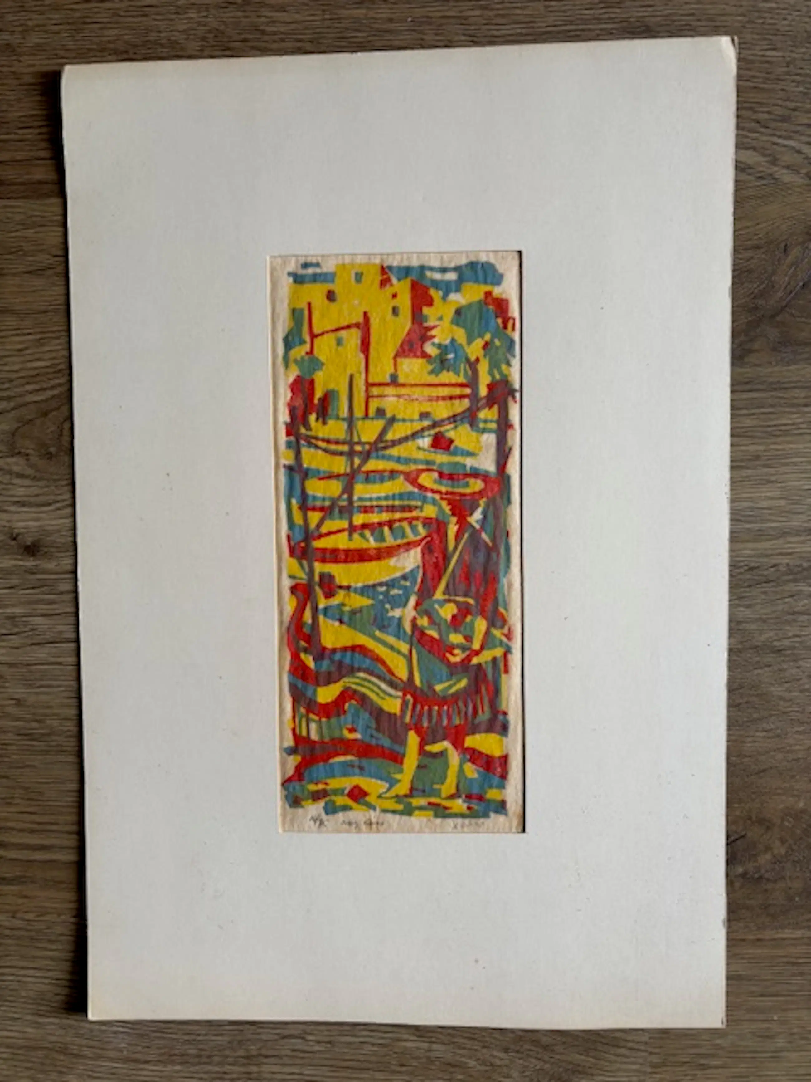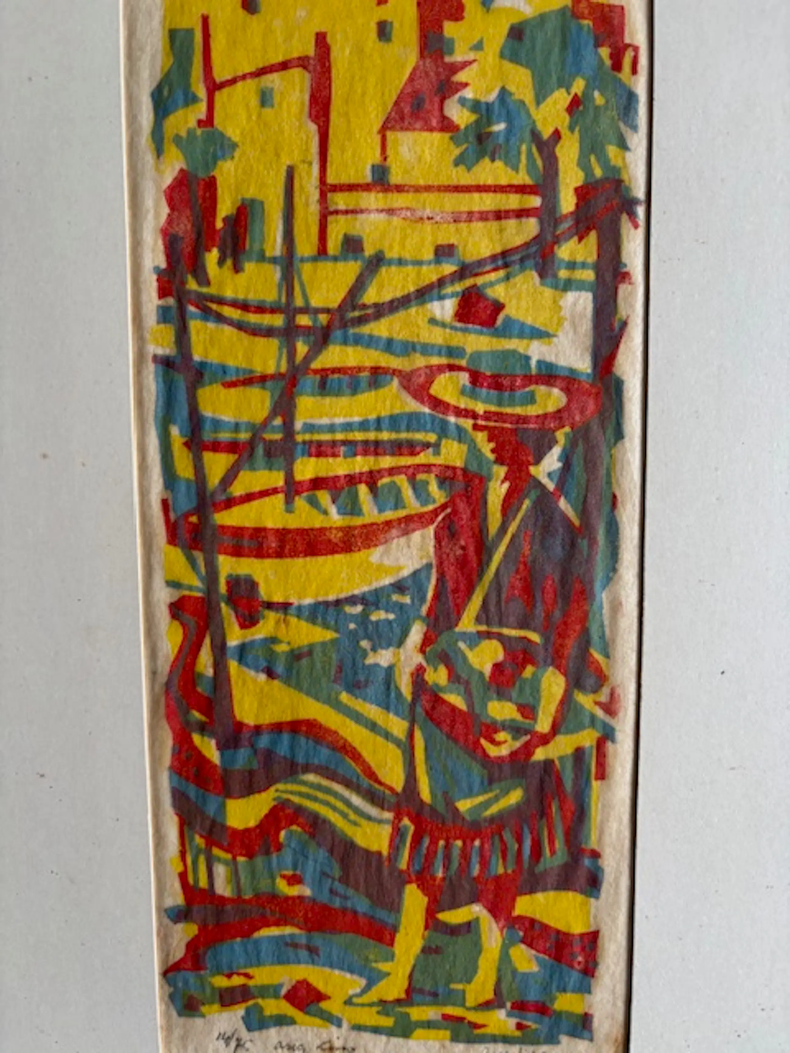 Een figuur op de kade, een visser in een bootje of een wandelaar in een bergstadje. Geert Geerligs laat zijn kleuren dansen.