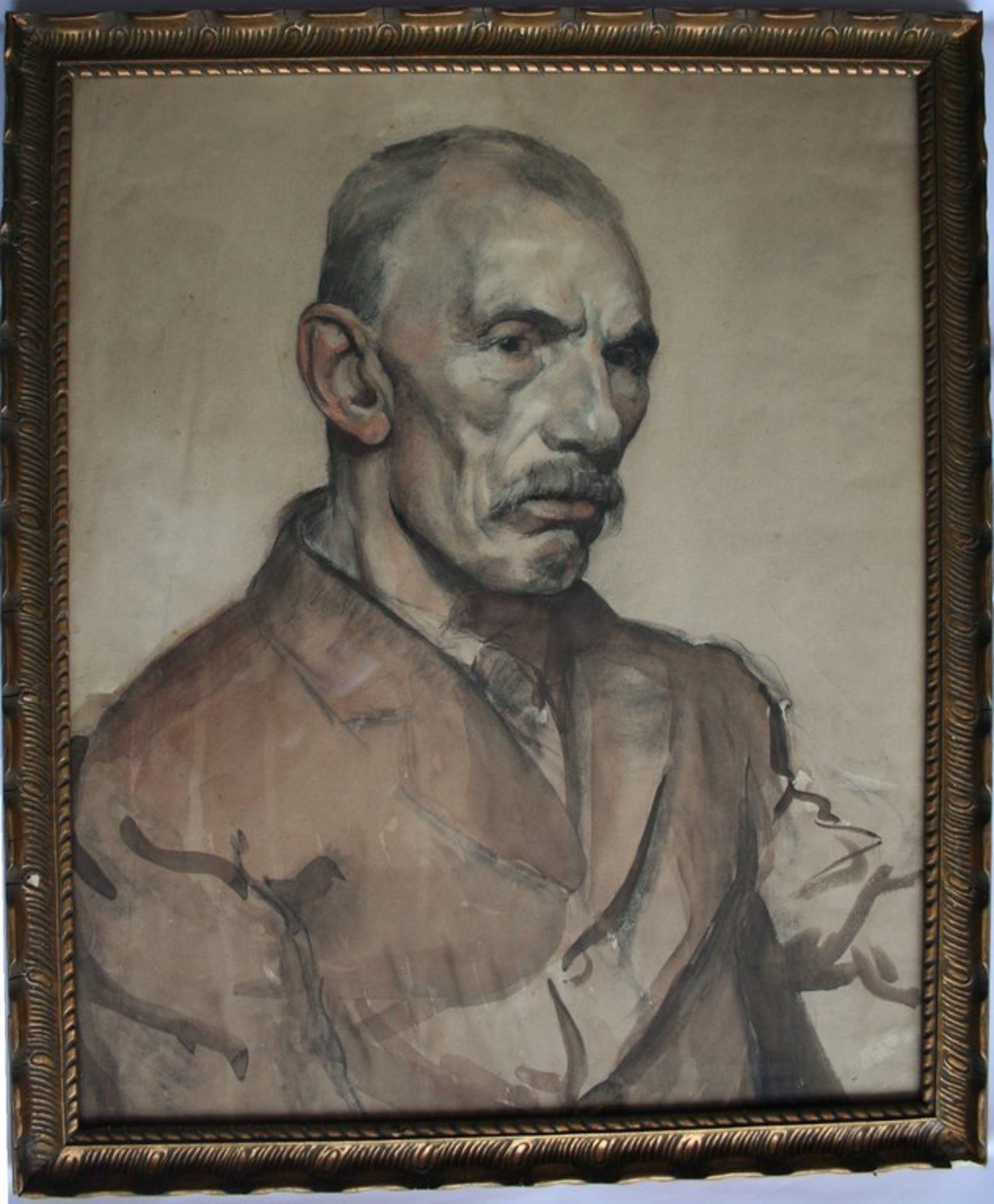 Dit origineel werk van Grauss is gemaakt met gemengde techniek, tekening en ingekleurd met aquarel. Een fraai en intens portret van een werkman uit de glasfabriek Bouvy te Dordrecht.