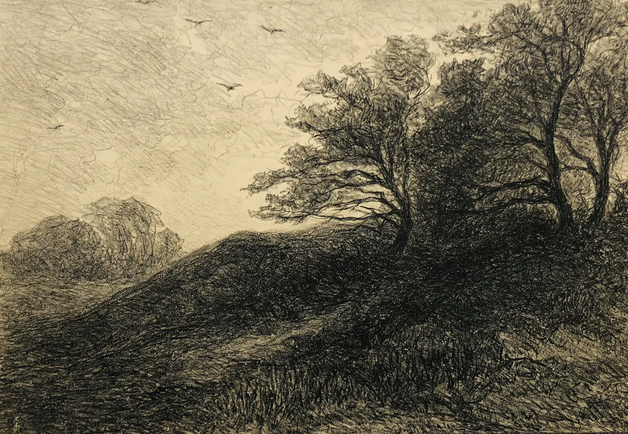 Stemmige lithografie van Carel Nicolaas Storm van 's-Gravesande, leerling van W. Roelofs en Felicien Rops. Het werk is al op leeftijd. De afdruk is in prima staat, de witranden om de prent heen vertonen wat ouderdomssporen.