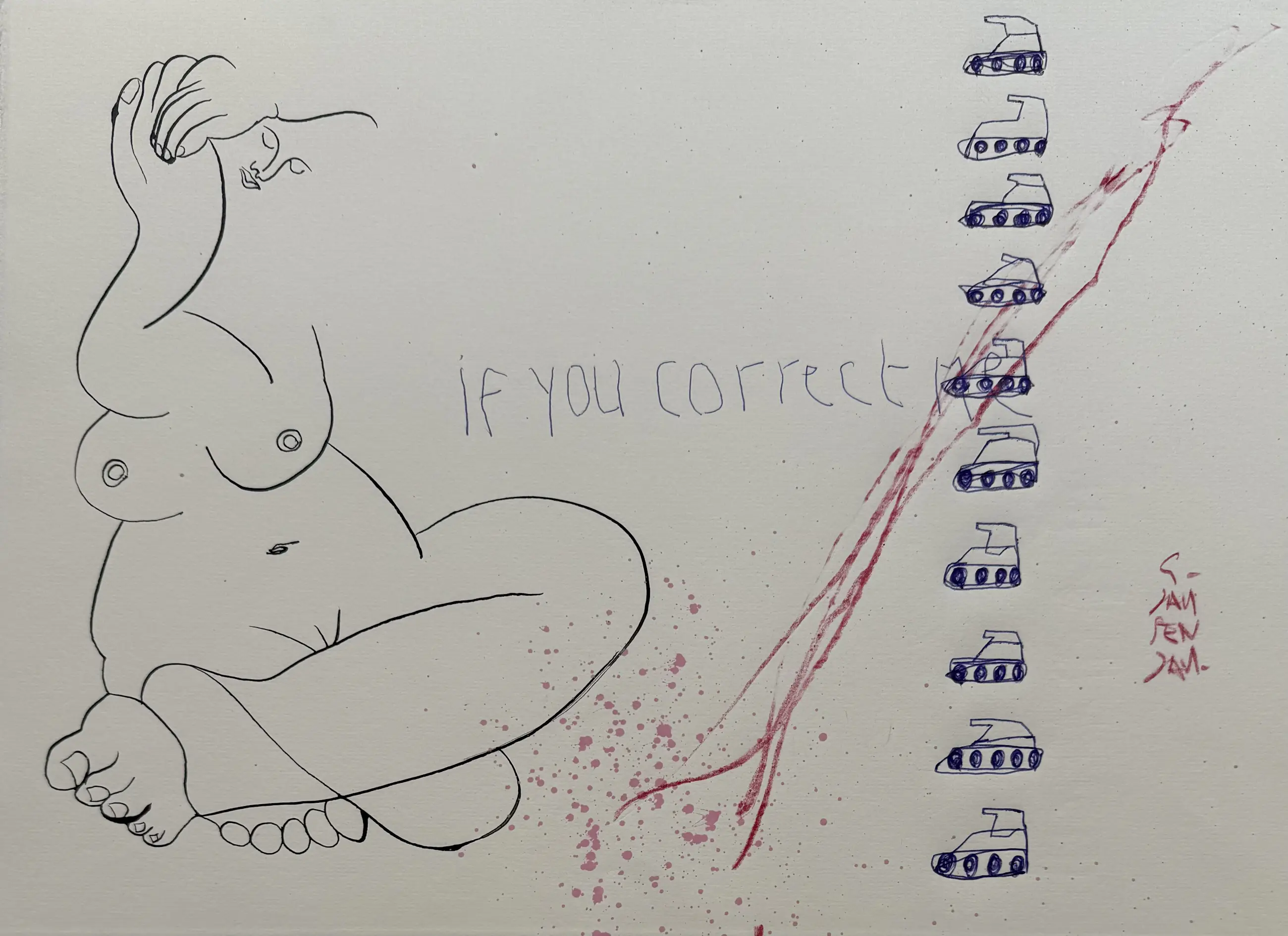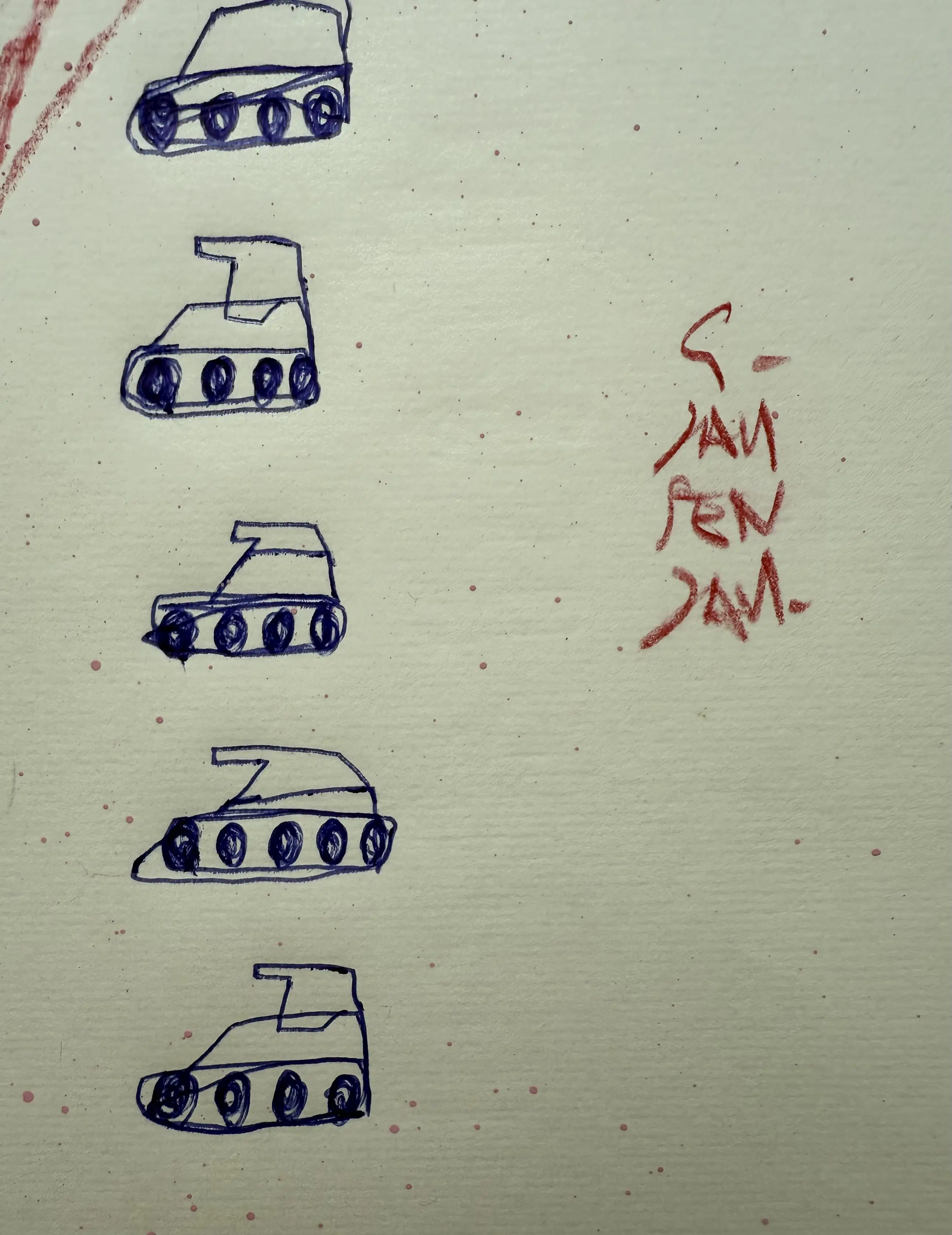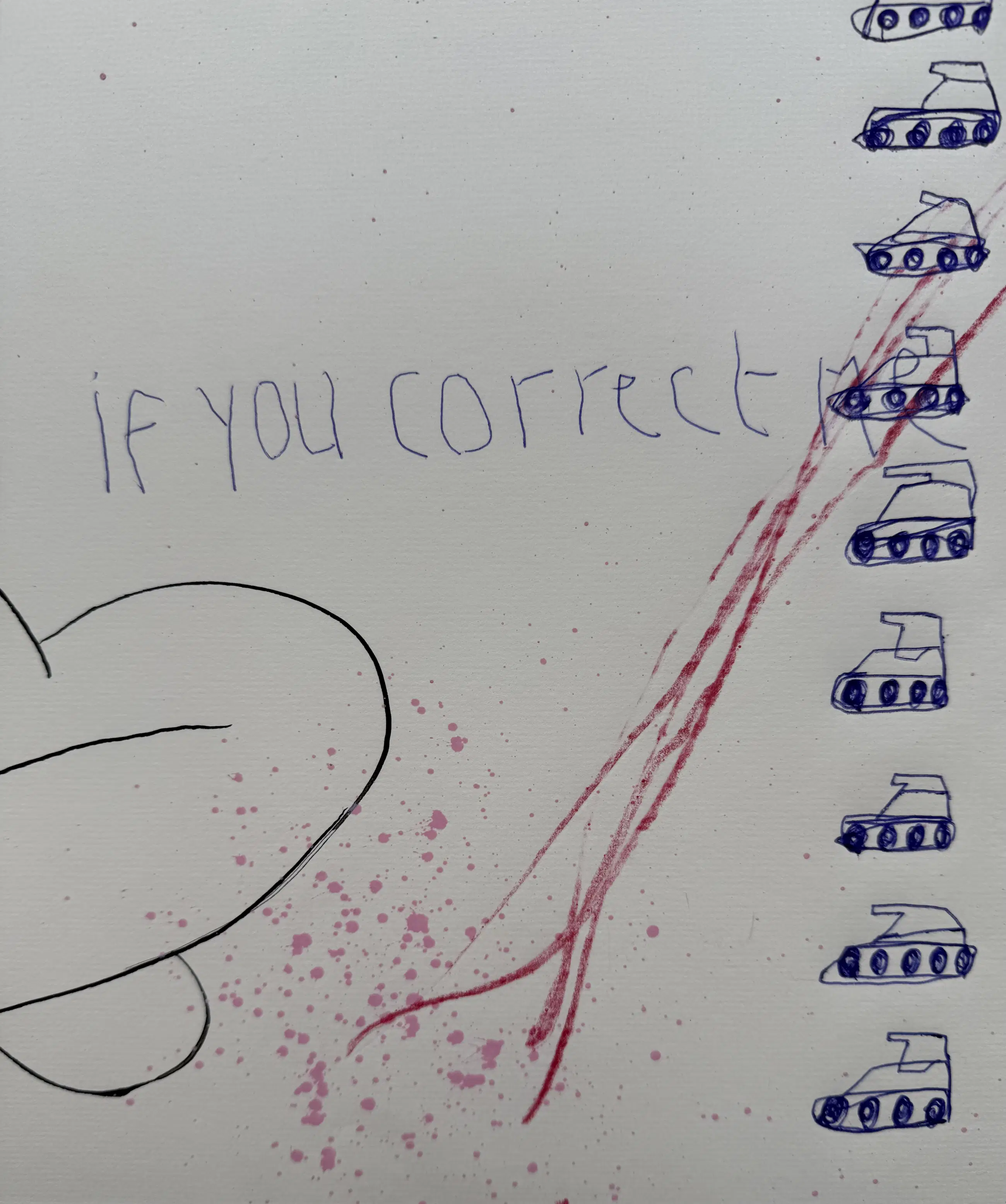 Met snelle bewegingen gaat zijn tekenpen over het papier. ‘Even afkicken’ noemt hij het. Personages en regels tekst doorkruisen het beeld. Alsof er een gevecht gaande is tussen inkt en papier. Op het eerste gezicht zijn het absurde combinaties van losse woorden, getallen, vogels en walvissen. Een regiment speelgoedtankjes trekt voorbij. De vijand wordt bestreden. Tientallen tekeningen liggen op tafel en ze krijgen allemaal een beurt. Na de inkt komt het crayon. Kleurpotloden van Cumberland, Faber-Castell, Karisma, Bruynzeel, Conté à Paris. Dozen vol Afkomstig uit andere ateliers, aangeschaft in andere tijden. En alles in grote aantallen. Chinese rietpennen en het meest exclusieve oliekrijt van Sennerlier. Maar ook ballpoints van de Hema. Als het maar schrijft. En wanneer het niet schrijft, dan krast het wel.