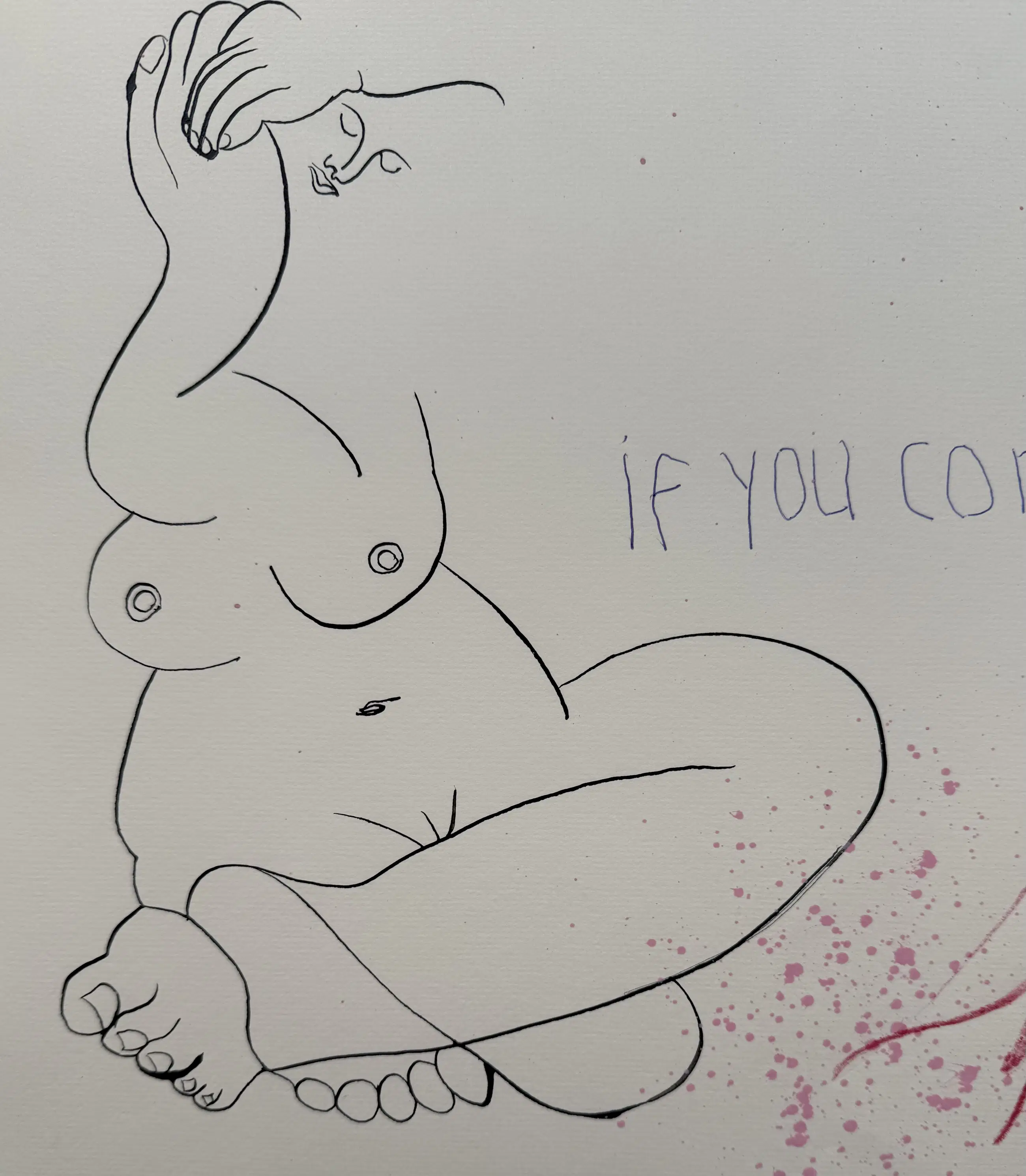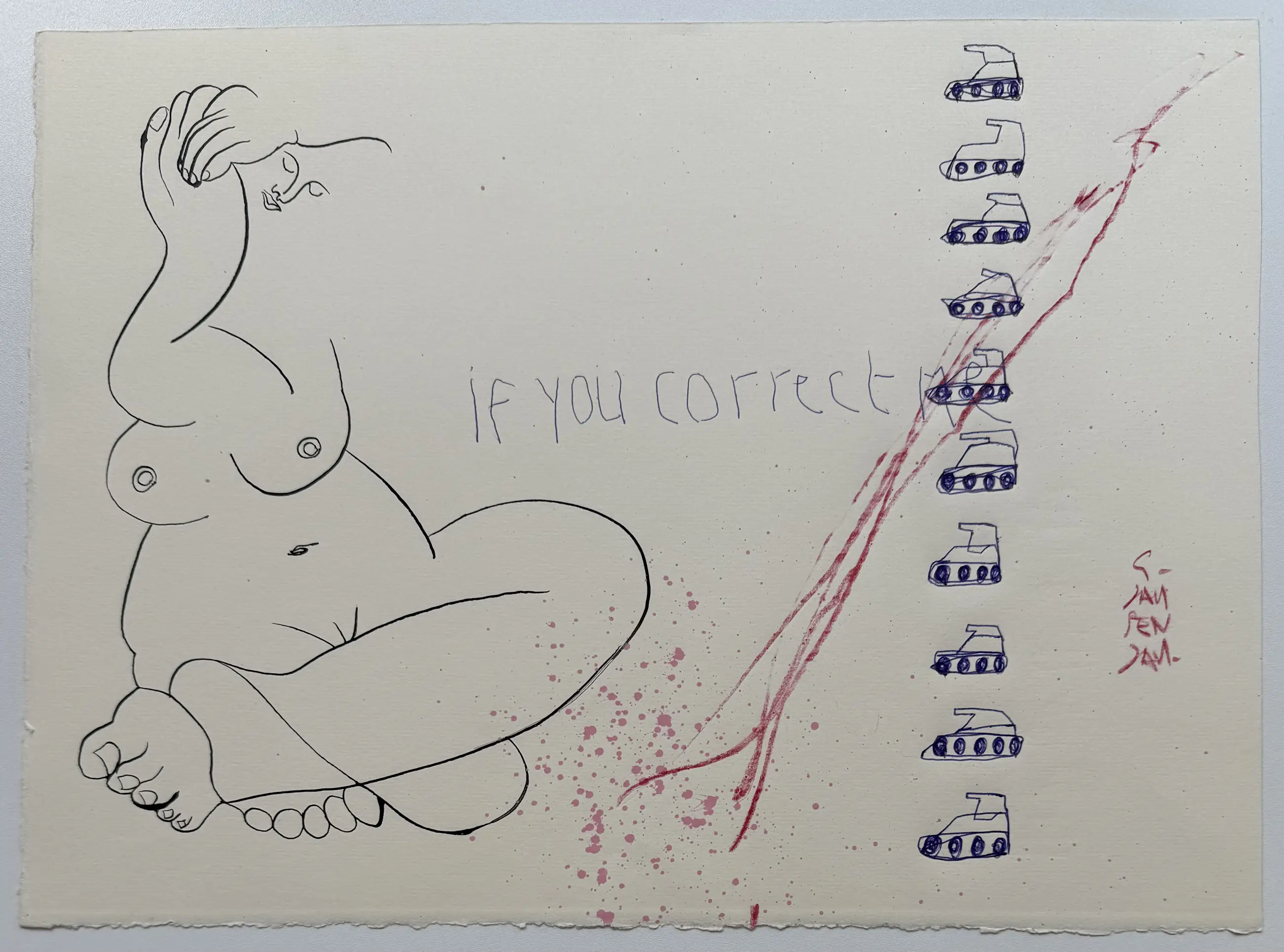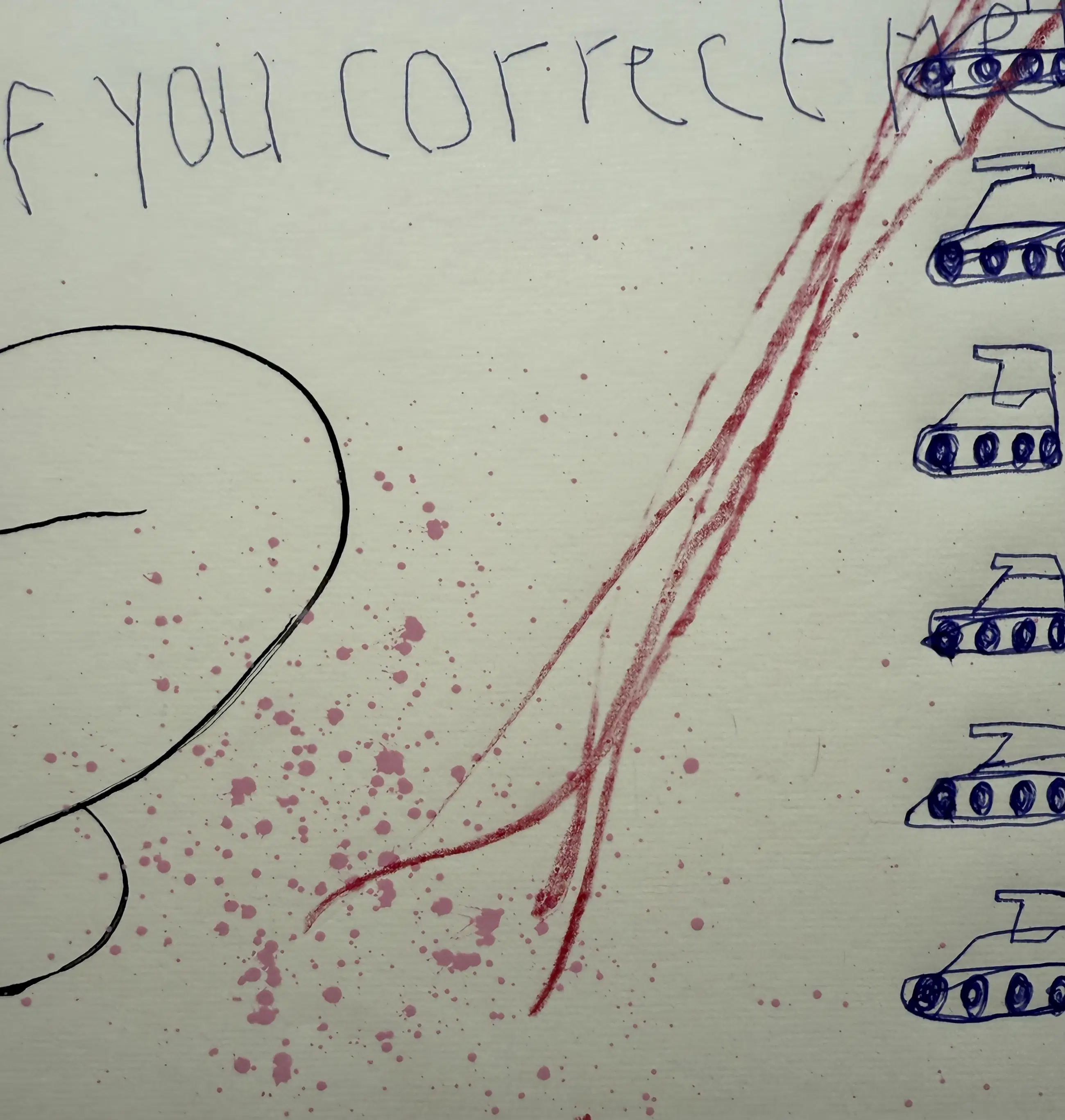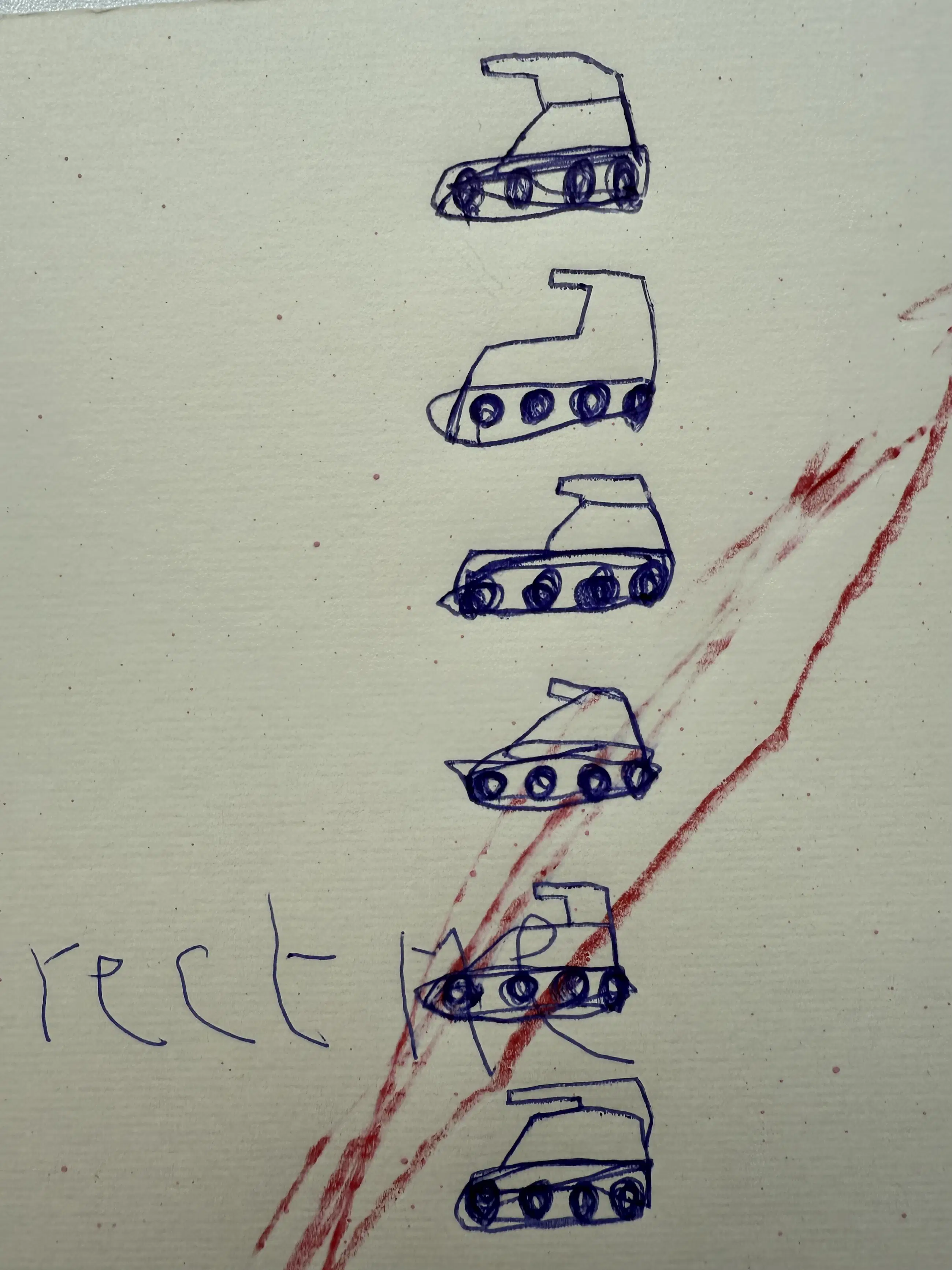 Met snelle bewegingen gaat zijn tekenpen over het papier. ‘Even afkicken’ noemt hij het. Personages en regels tekst doorkruisen het beeld. Alsof er een gevecht gaande is tussen inkt en papier. Op het eerste gezicht zijn het absurde combinaties van losse woorden, getallen, vogels en walvissen. Een regiment speelgoedtankjes trekt voorbij. De vijand wordt bestreden. Tientallen tekeningen liggen op tafel en ze krijgen allemaal een beurt. Na de inkt komt het crayon. Kleurpotloden van Cumberland, Faber-Castell, Karisma, Bruynzeel, Conté à Paris. Dozen vol Afkomstig uit andere ateliers, aangeschaft in andere tijden. En alles in grote aantallen. Chinese rietpennen en het meest exclusieve oliekrijt van Sennerlier. Maar ook ballpoints van de Hema. Als het maar schrijft. En wanneer het niet schrijft, dan krast het wel.