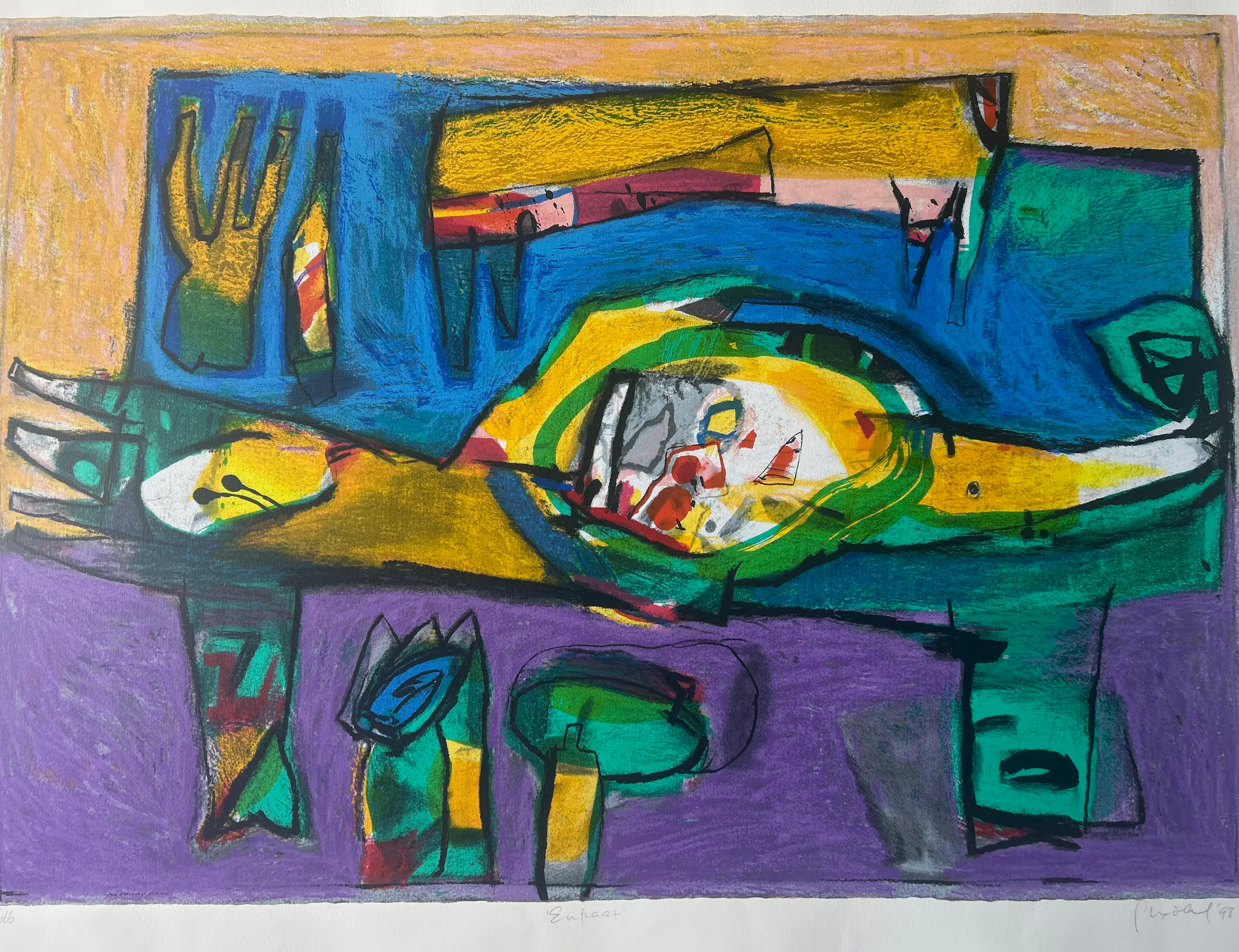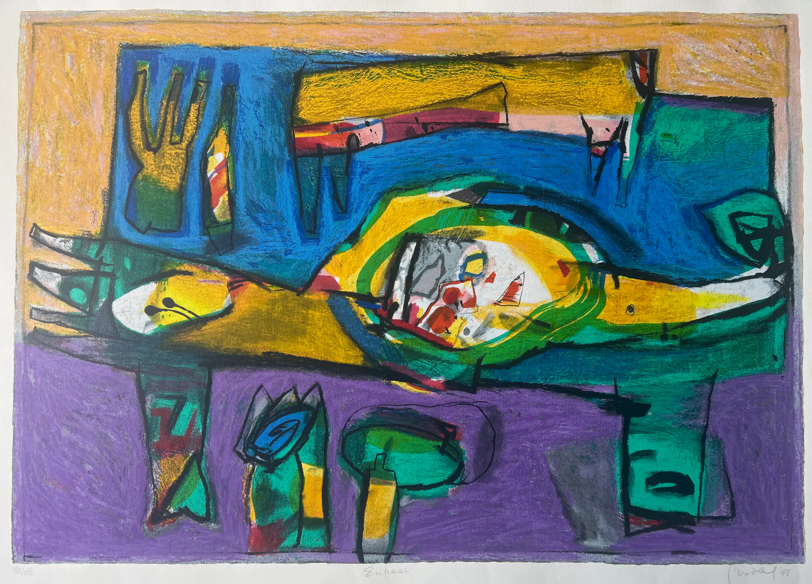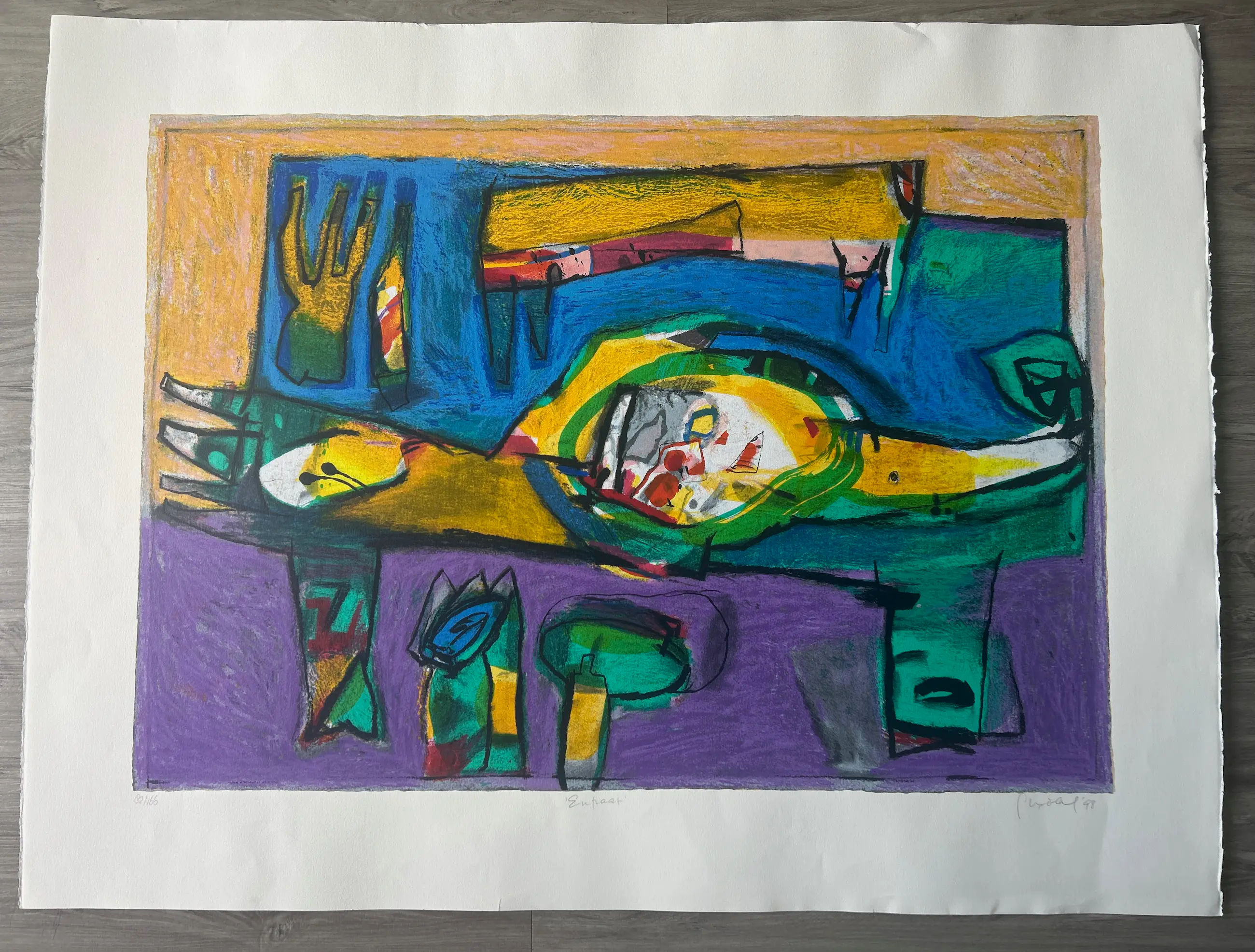 Conditie: zeer goed. Vel heeft lichte deukjes vel rechts en scheurtje 1,5 cm links, zie foto's. Oplage: 82/166. Afmeting: afbeelding 70 x 99 cm. Wordt zorgvuldig verpakt en verzekerd verzonden.